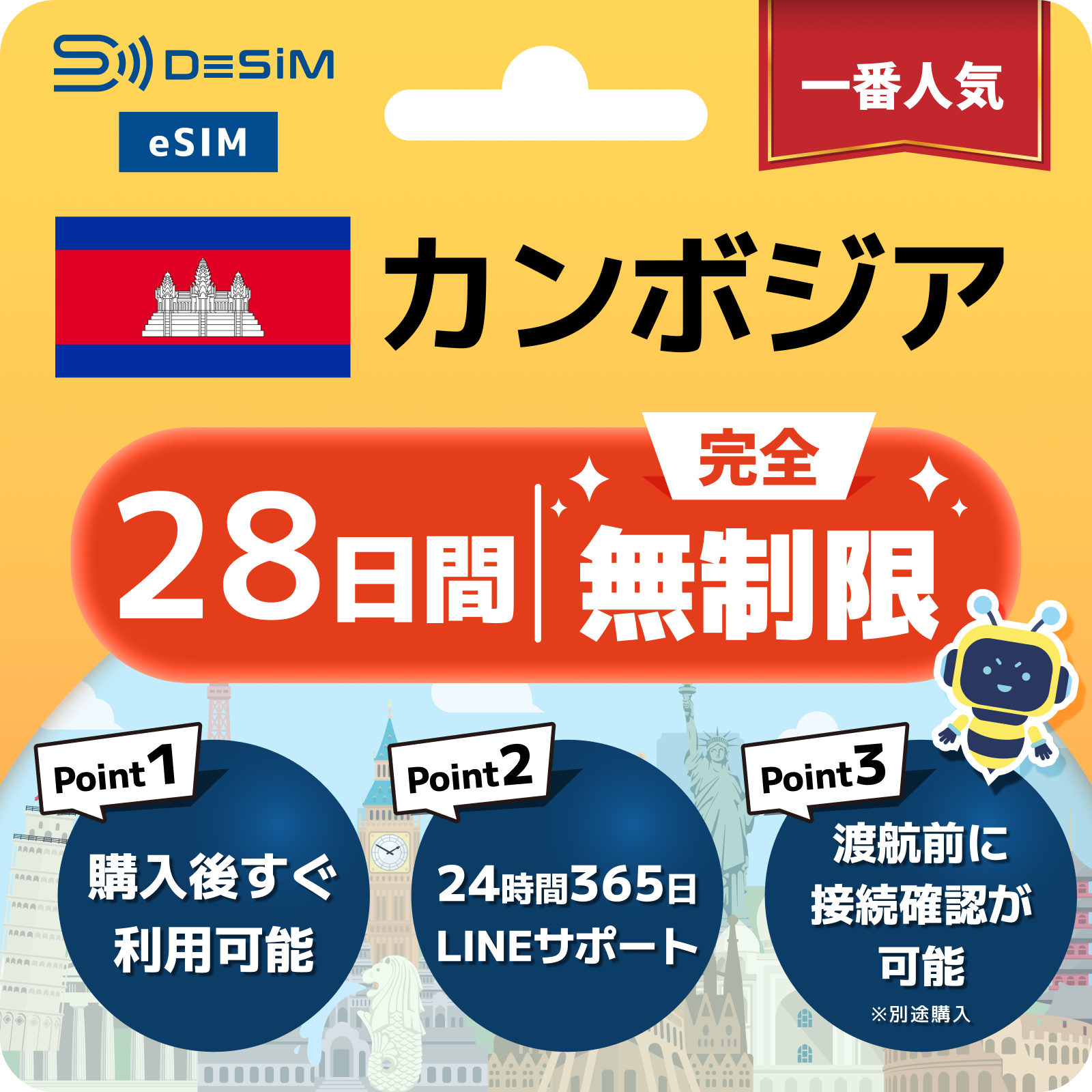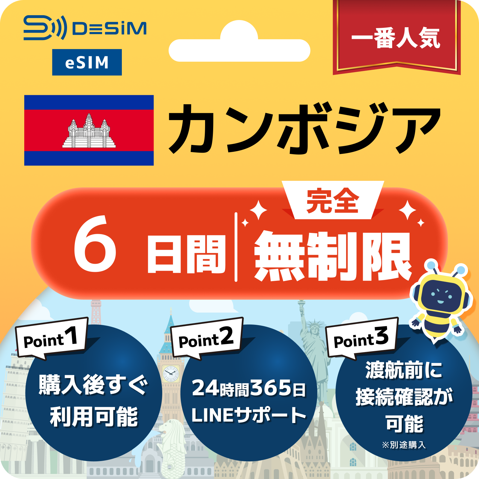 カンボジア eSIM(1~30日間) 完全無制限eSIM 即日開通 テザリング対応