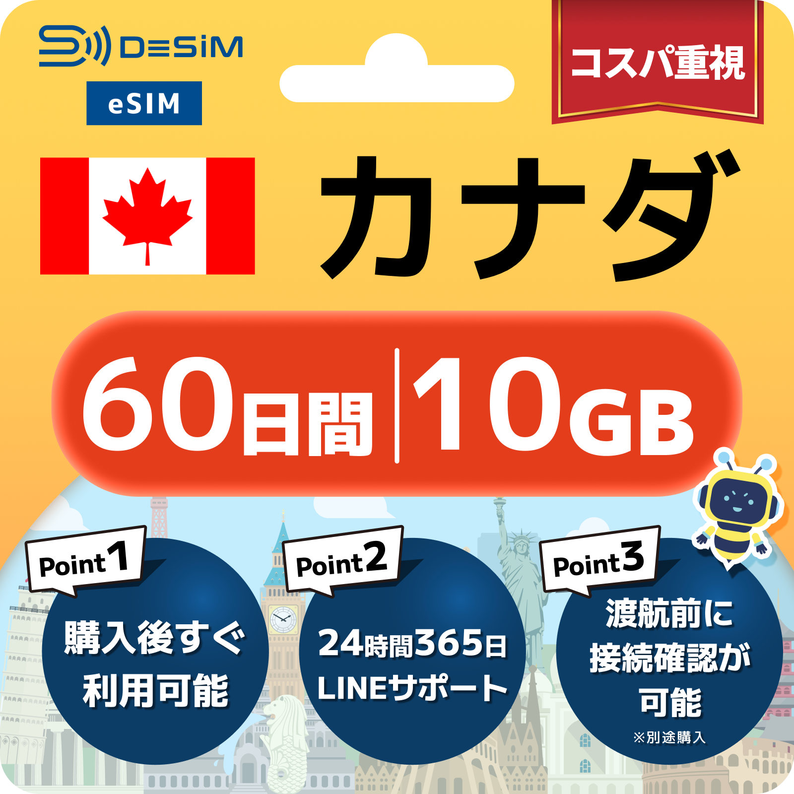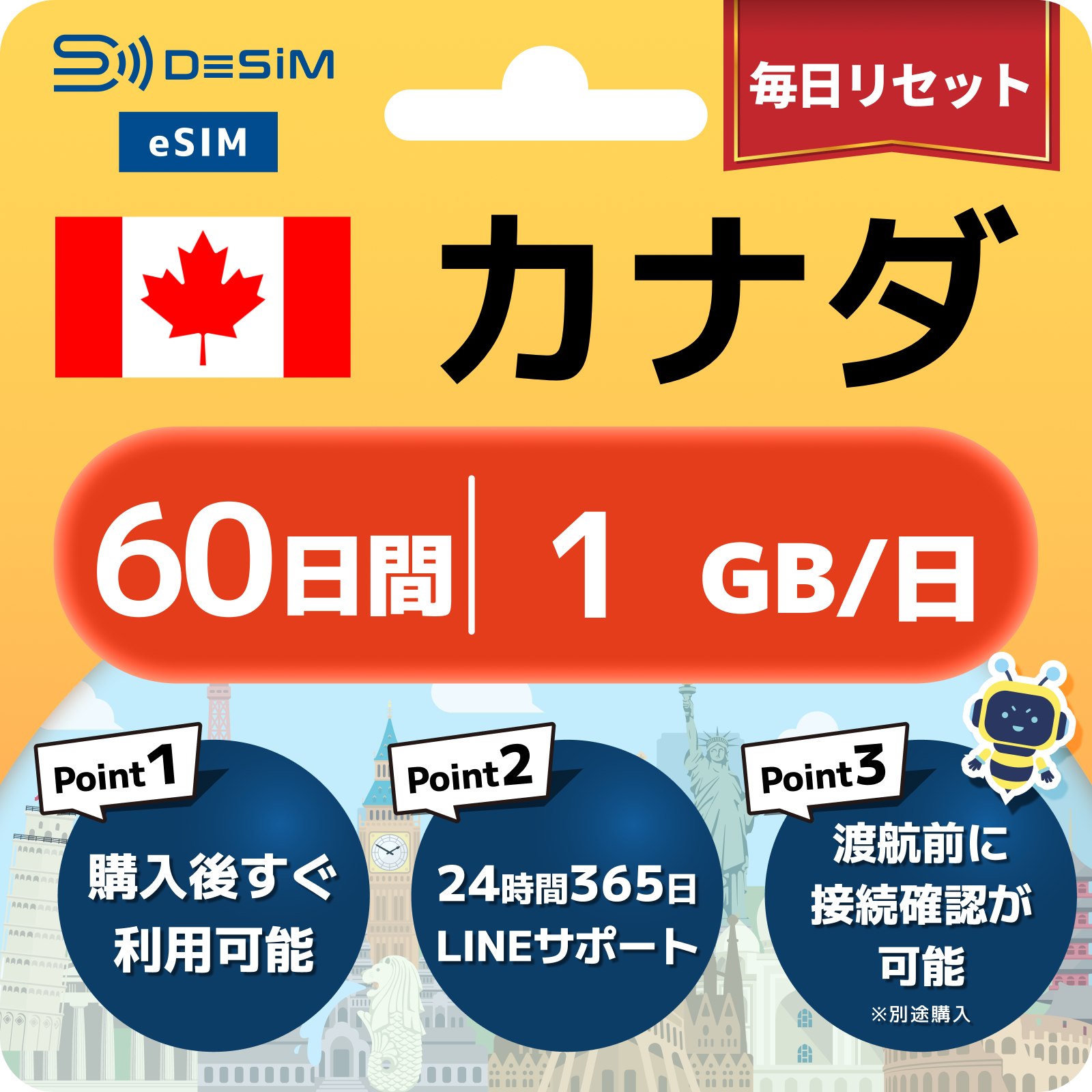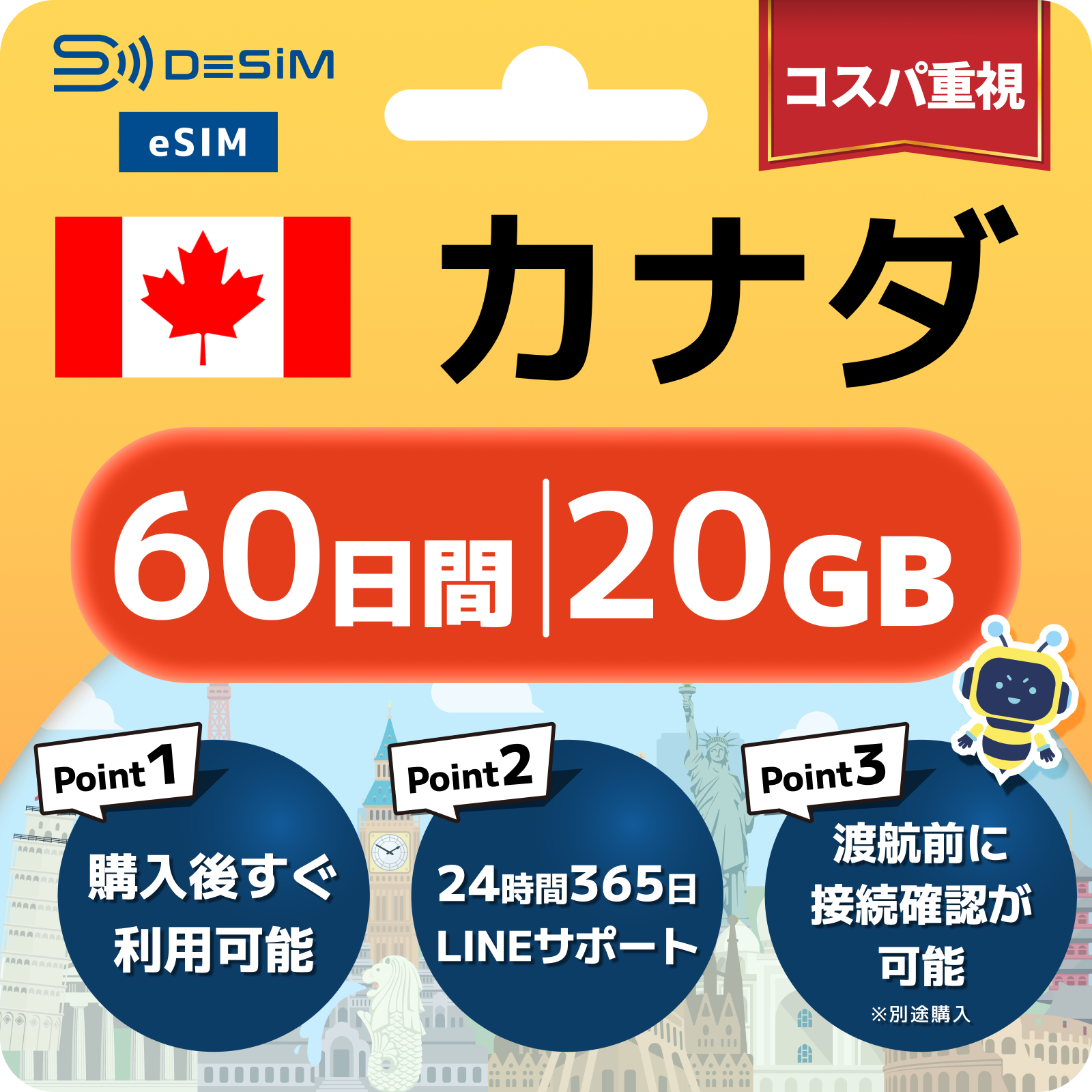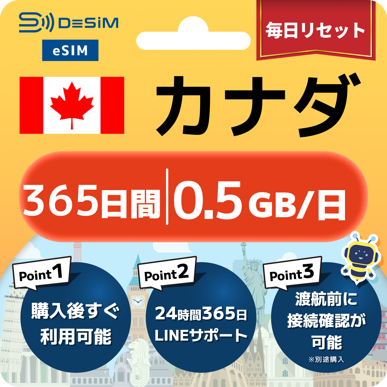 カナダ eSIM 長期(60~365日間)500MB~50GB選択可能 即日開通 テザリング対応