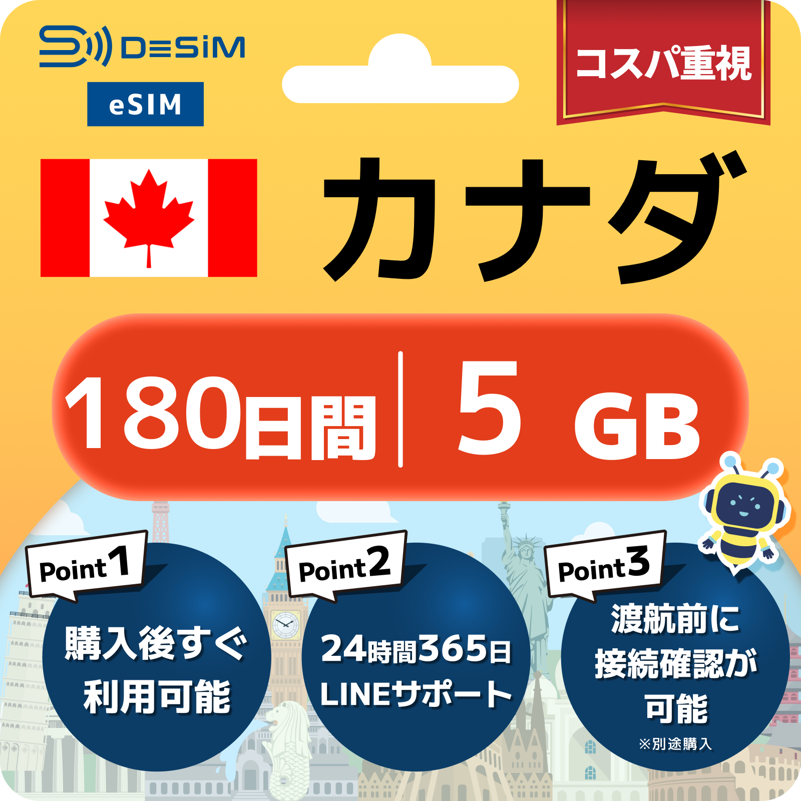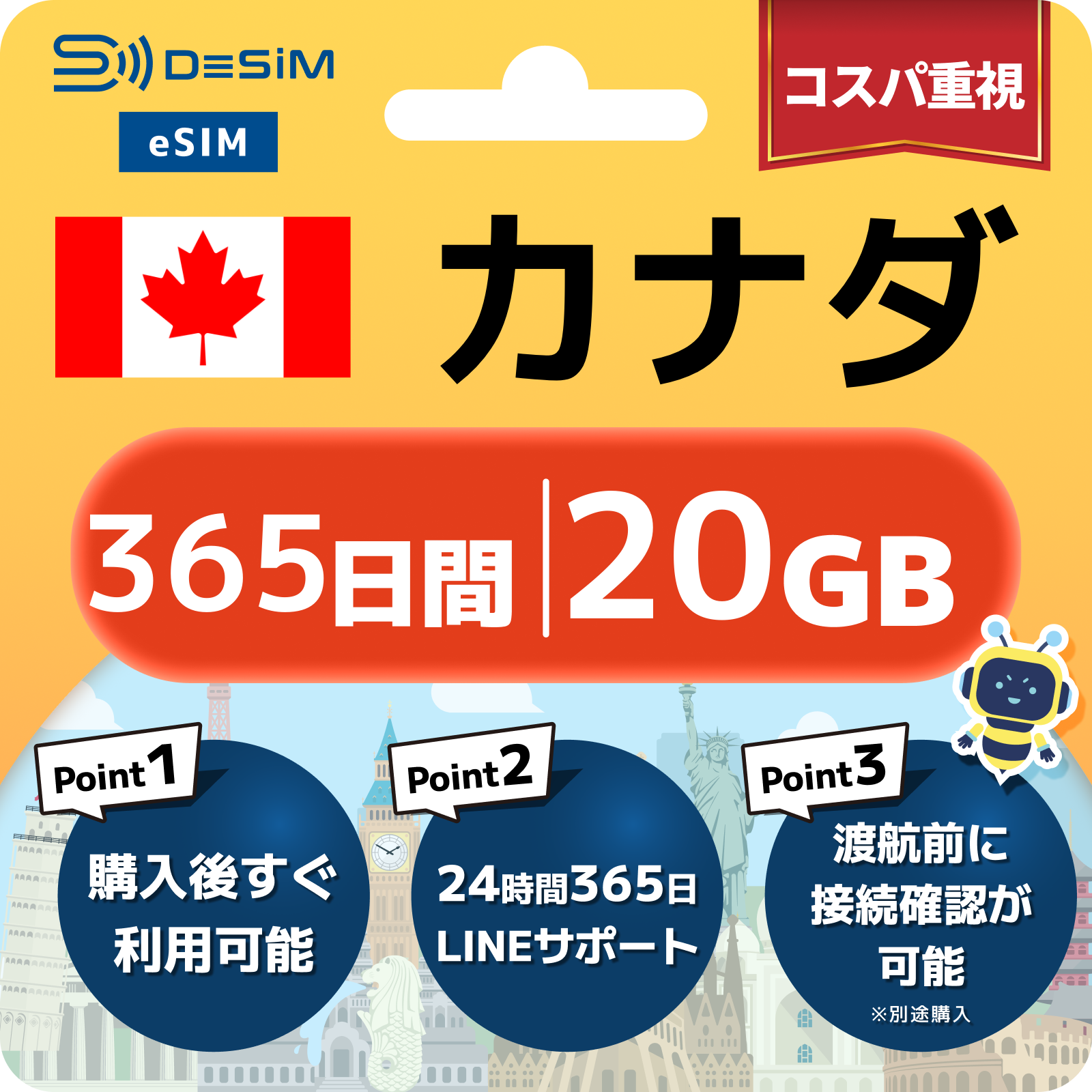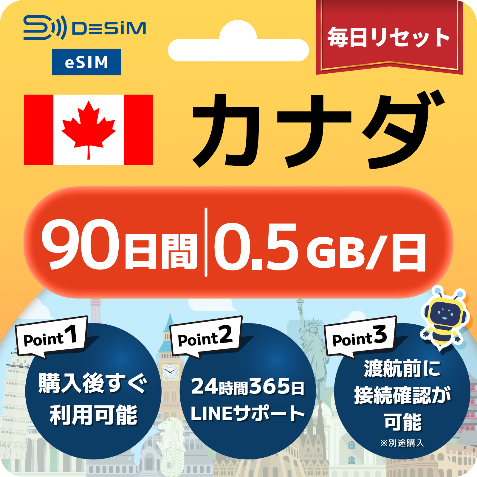 カナダ eSIM 長期(60~365日間)500MB~50GB選択可能 即日開通 テザリング対応