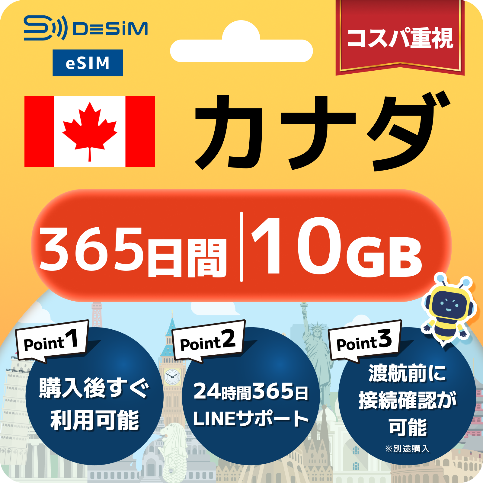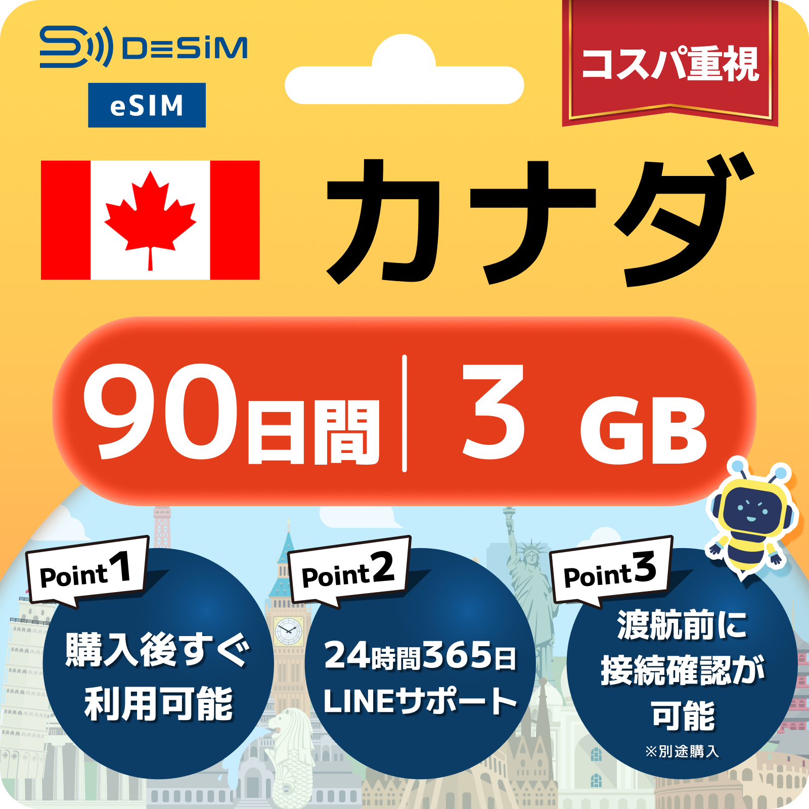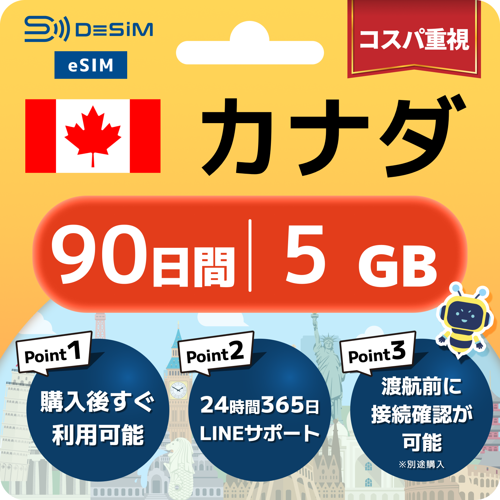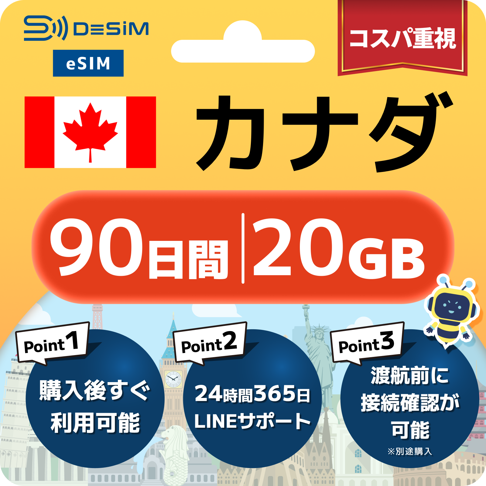 カナダ eSIM 長期(60~365日間)500MB~50GB選択可能 即日開通 テザリング対応