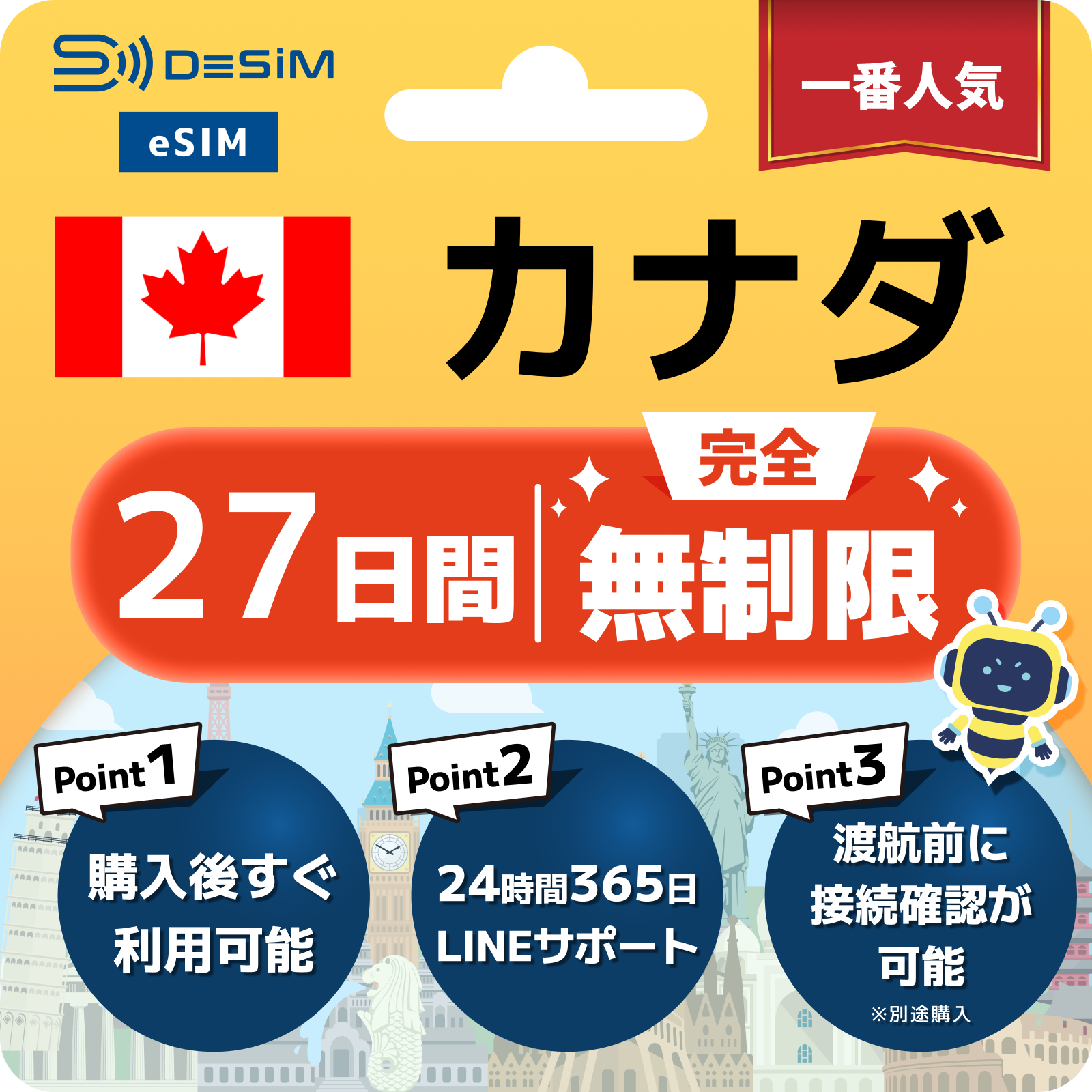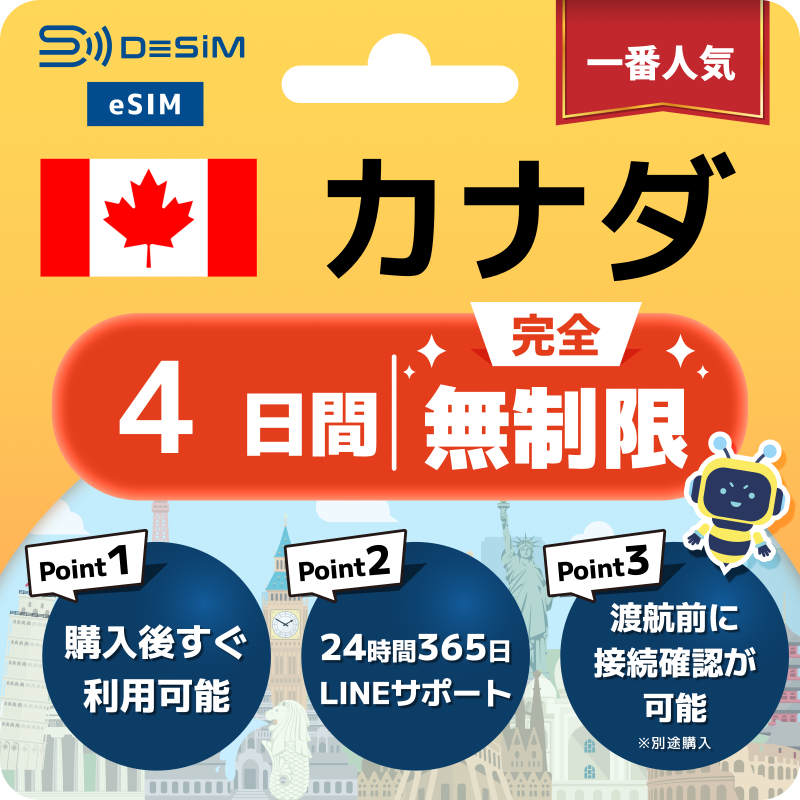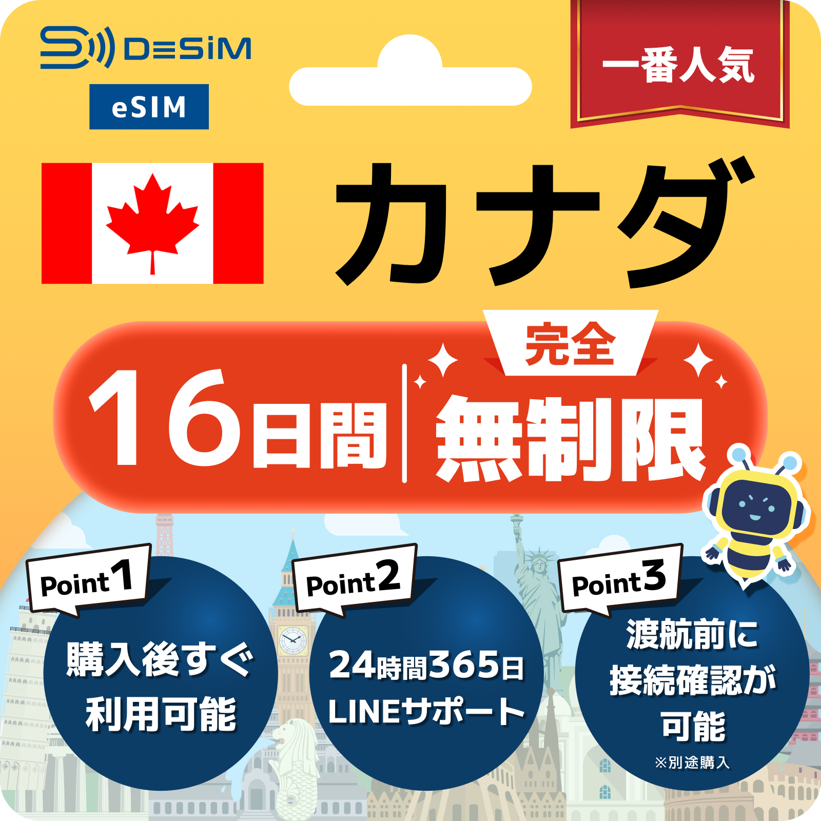 カナダ eSIM(1~30日間) 完全無制限eSIM 即日開通 テザリング対応