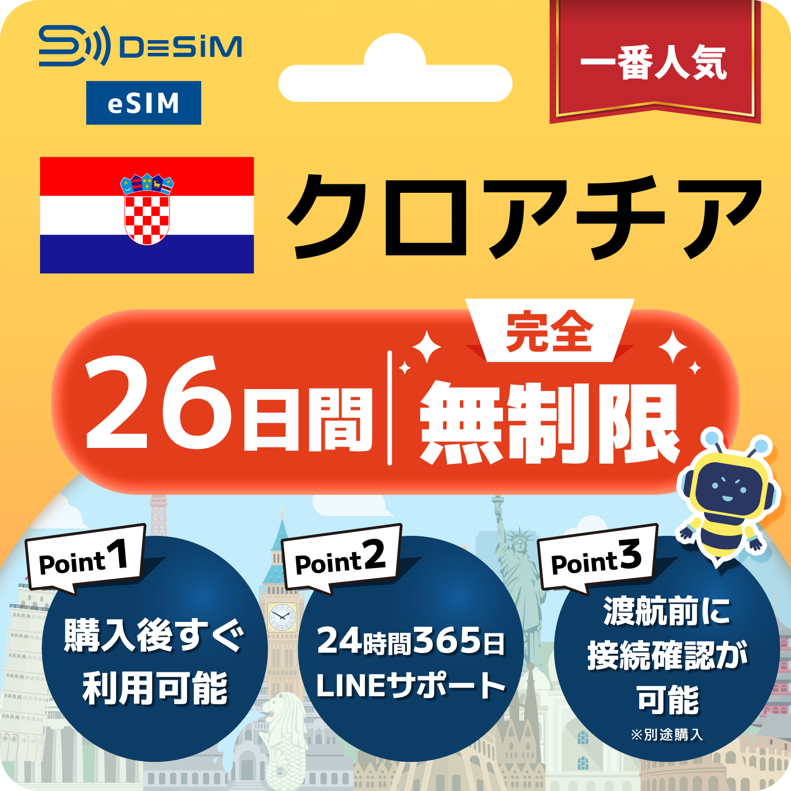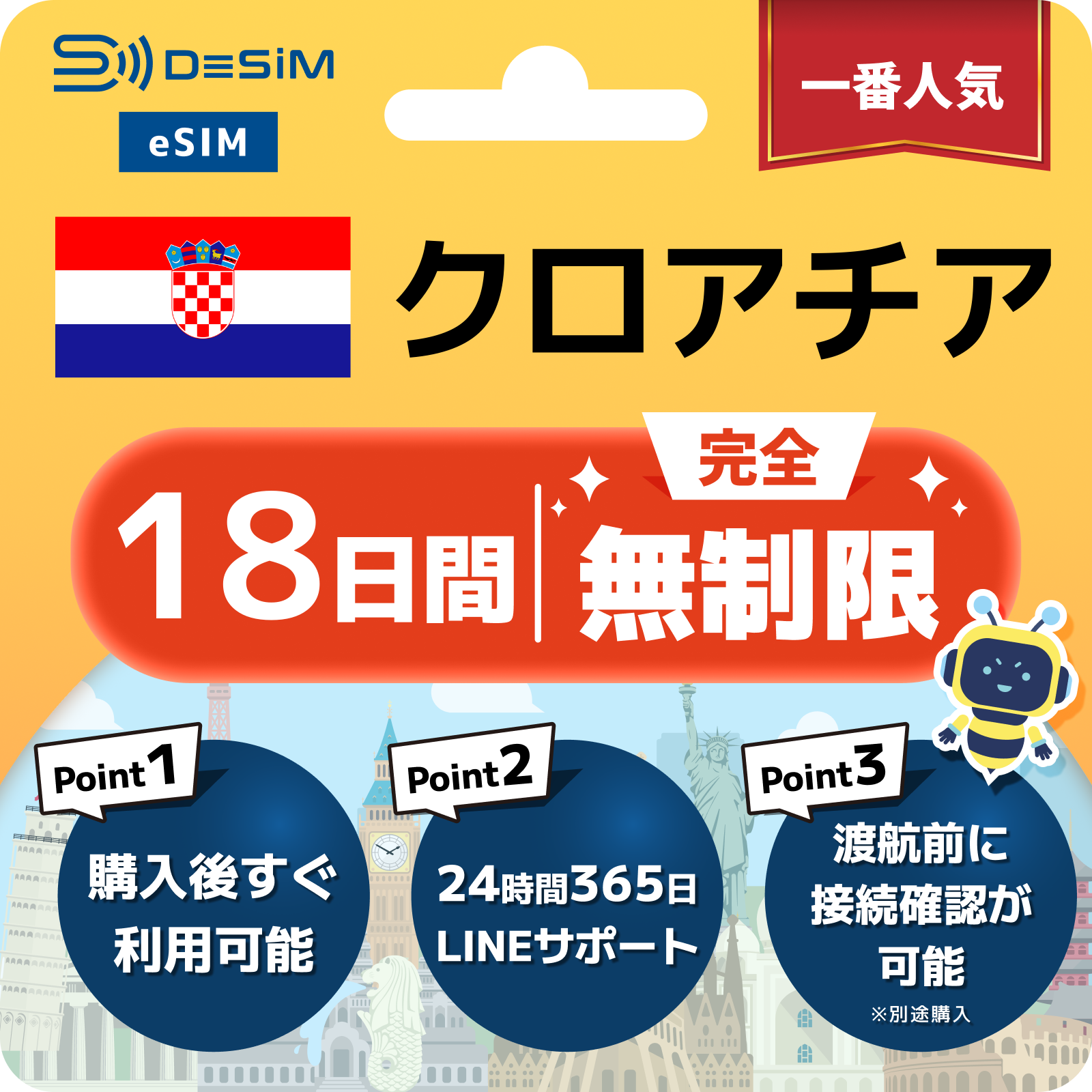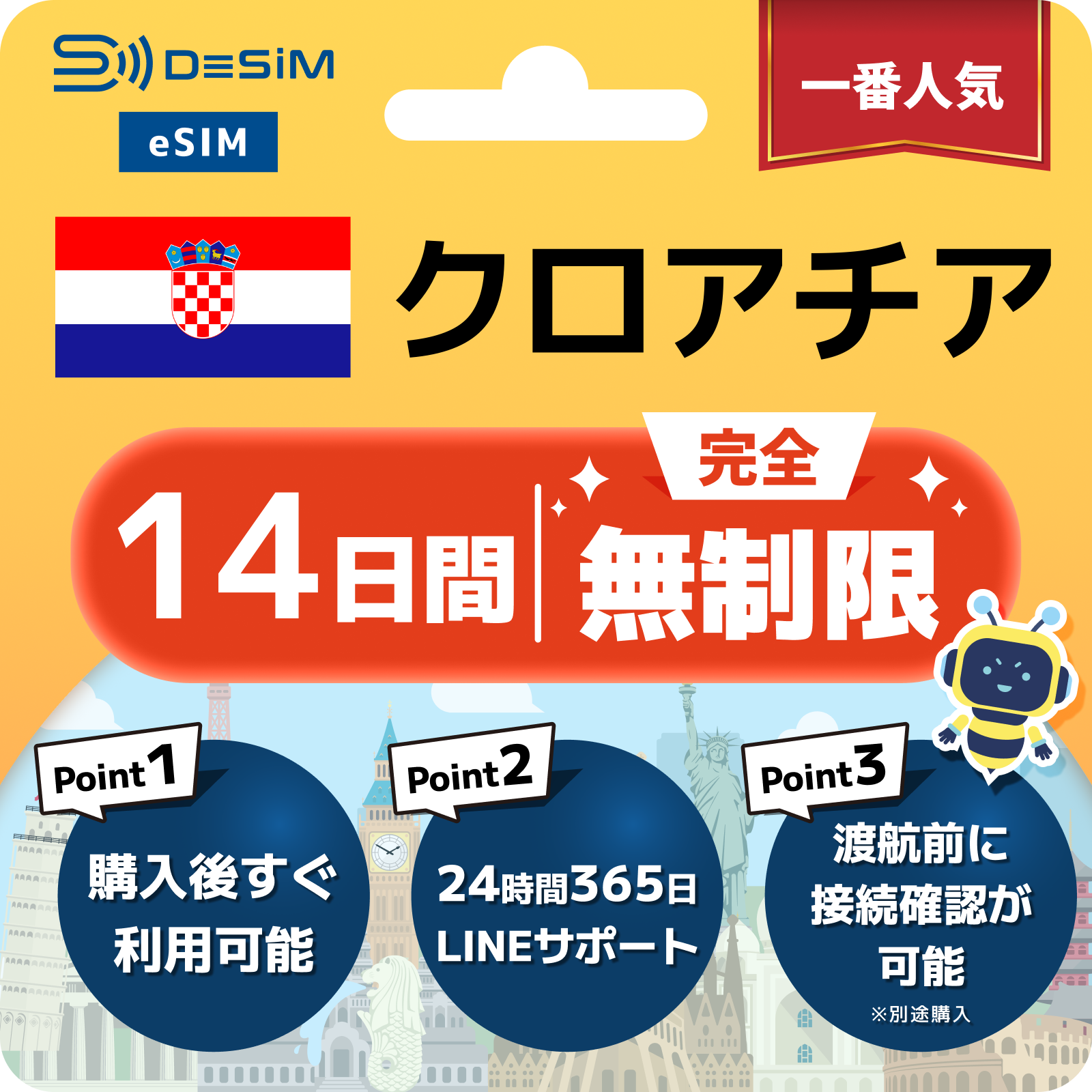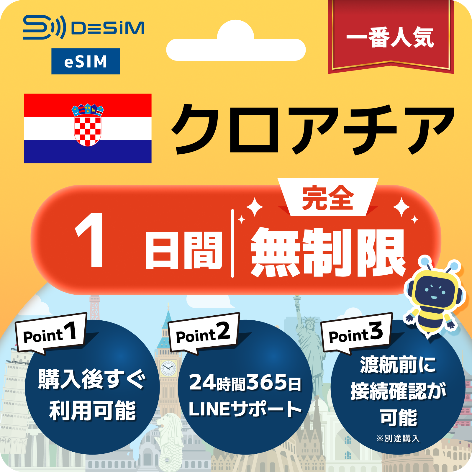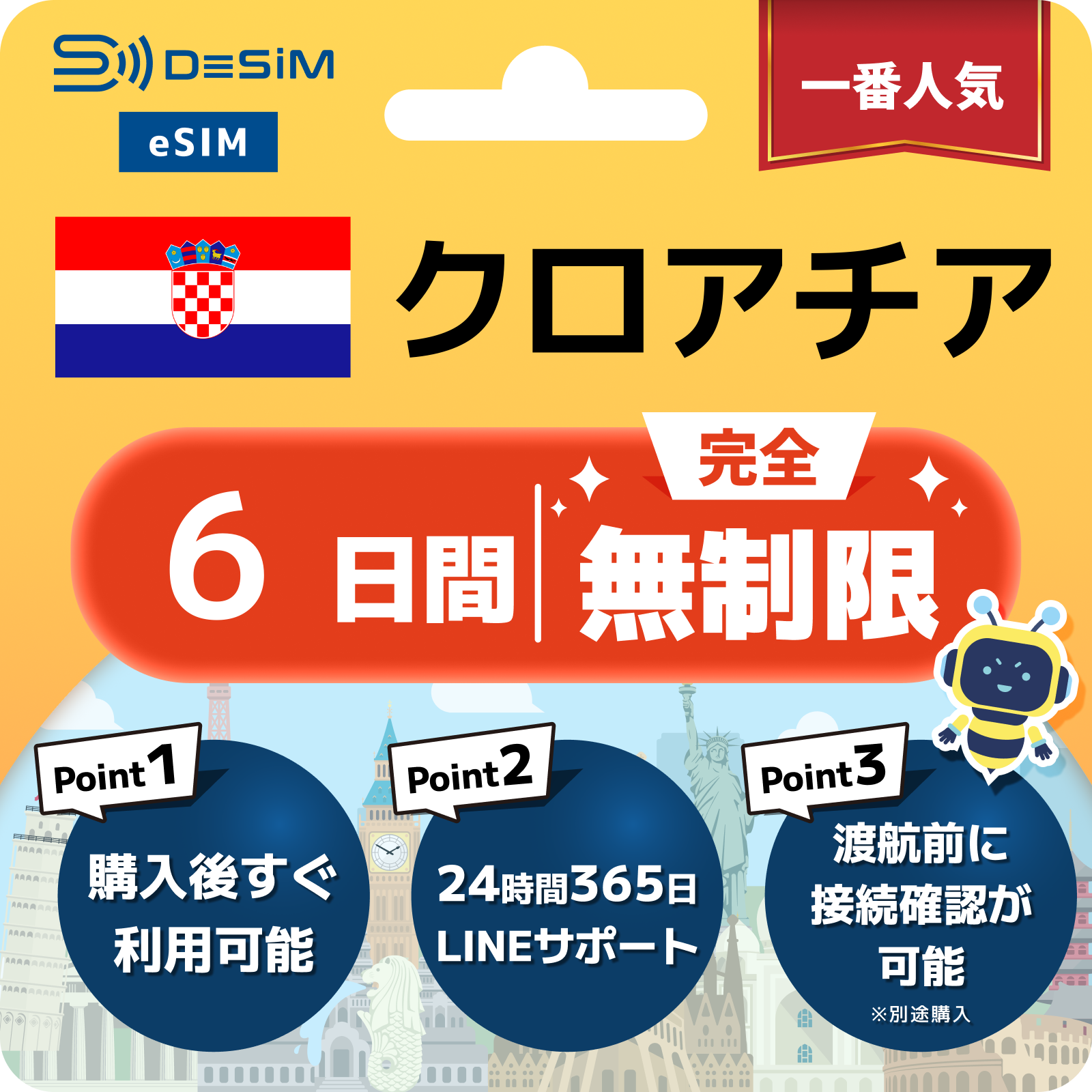 クロアチア eSIM(1~30日間) 完全無制限eSIM 即日開通 テザリング対応