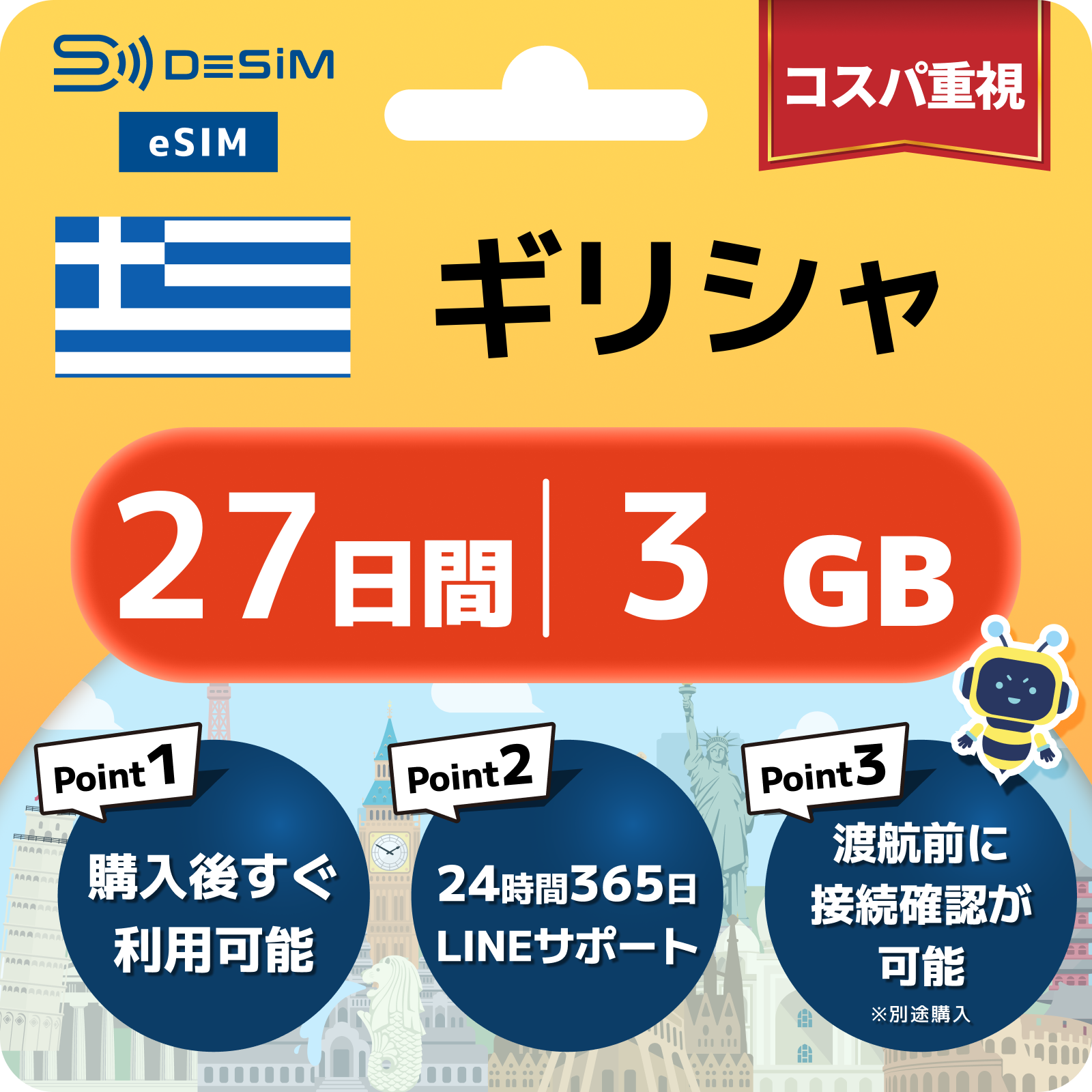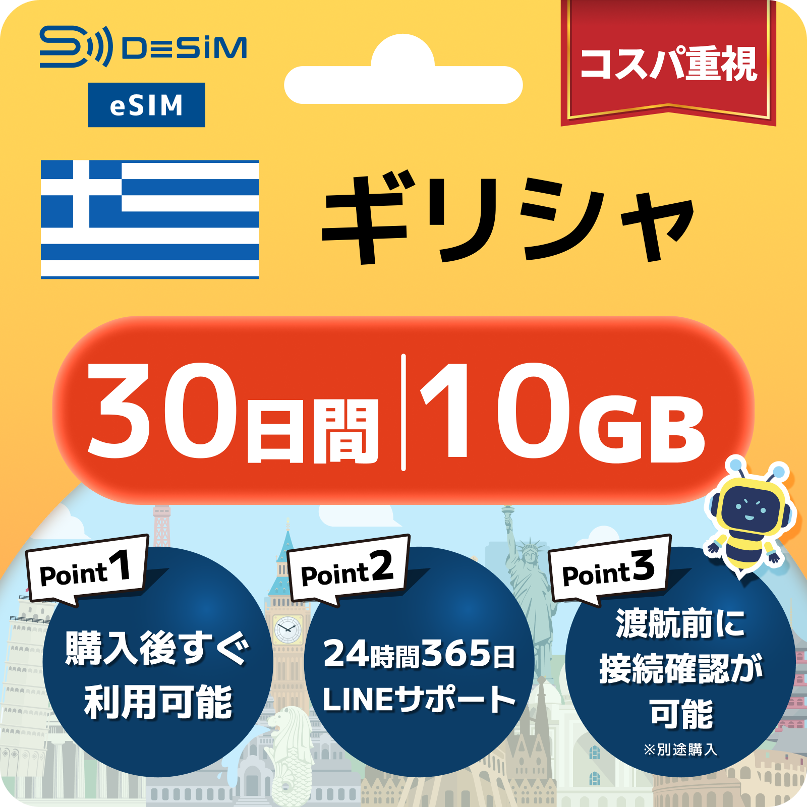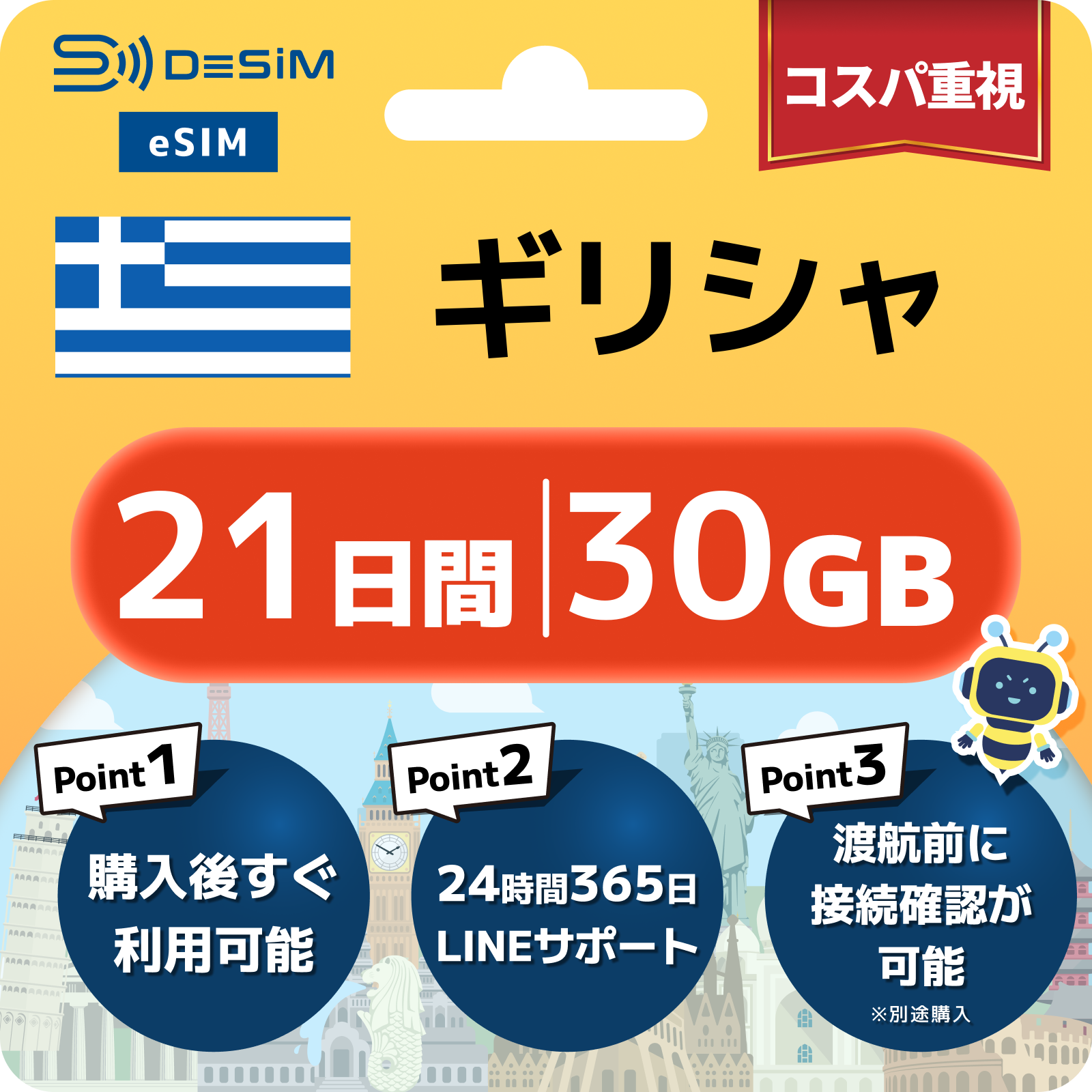 ギリシャ eSIM(21~30日間)500MB~50GB選択可能 即日開通 テザリング対応