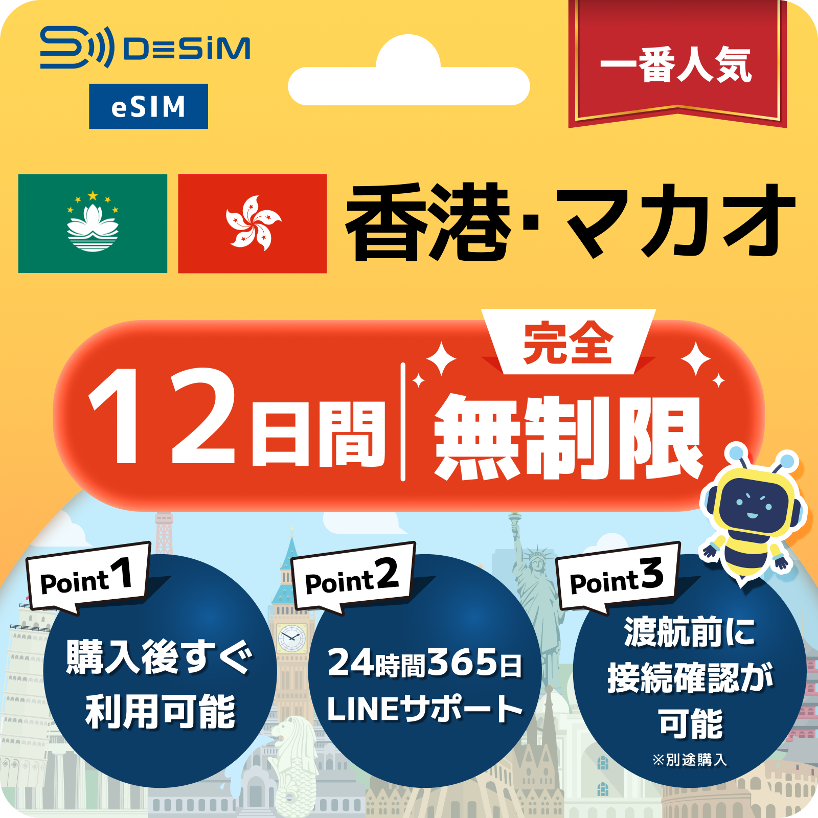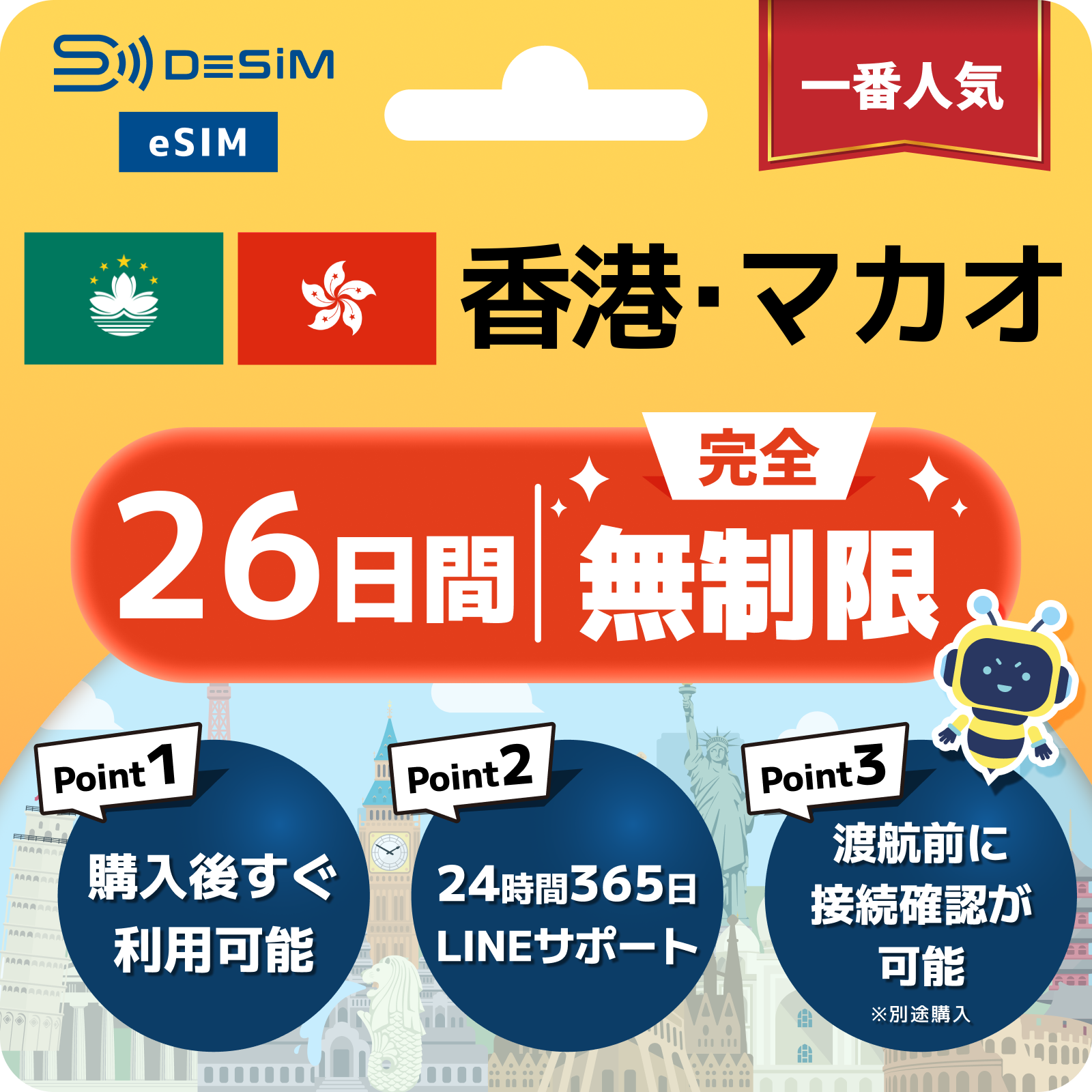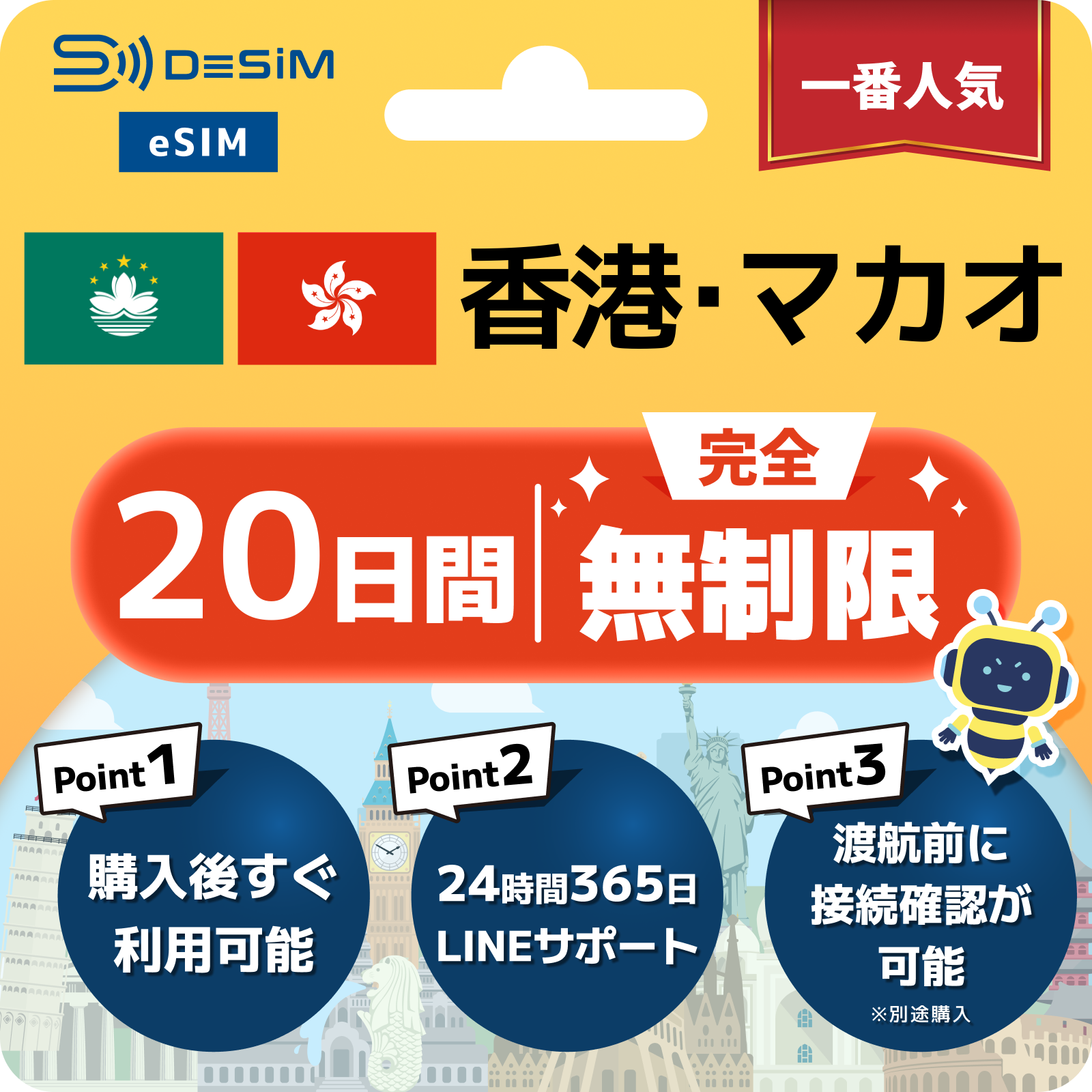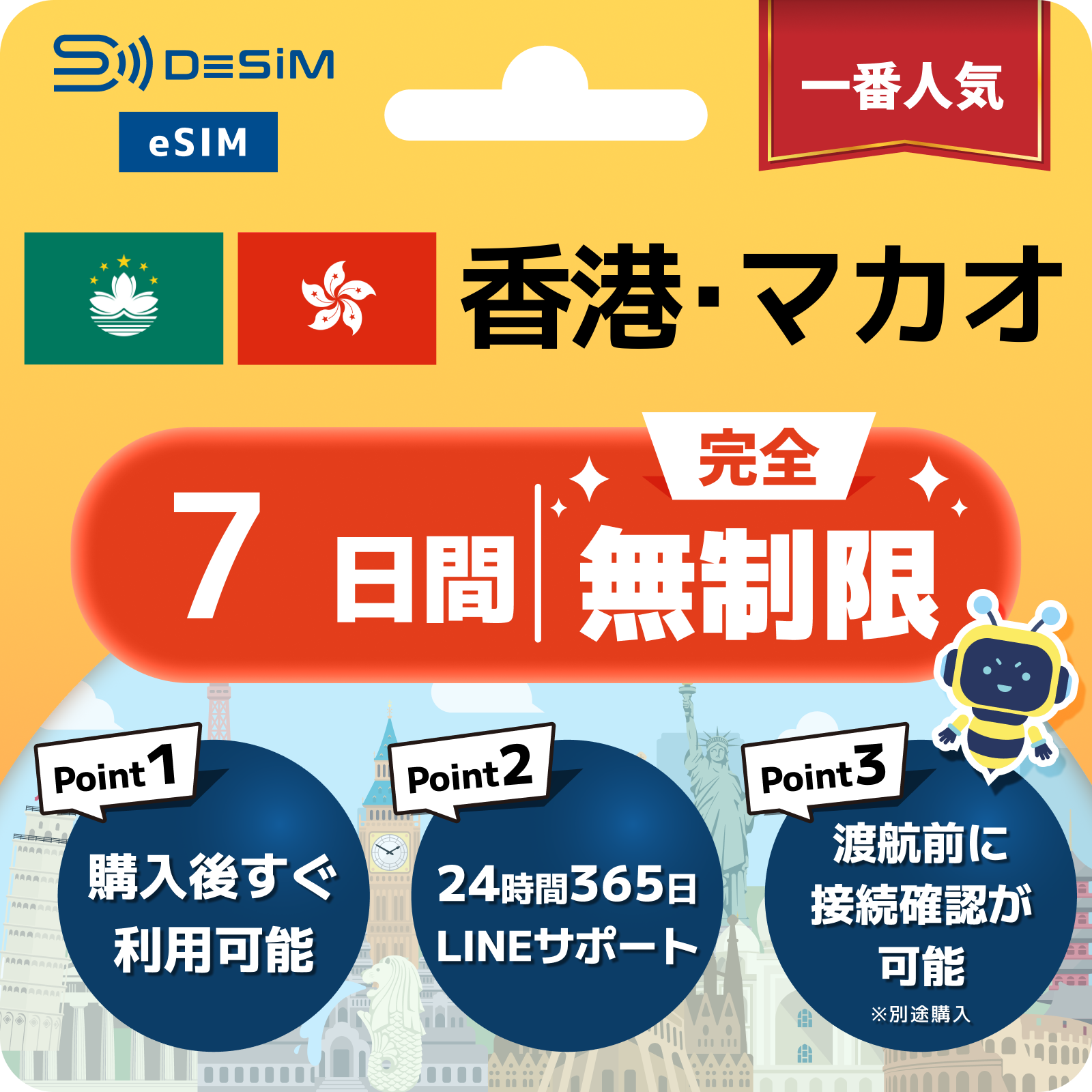 香港・マカオ eSIM(1~30日間) 完全無制限eSIM 即日開通 テザリング対応
