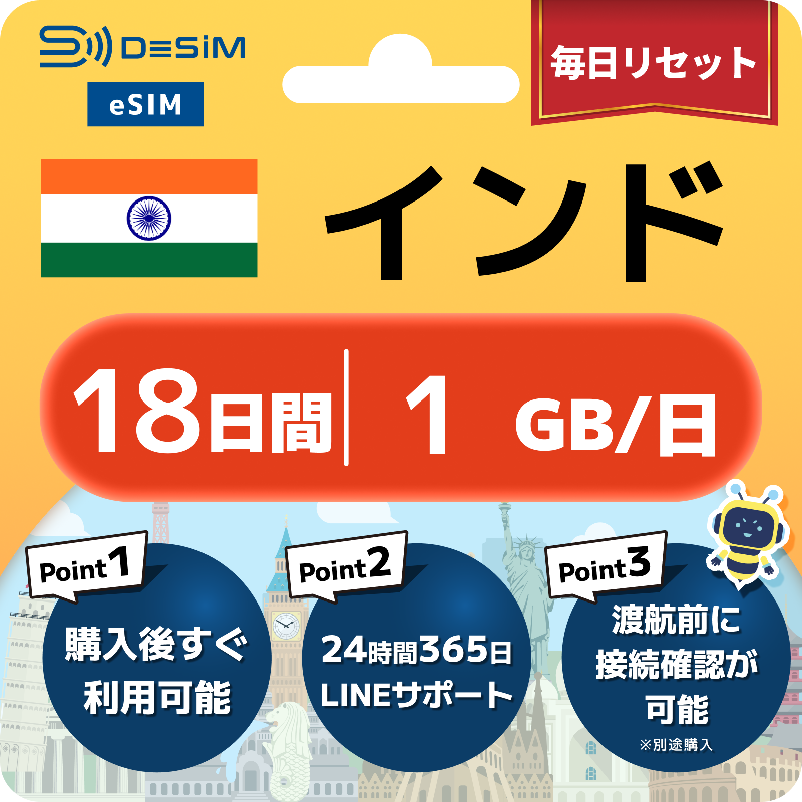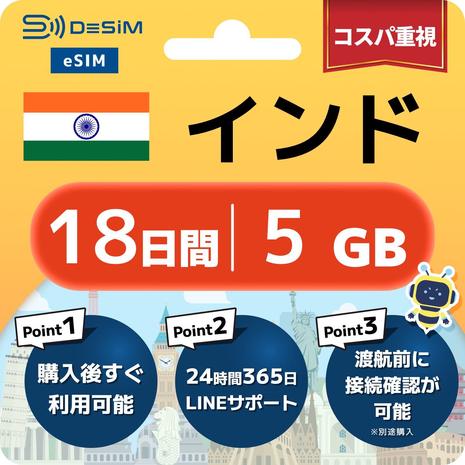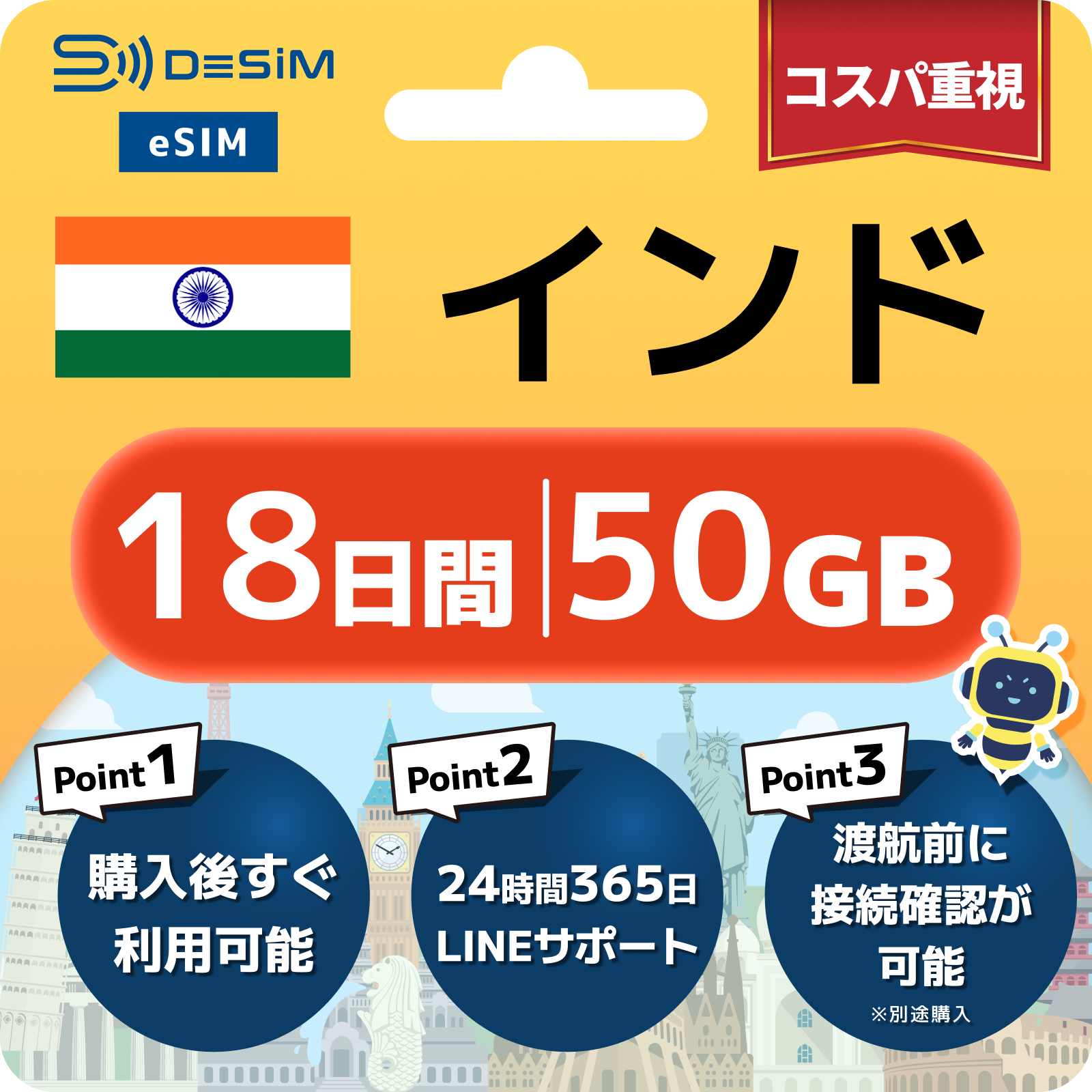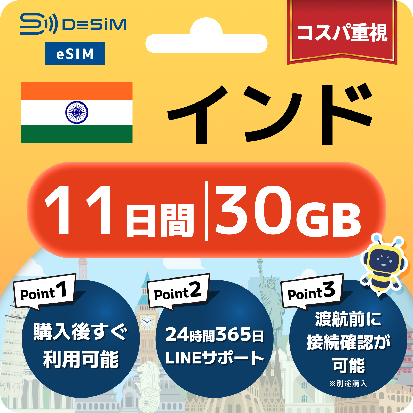 インド eSIM(11~20日間)500MB~50GB選択可能 即日開通 テザリング対応