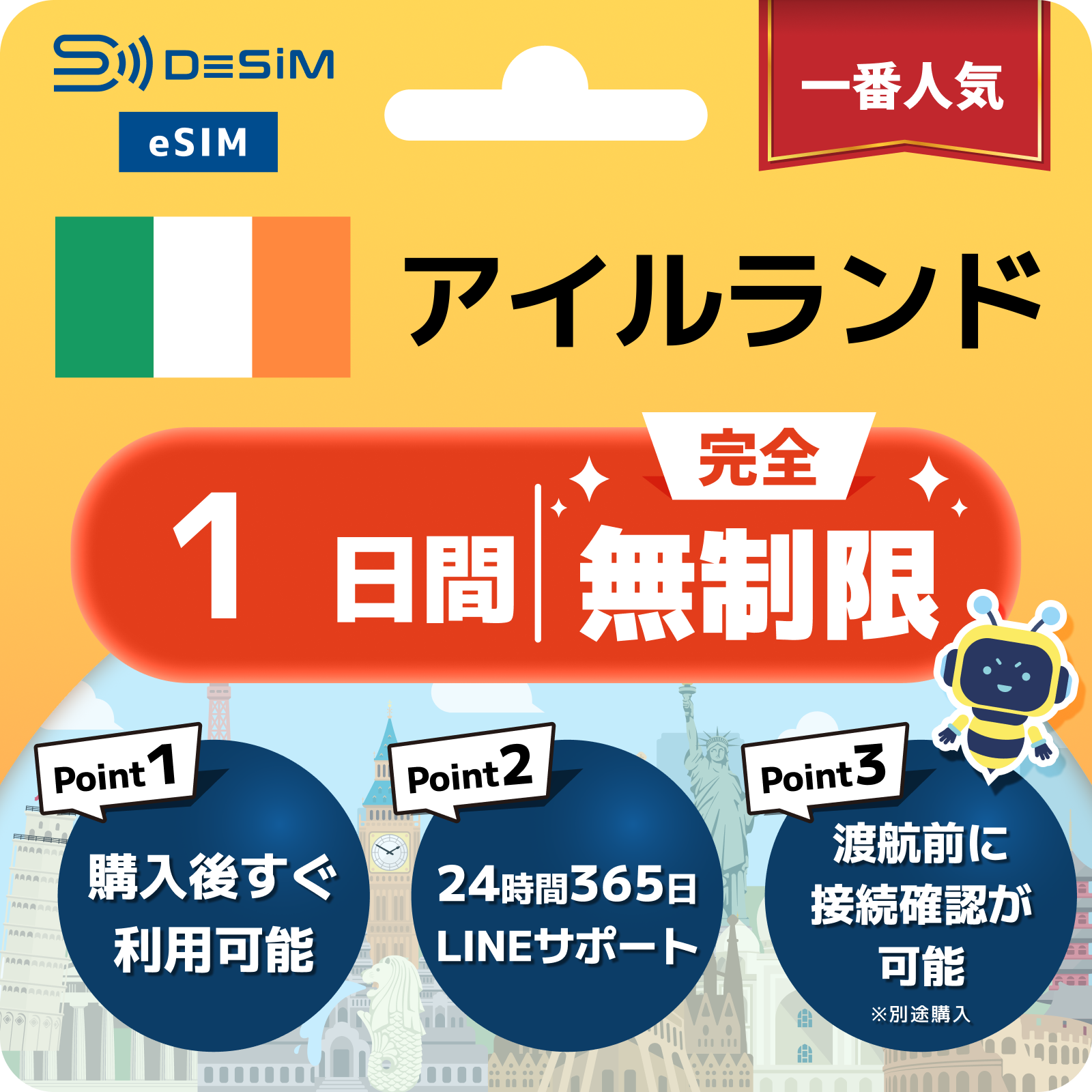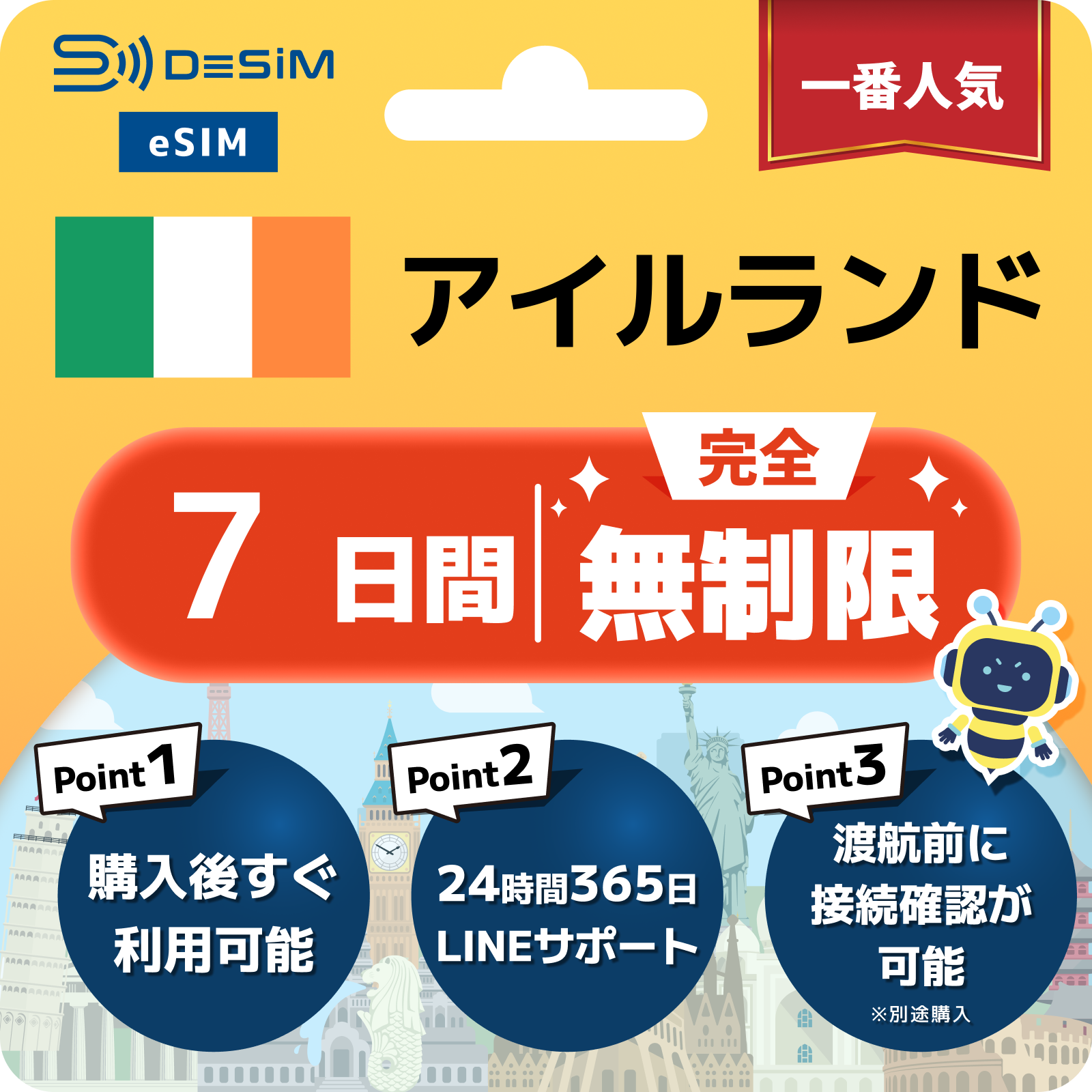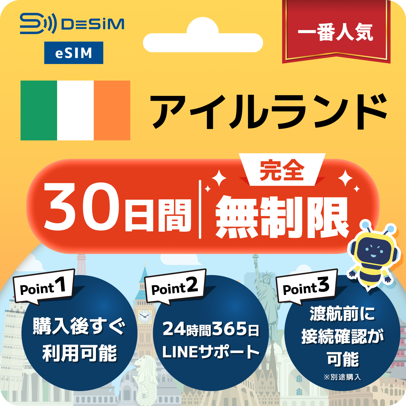 アイルランド eSIM(1~30日間) 完全無制限eSIM 即日開通 テザリング対応