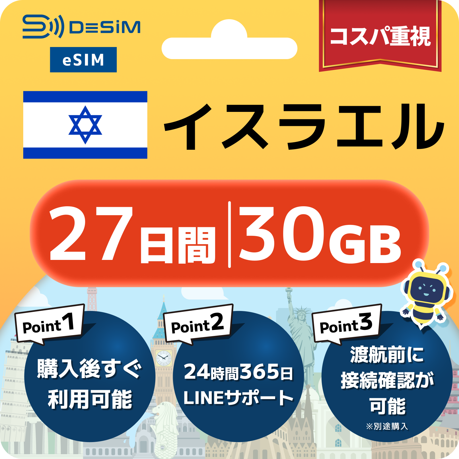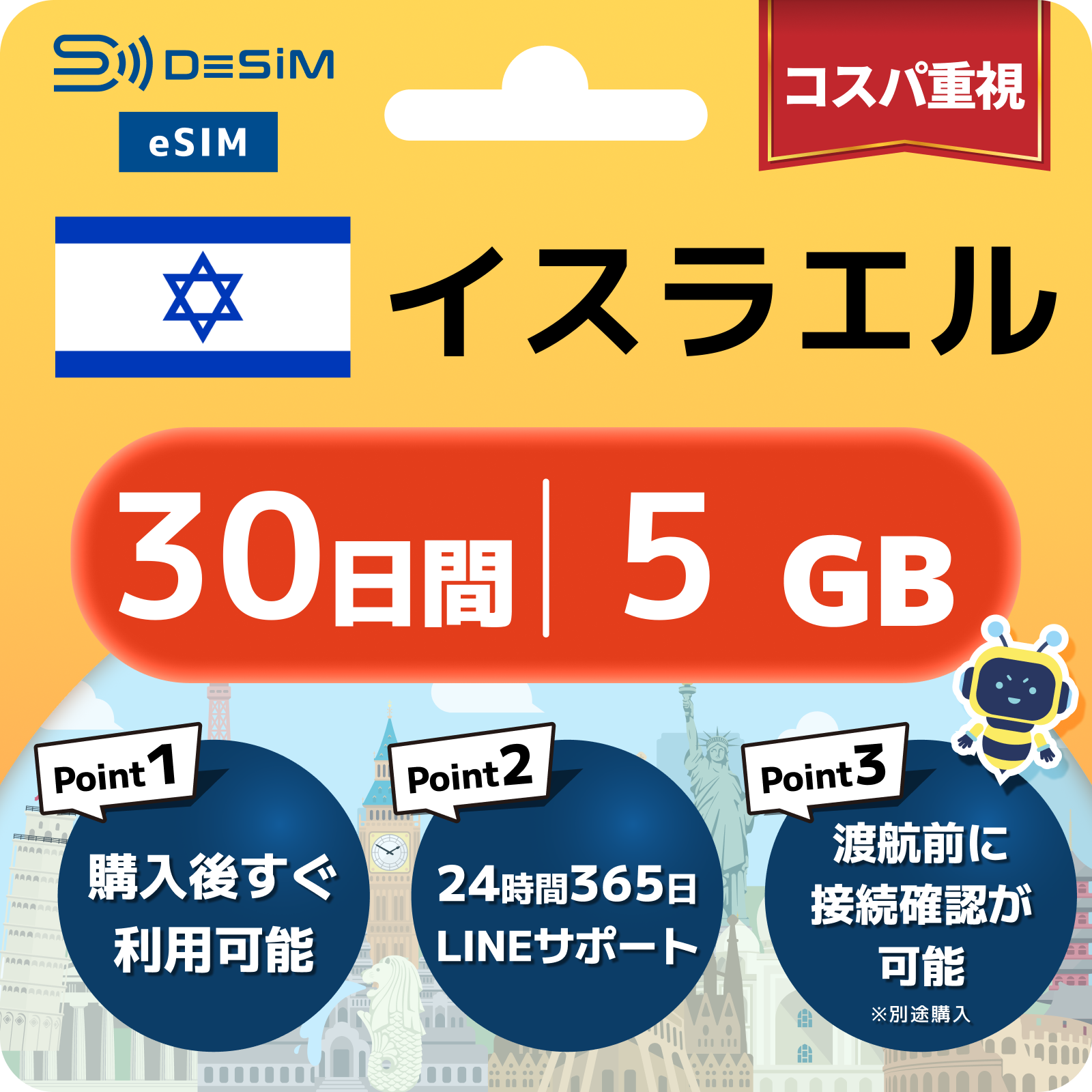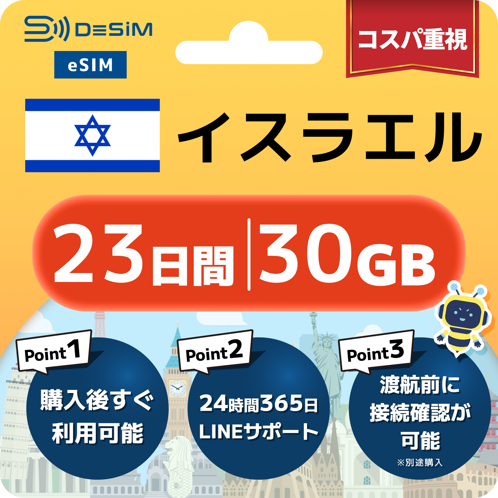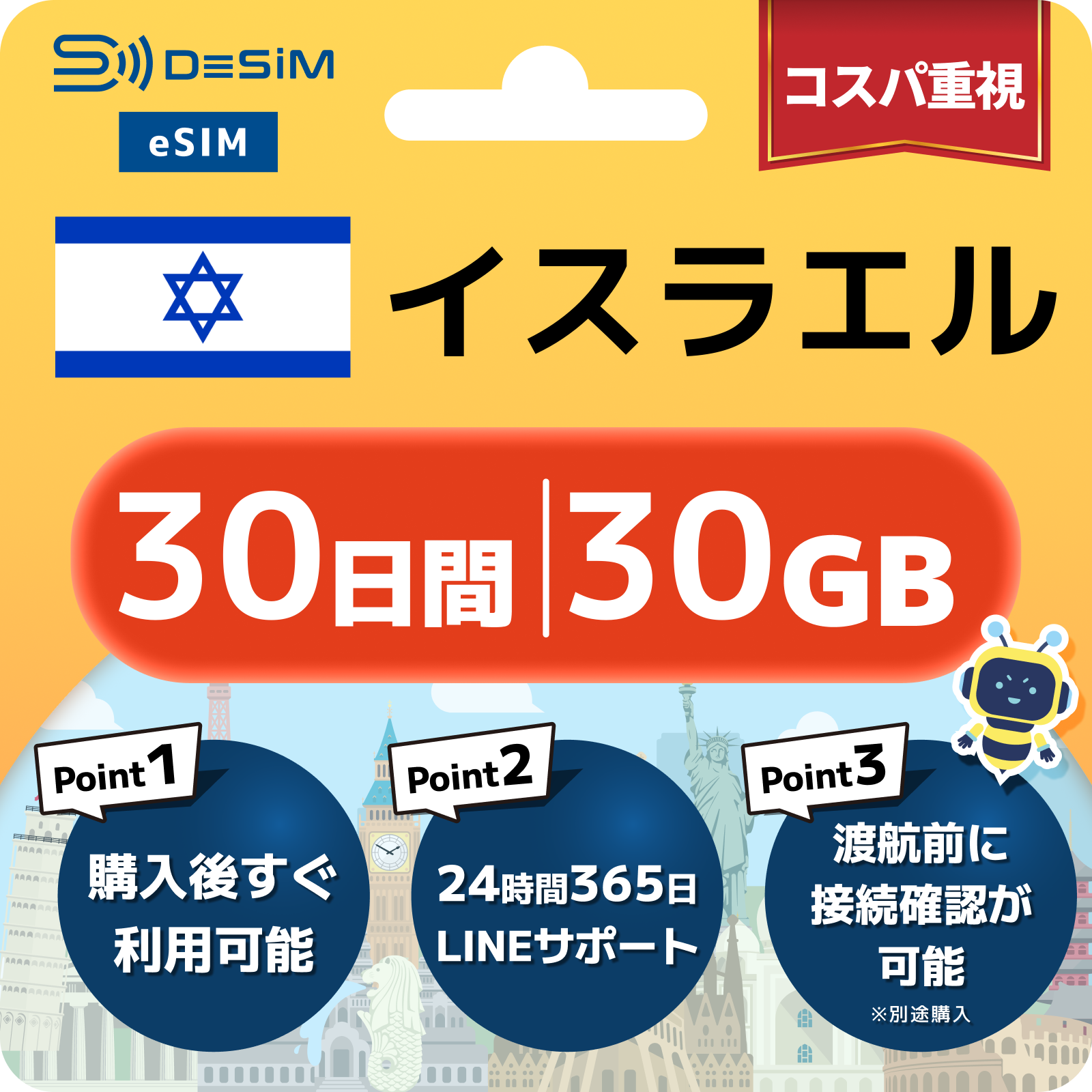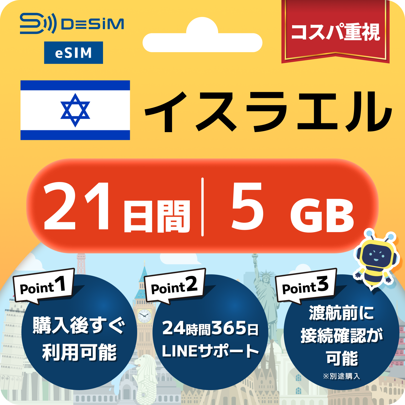 イスラエル eSIM(21~30日間)500MB~50GB選択可能 即日開通 テザリング対応