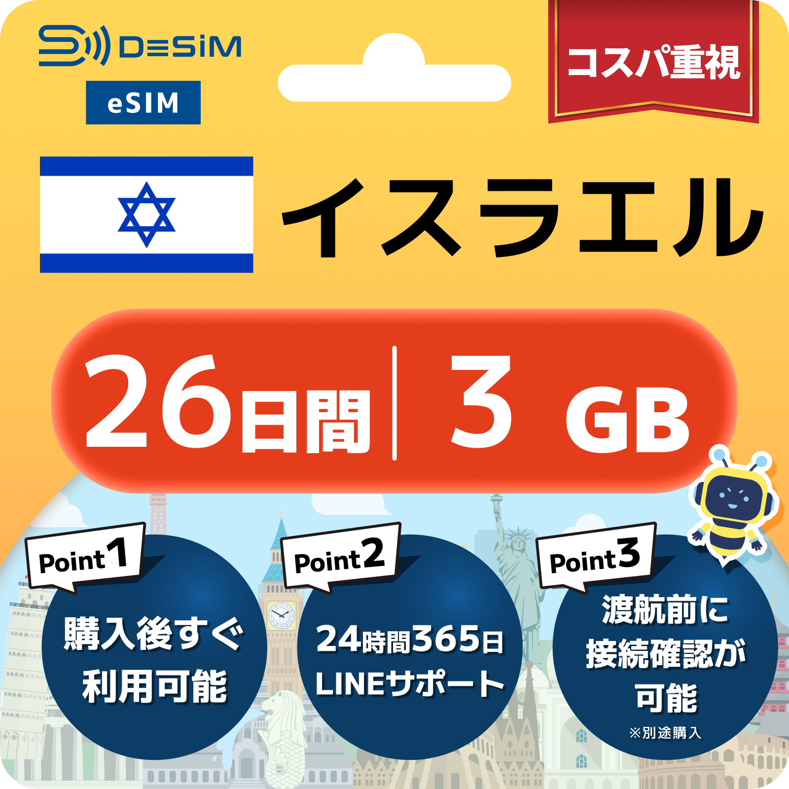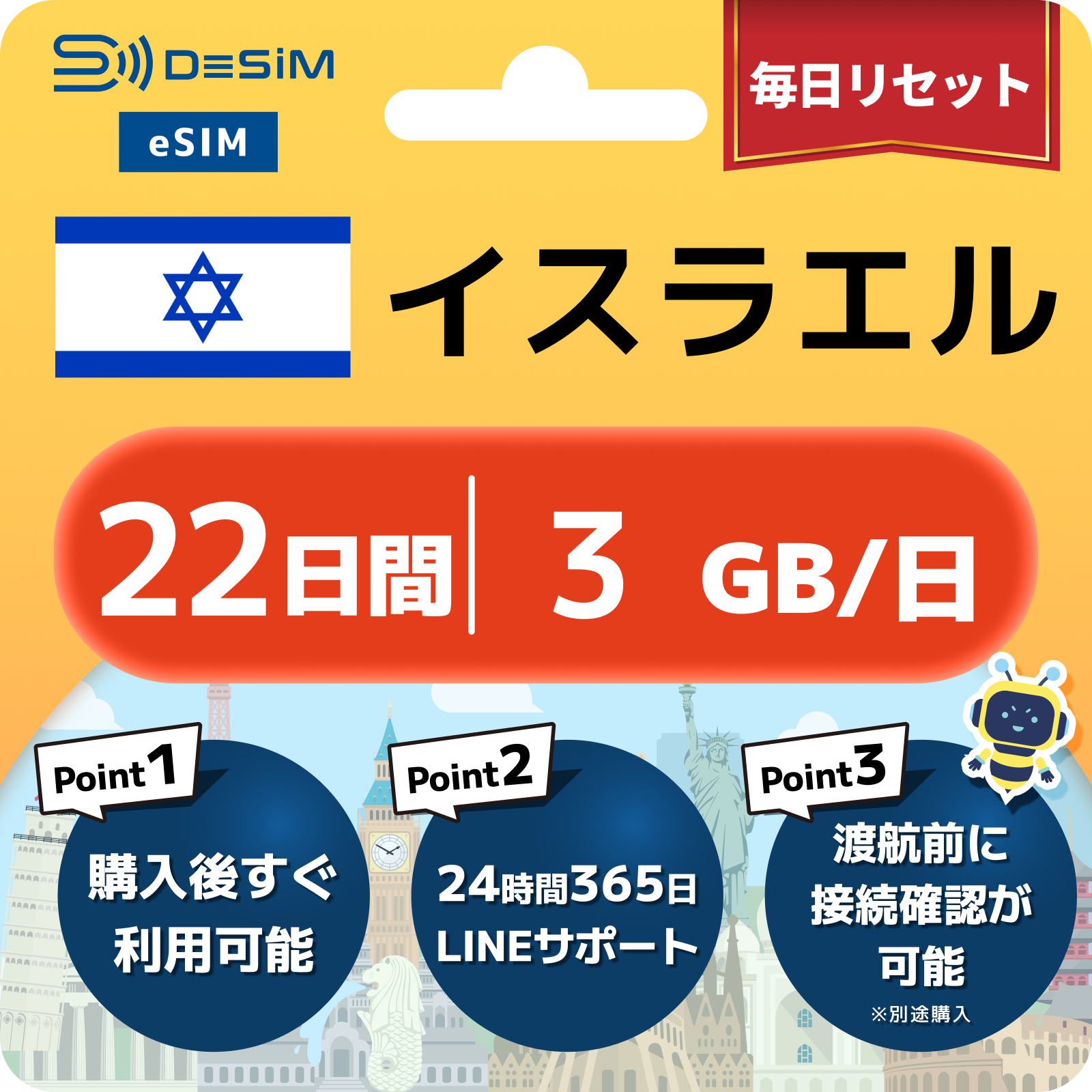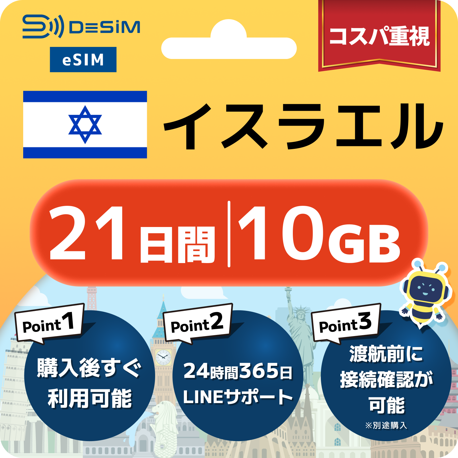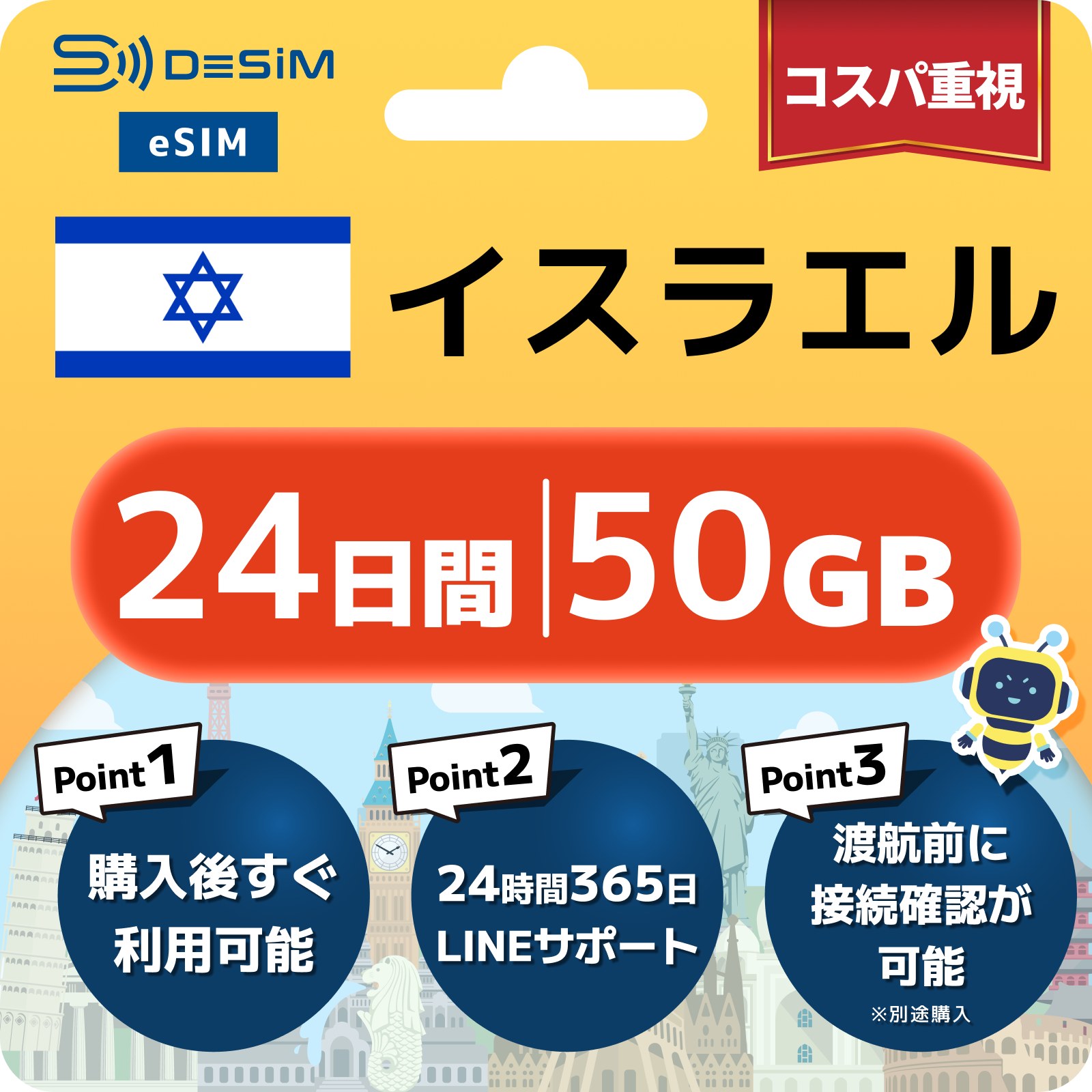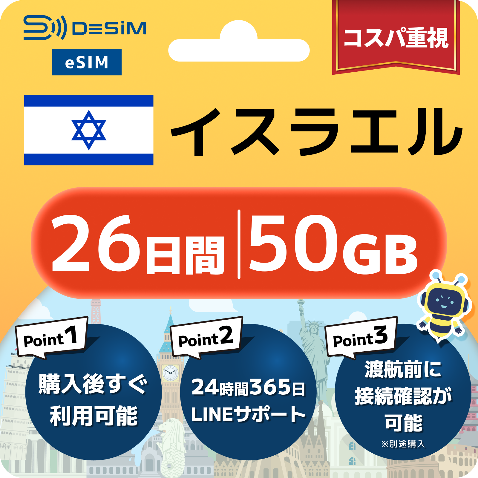 イスラエル eSIM(21~30日間)500MB~50GB選択可能 即日開通 テザリング対応