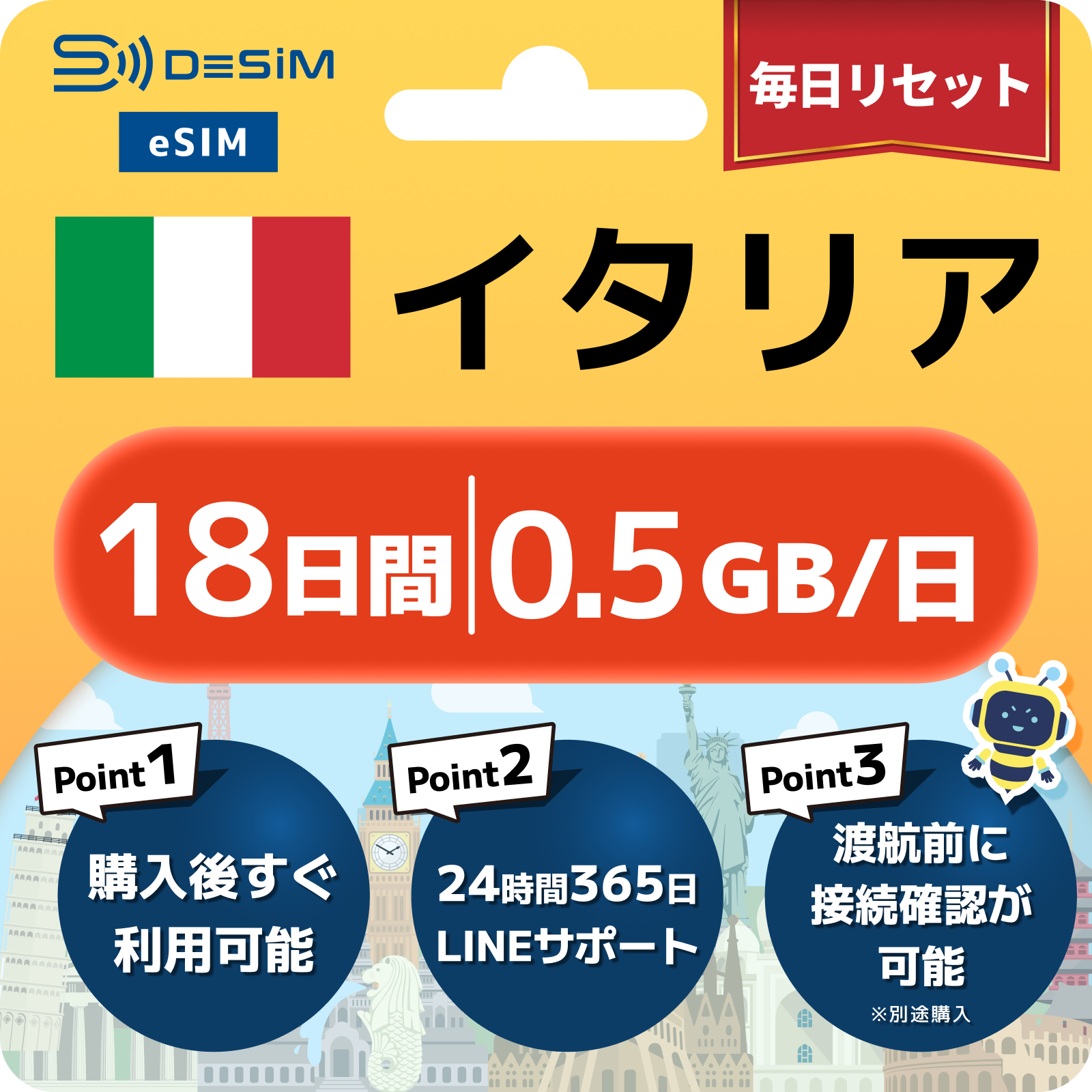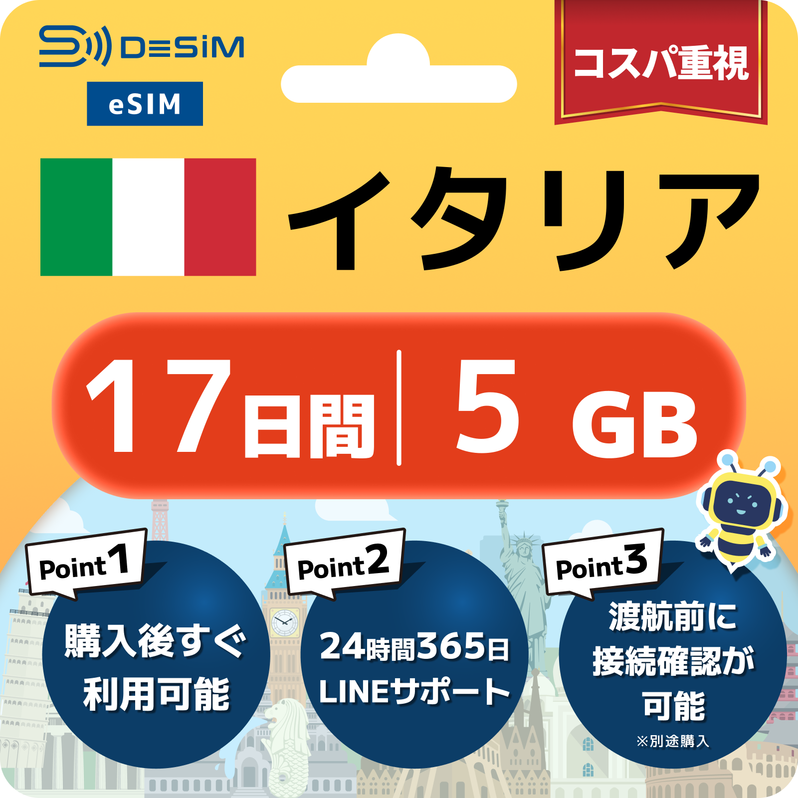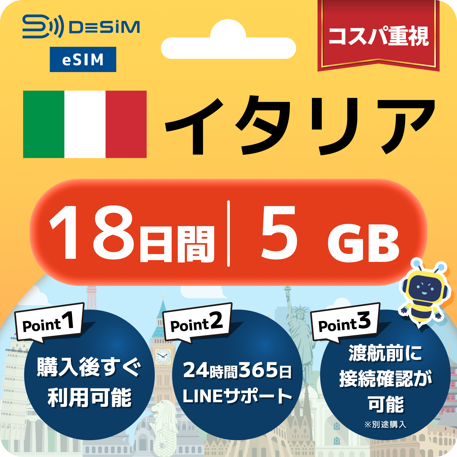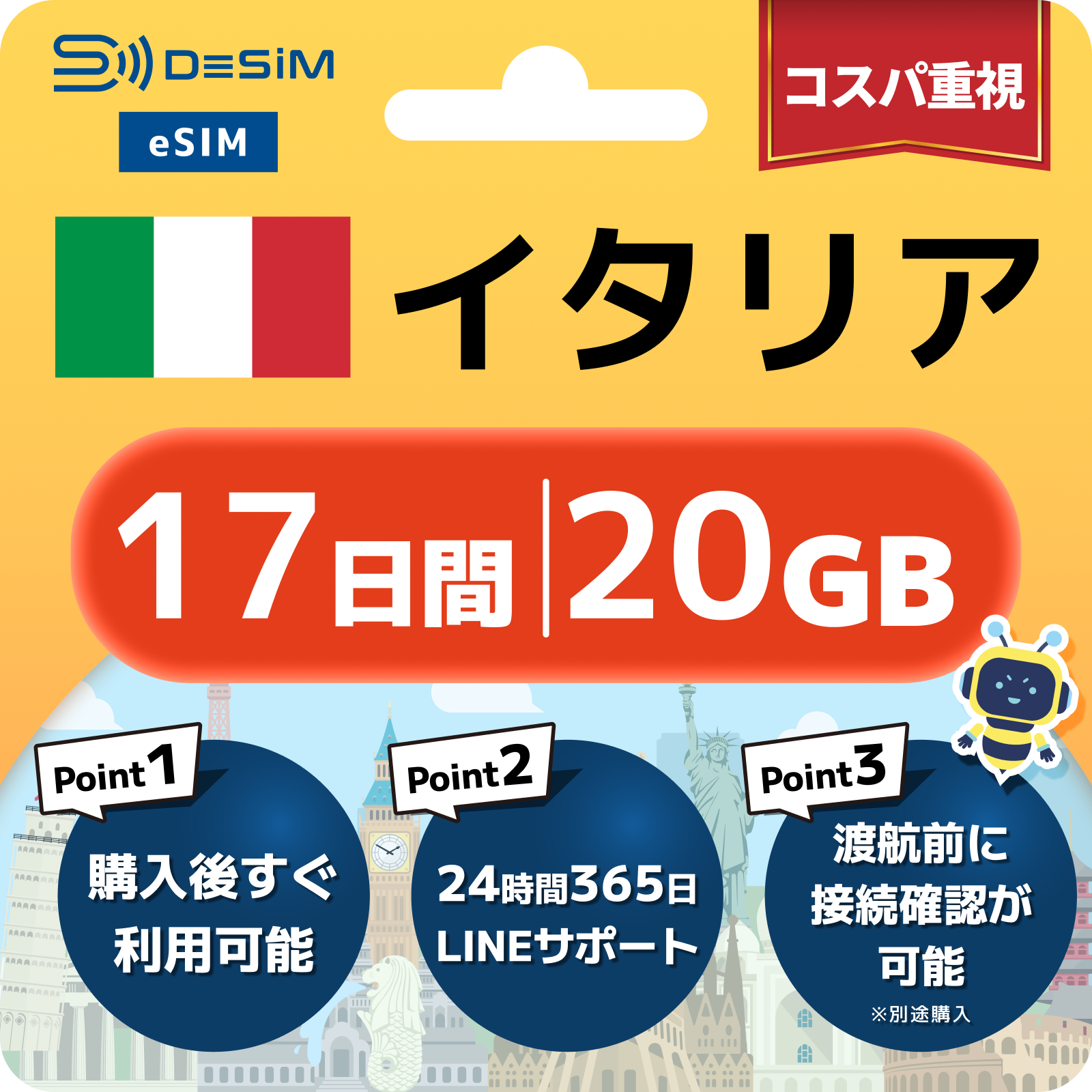 - eSIMのアクティベーションは目的地へ着いてからでも行えますが、インストール作業にはWi-Fi接続が必要ですのでご注意ください。