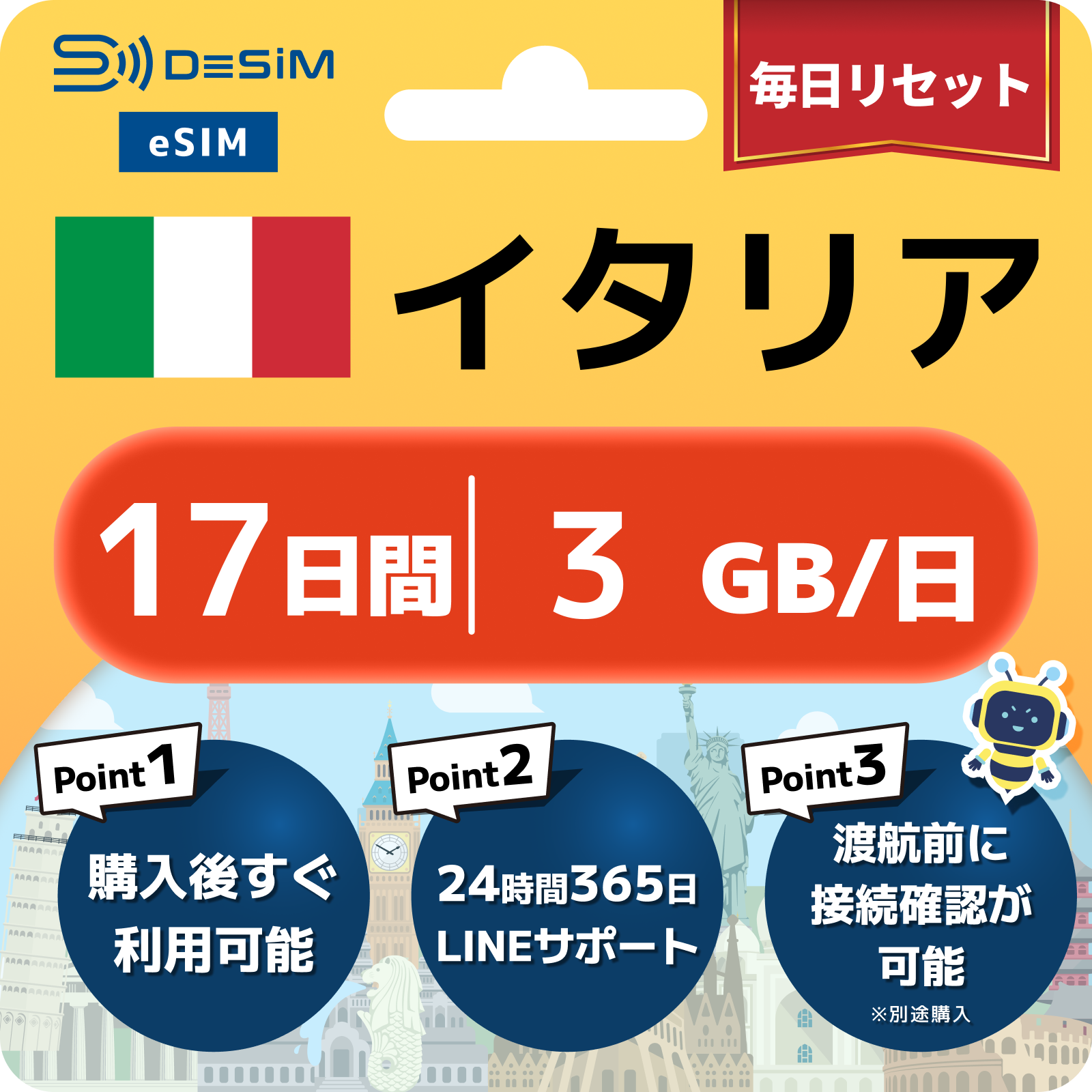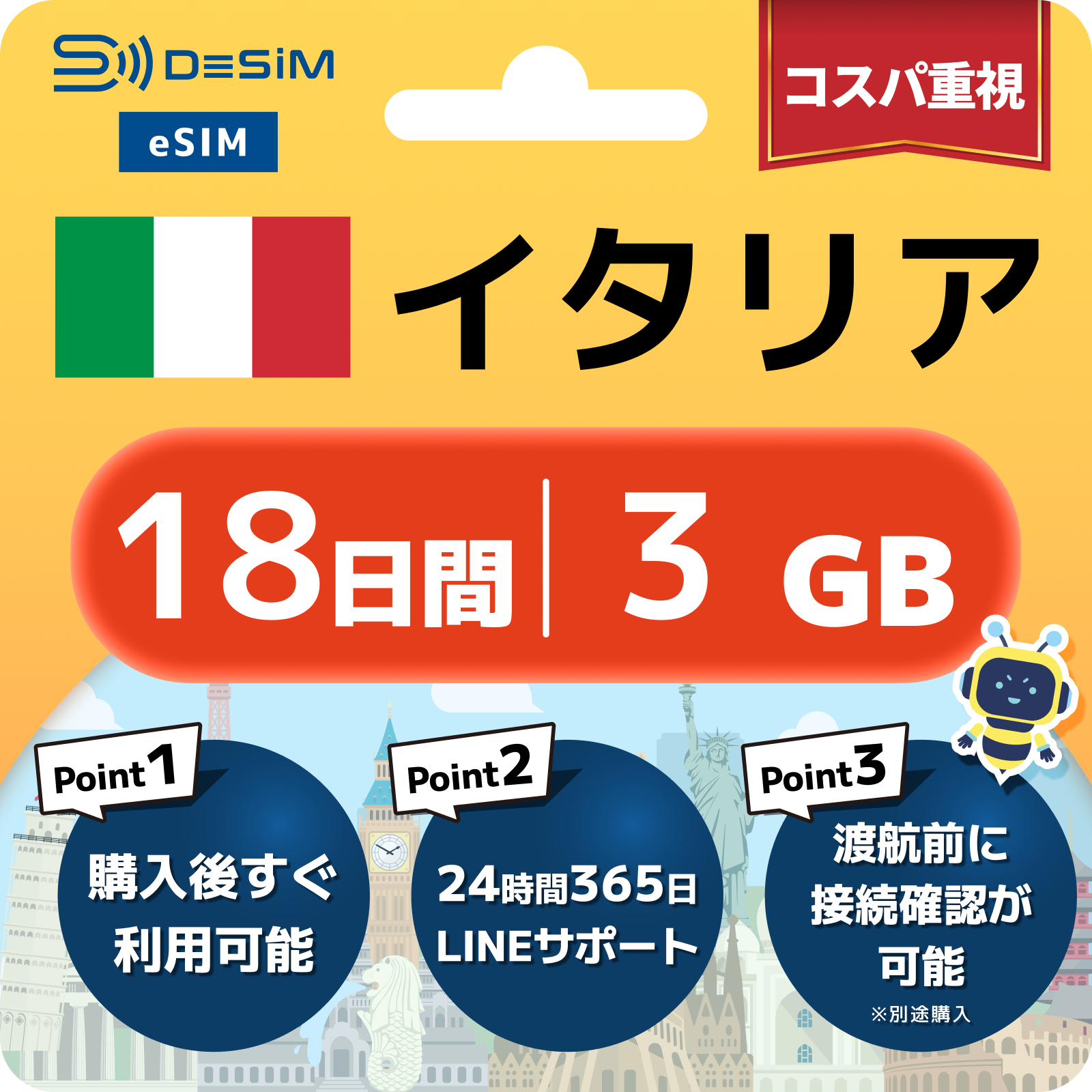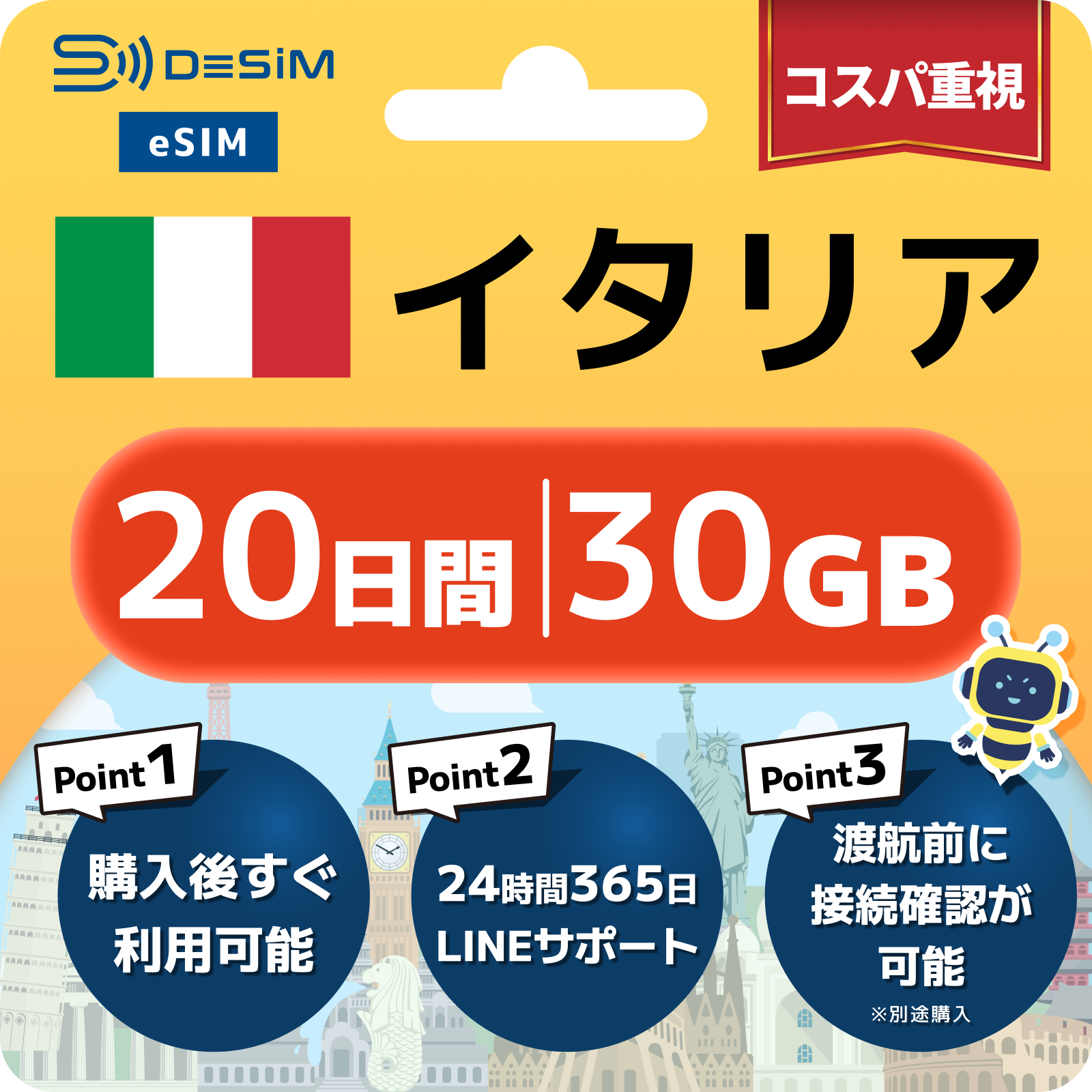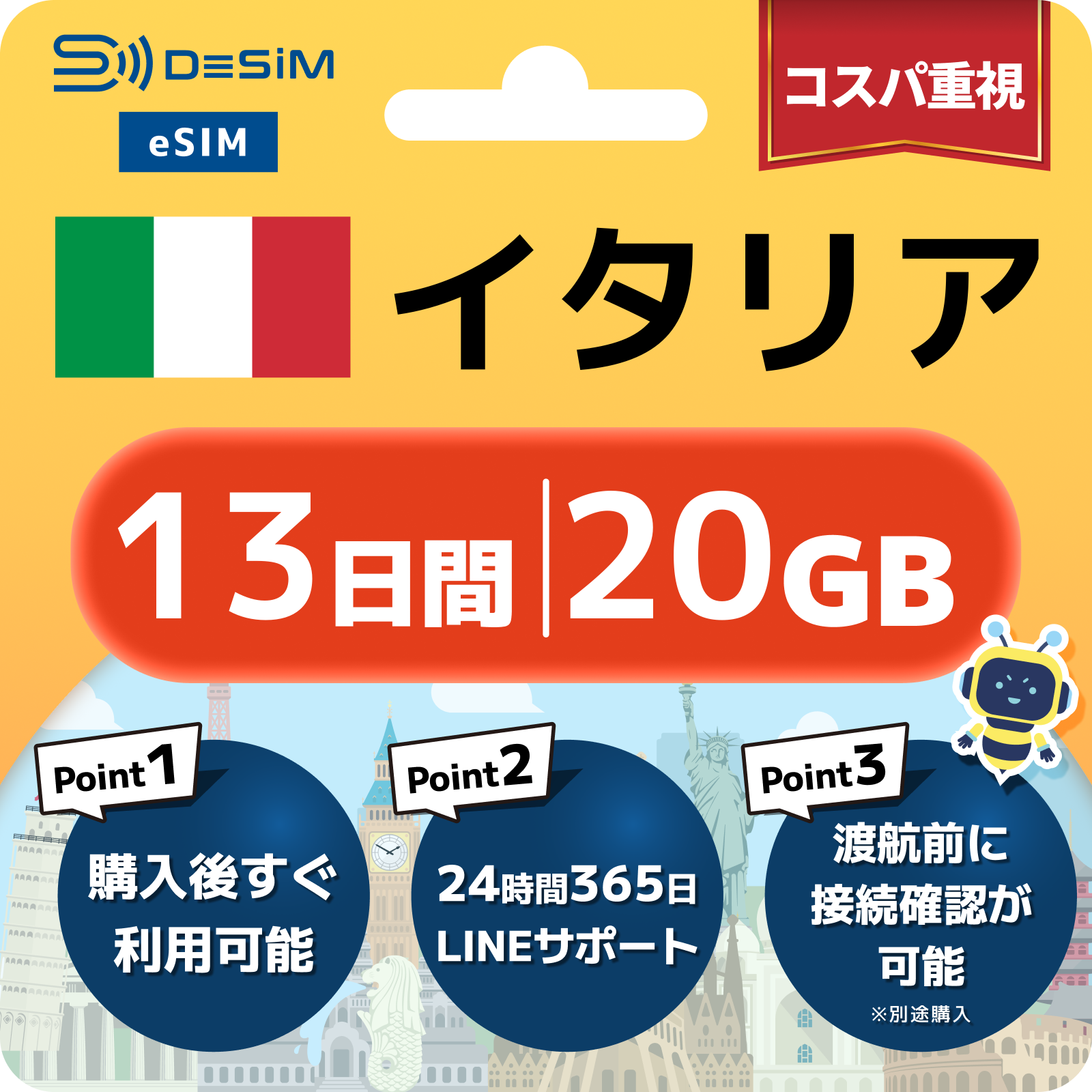 - eSIMのアクティベーションは目的地へ着いてからでも行えますが、インストール作業にはWi-Fi接続が必要ですのでご注意ください。