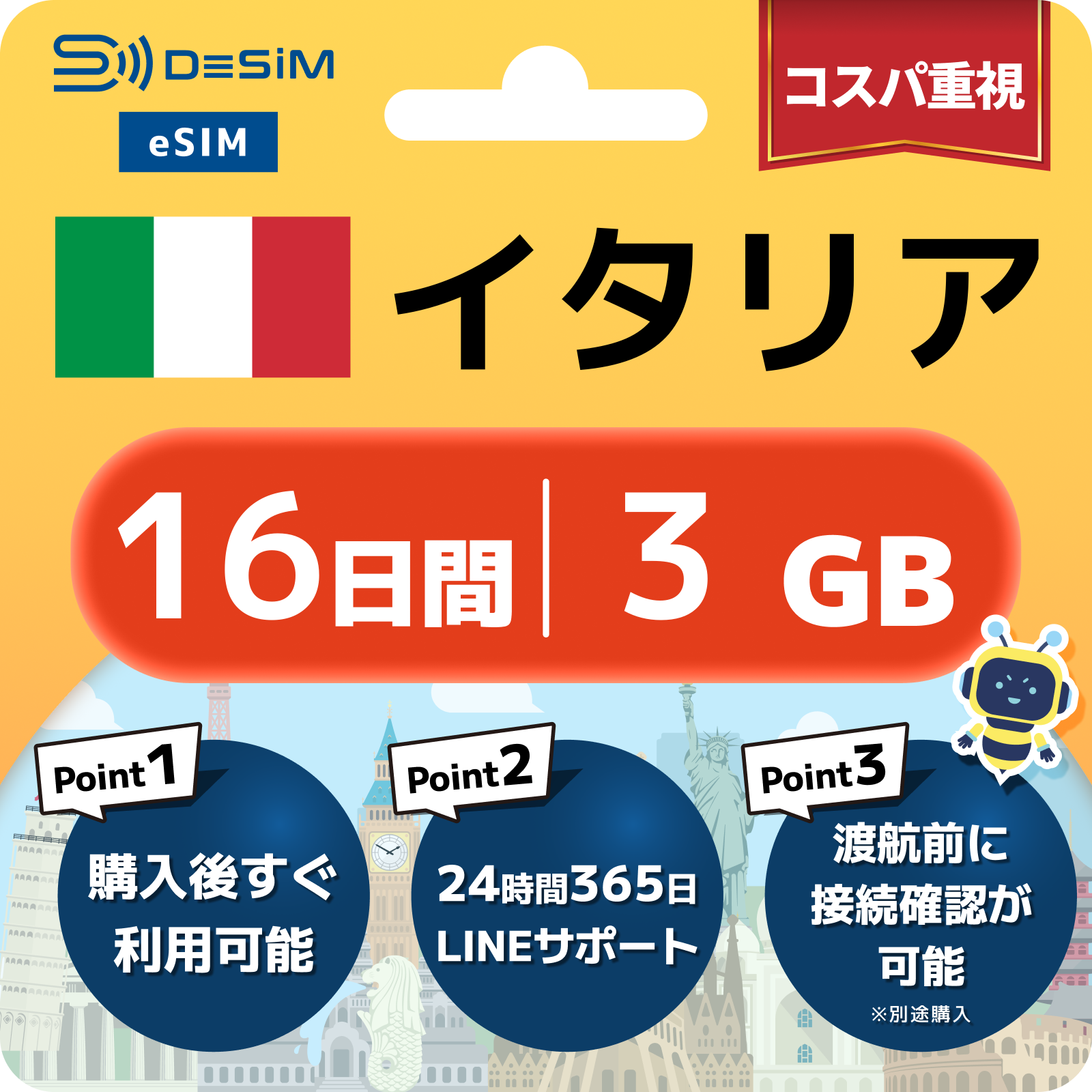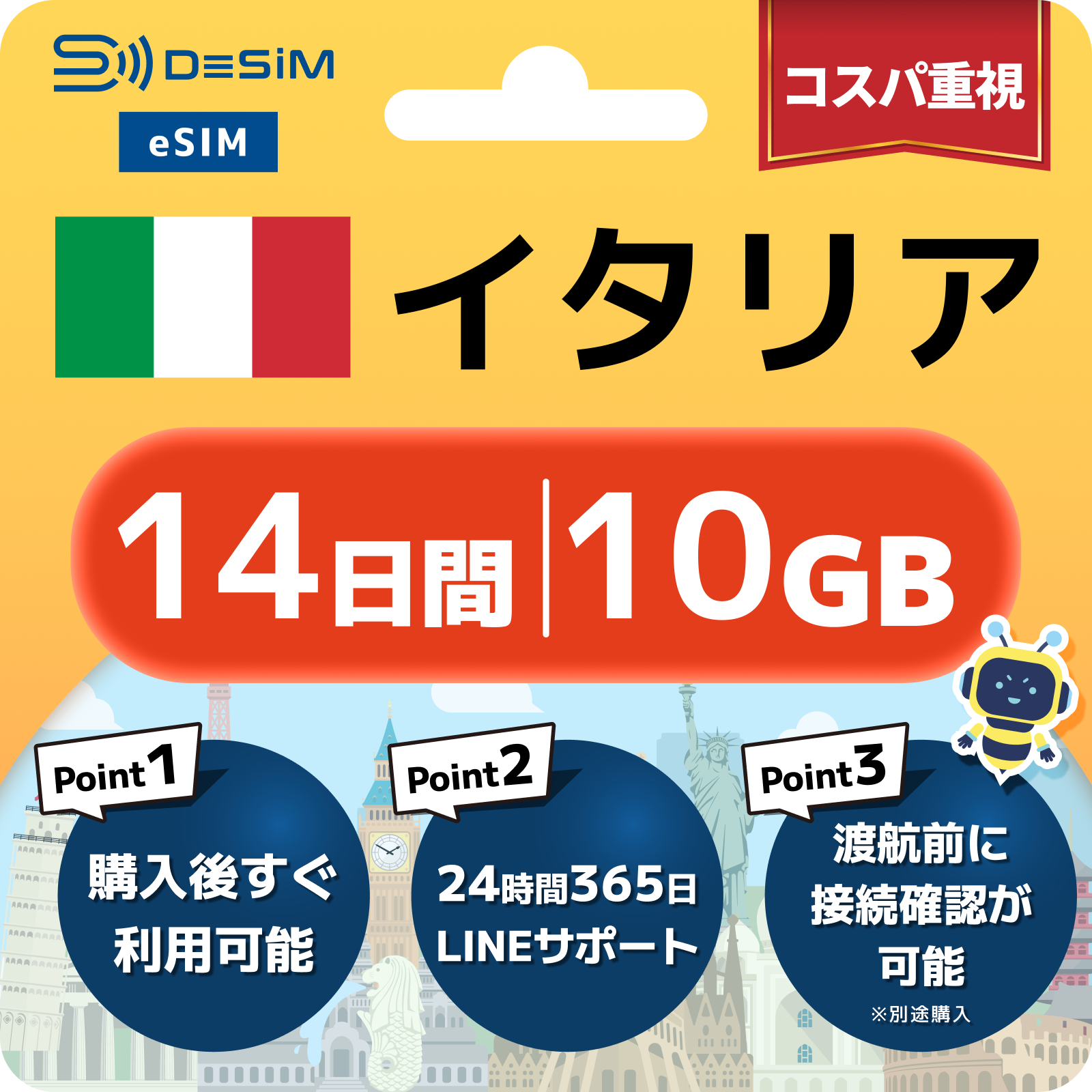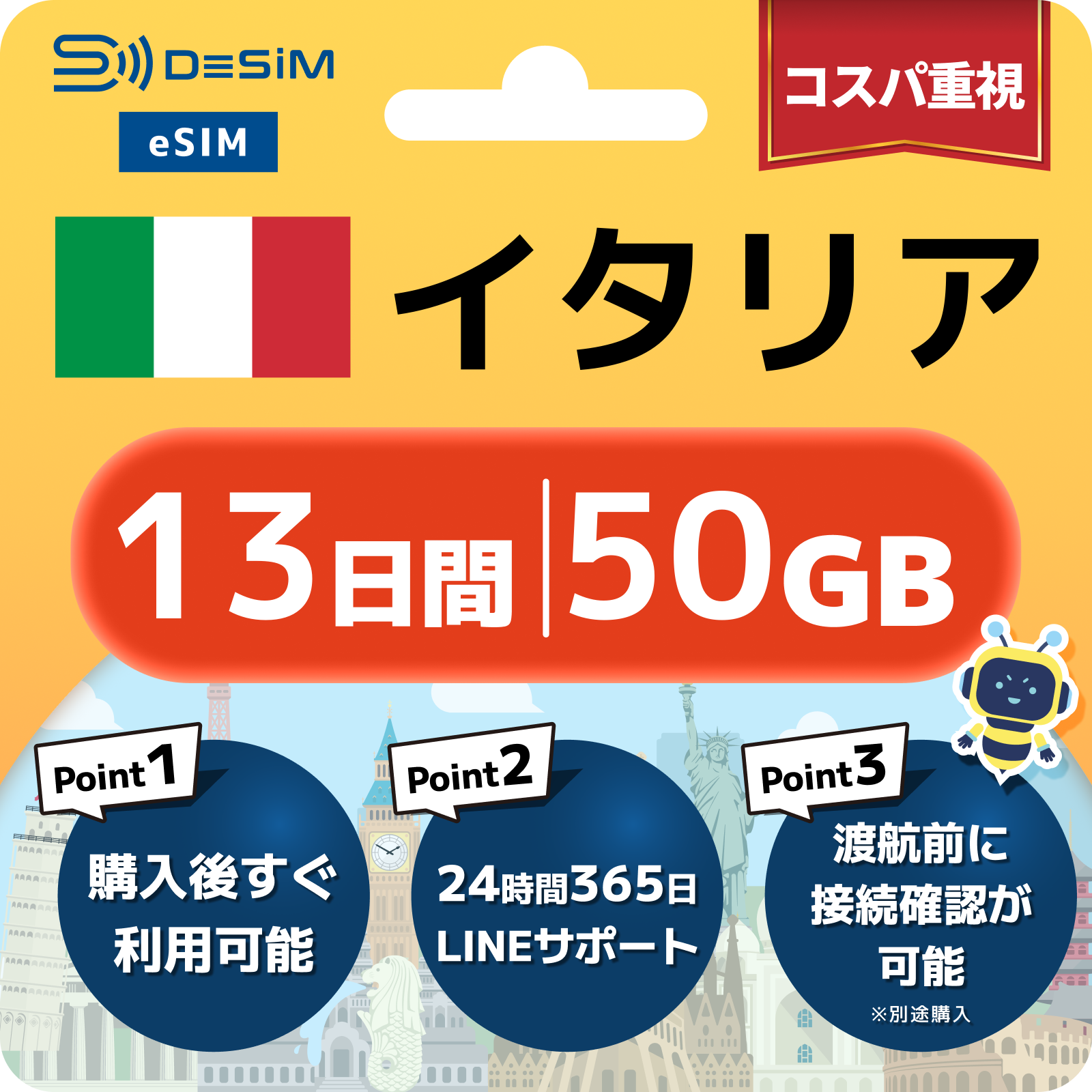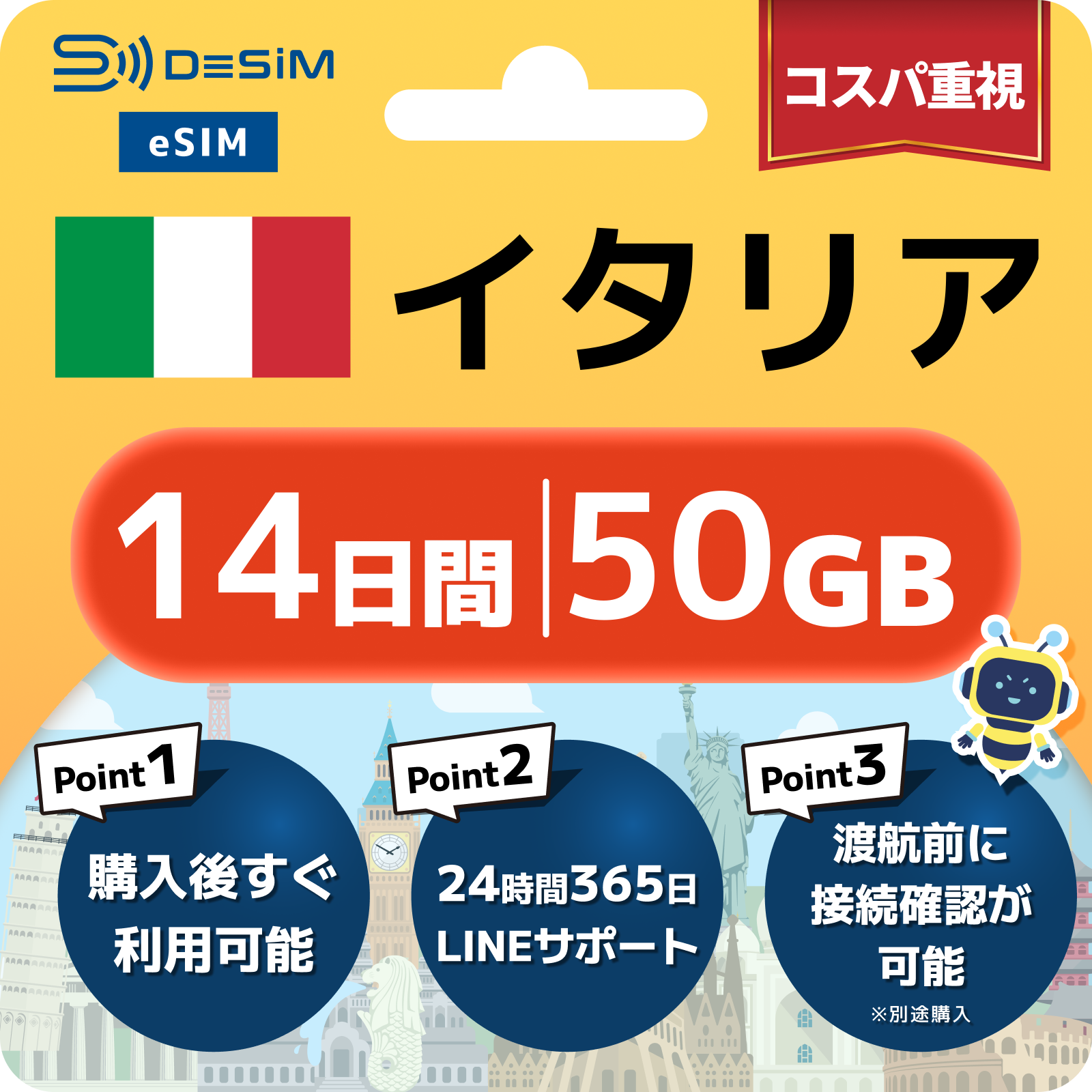 イタリア eSIM(11~20日間)500MB~50GB選択可能 即日開通 テザリング対応
