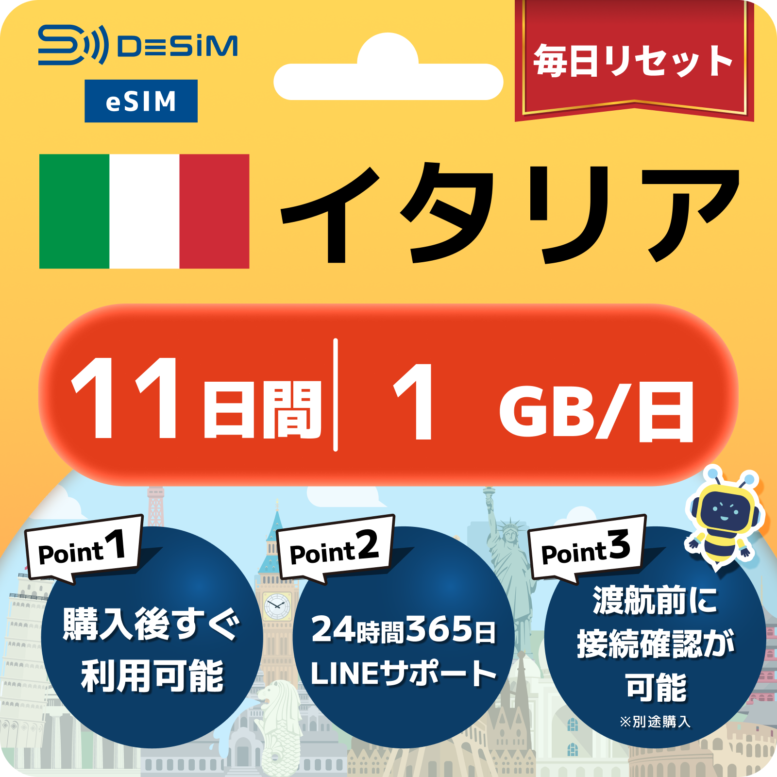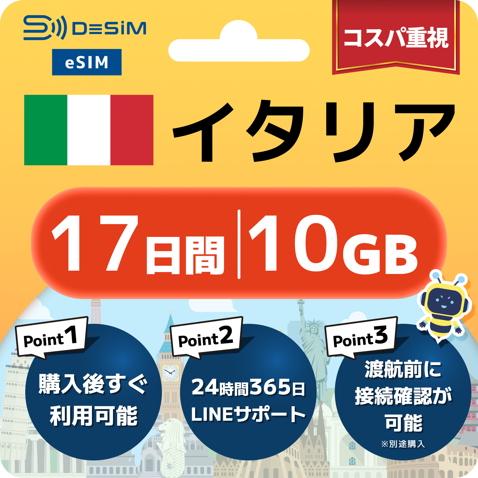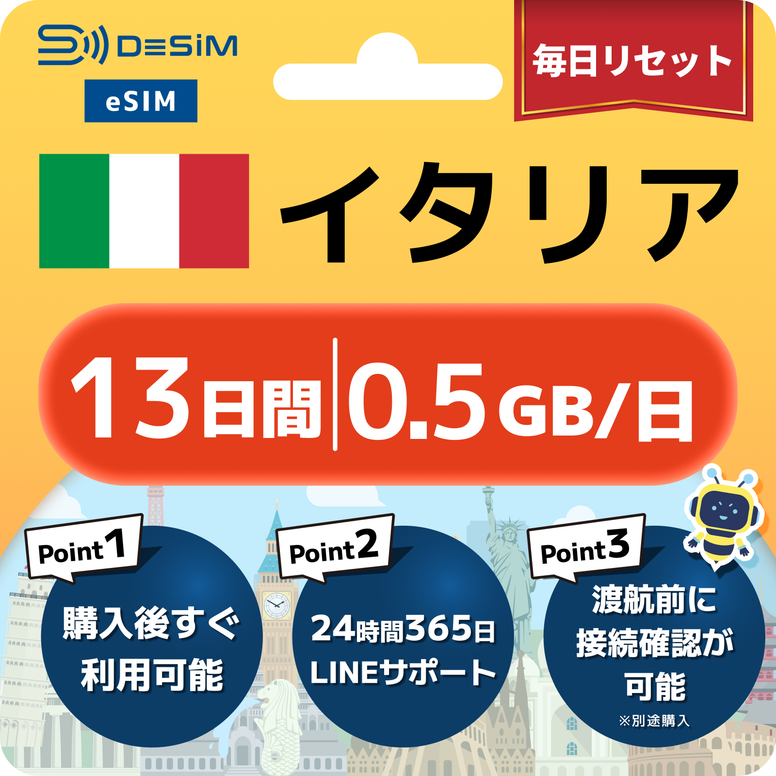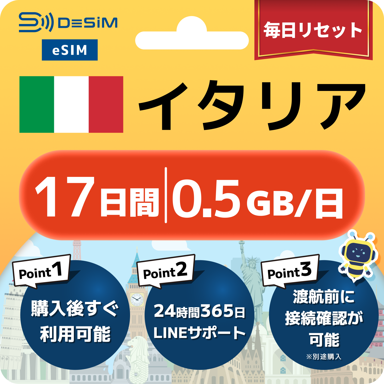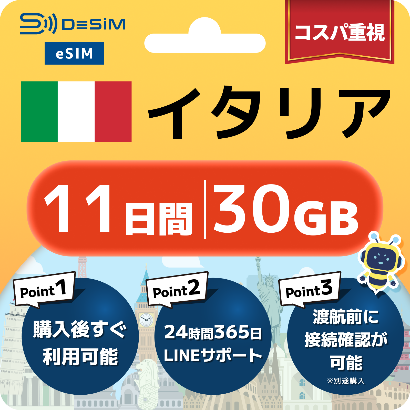 イタリア eSIM(11~20日間)500MB~50GB選択可能 即日開通 テザリング対応