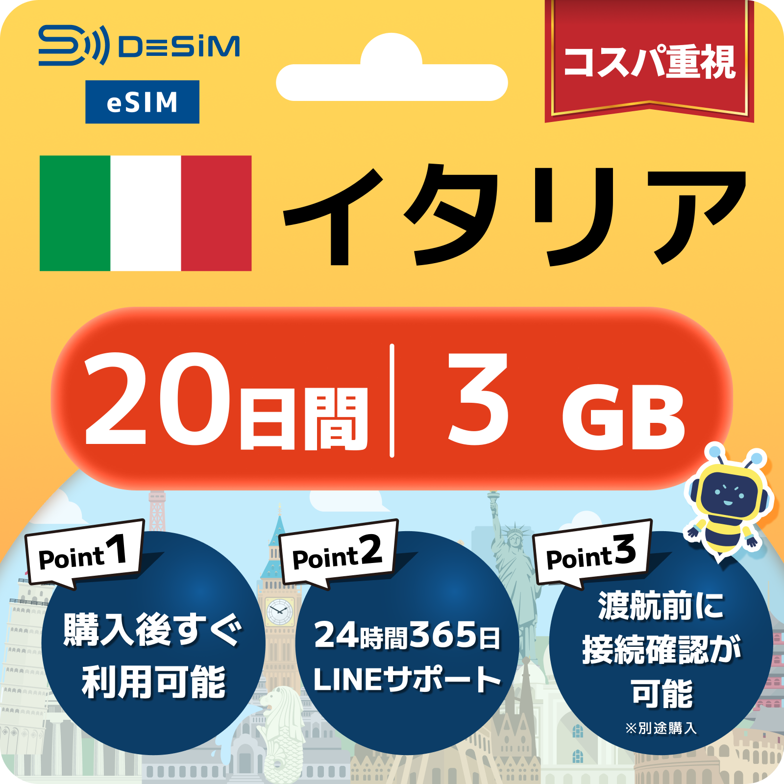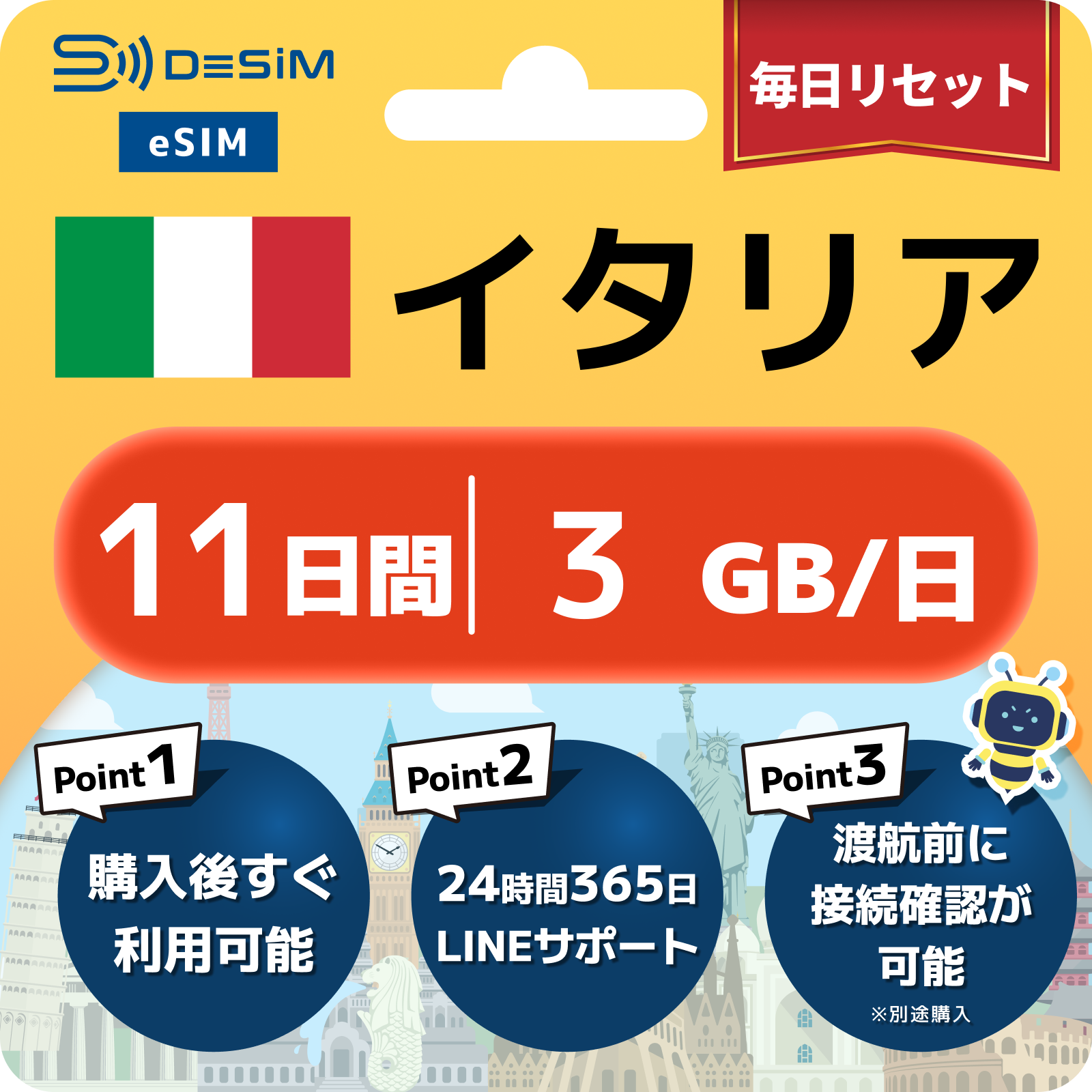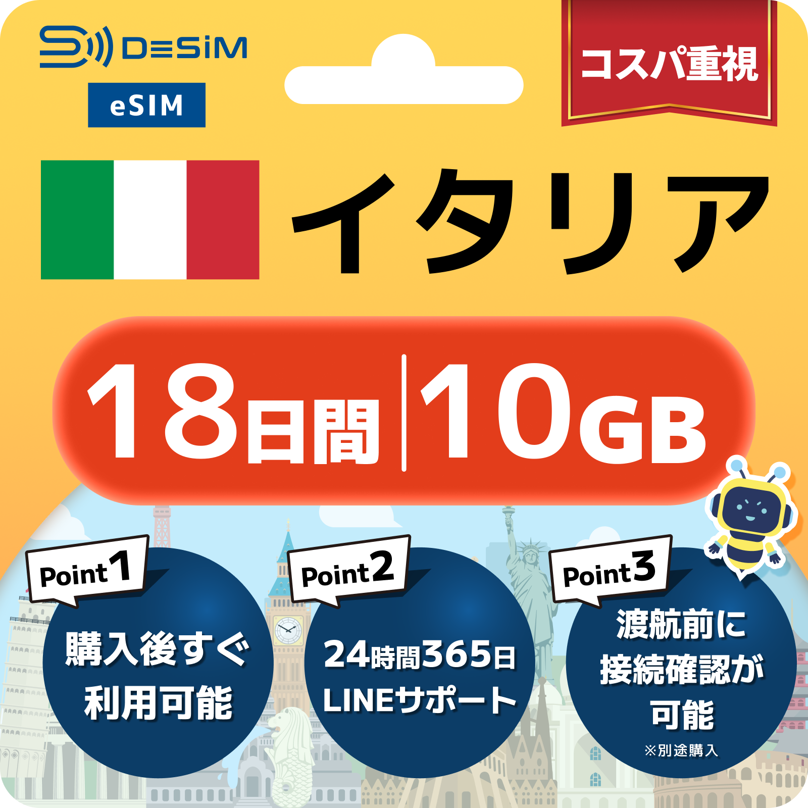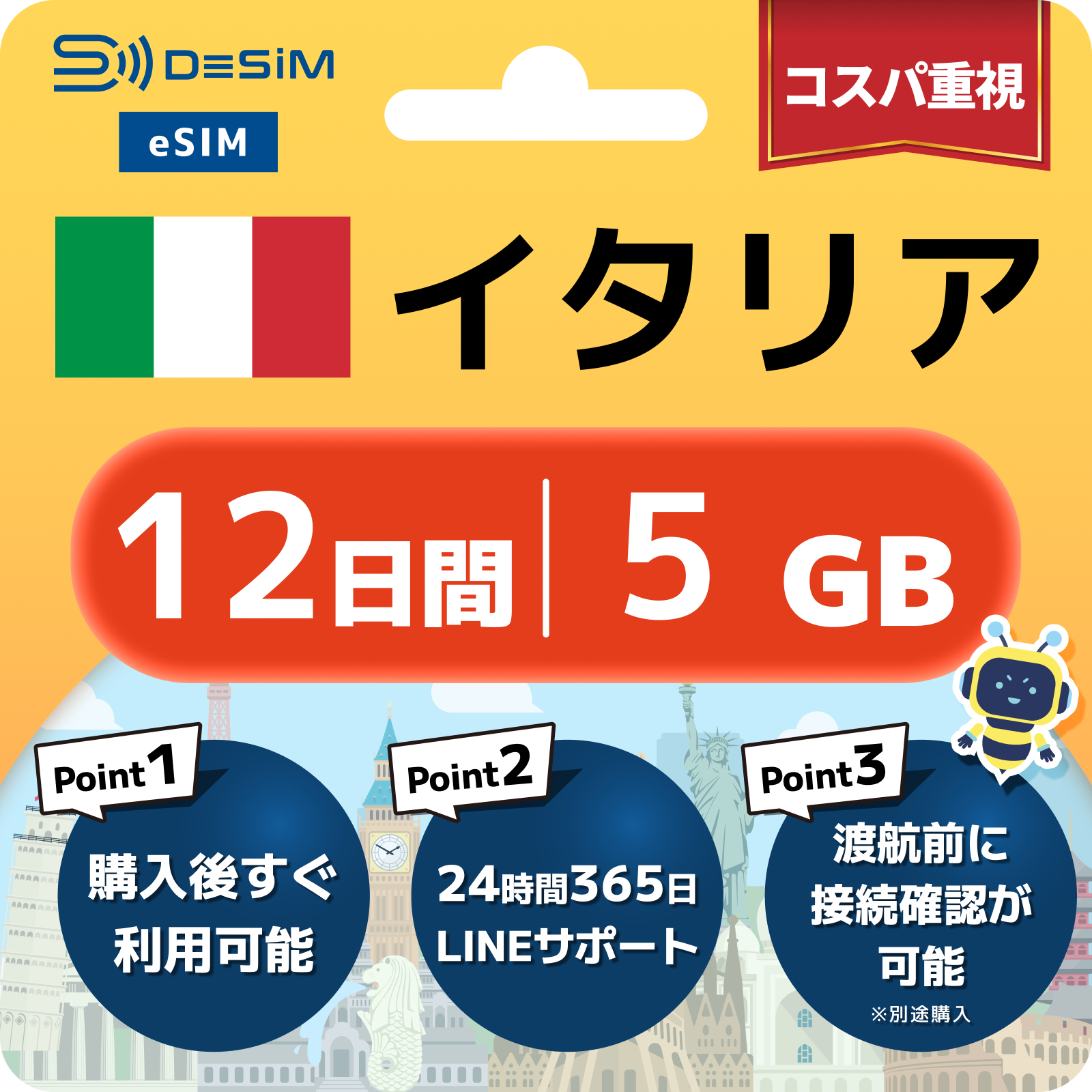 イタリア eSIM(11~20日間)500MB~50GB選択可能 即日開通 テザリング対応