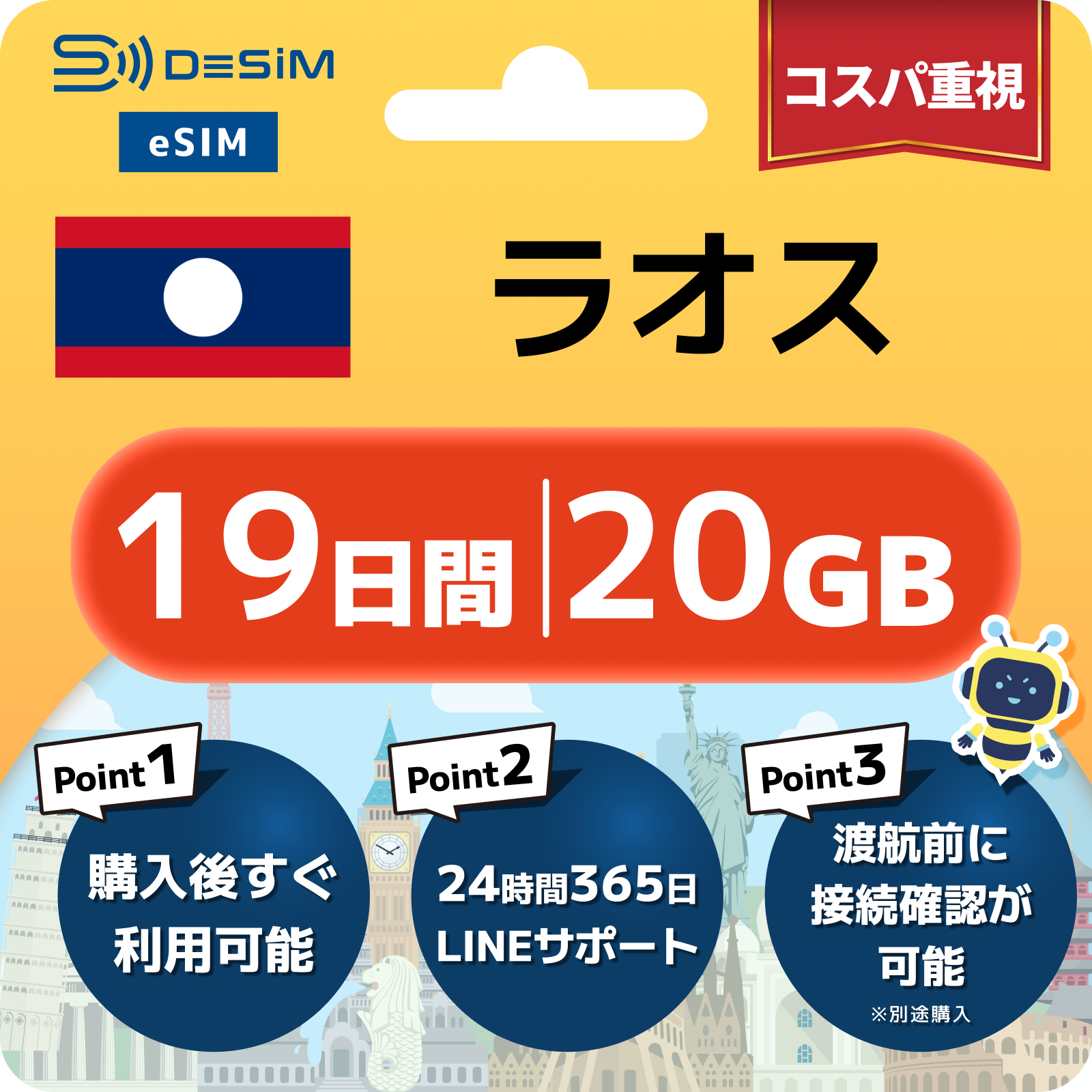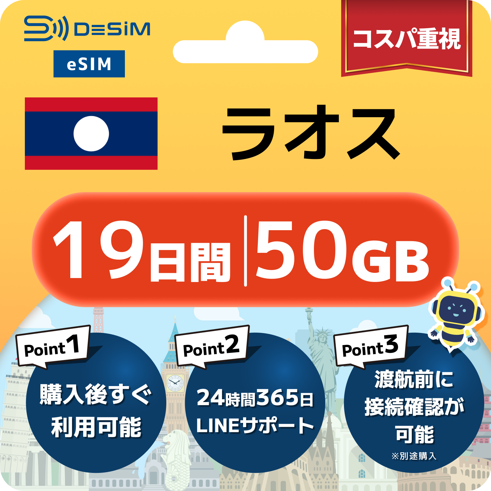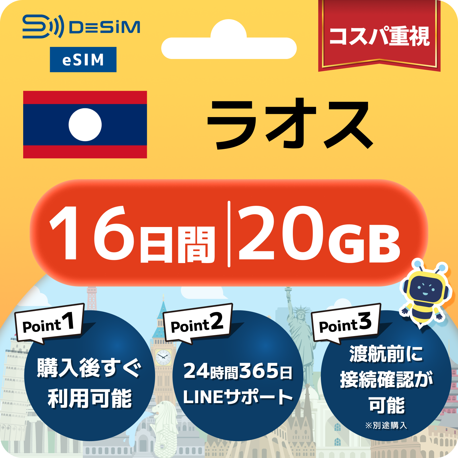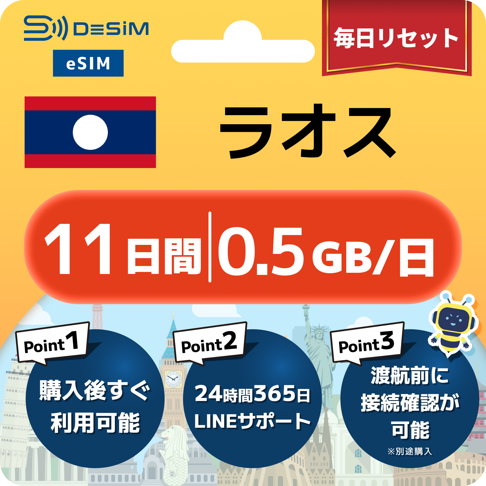 ラオス eSIM(11~20日間)500MB~50GB選択可能 即日開通 テザリング対応