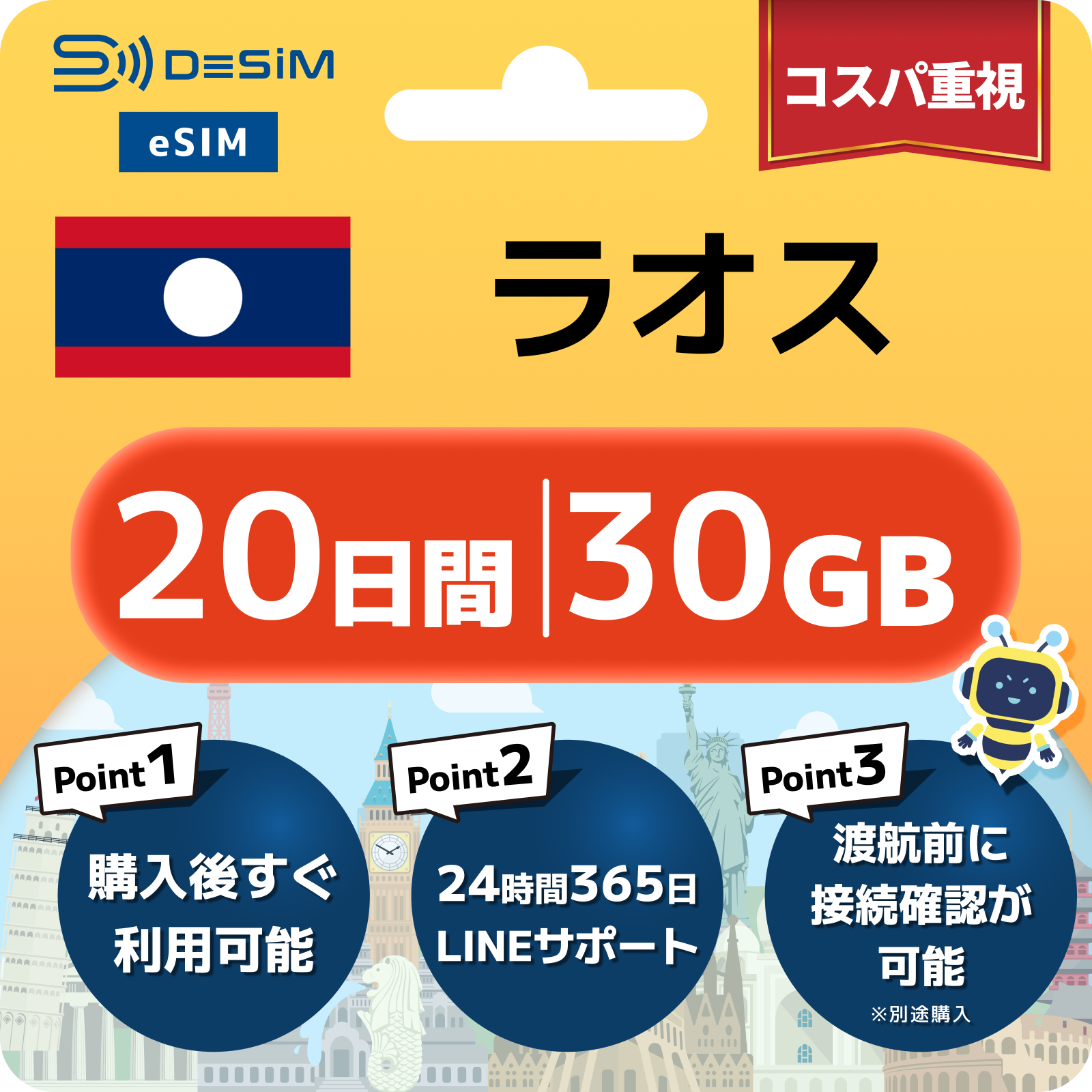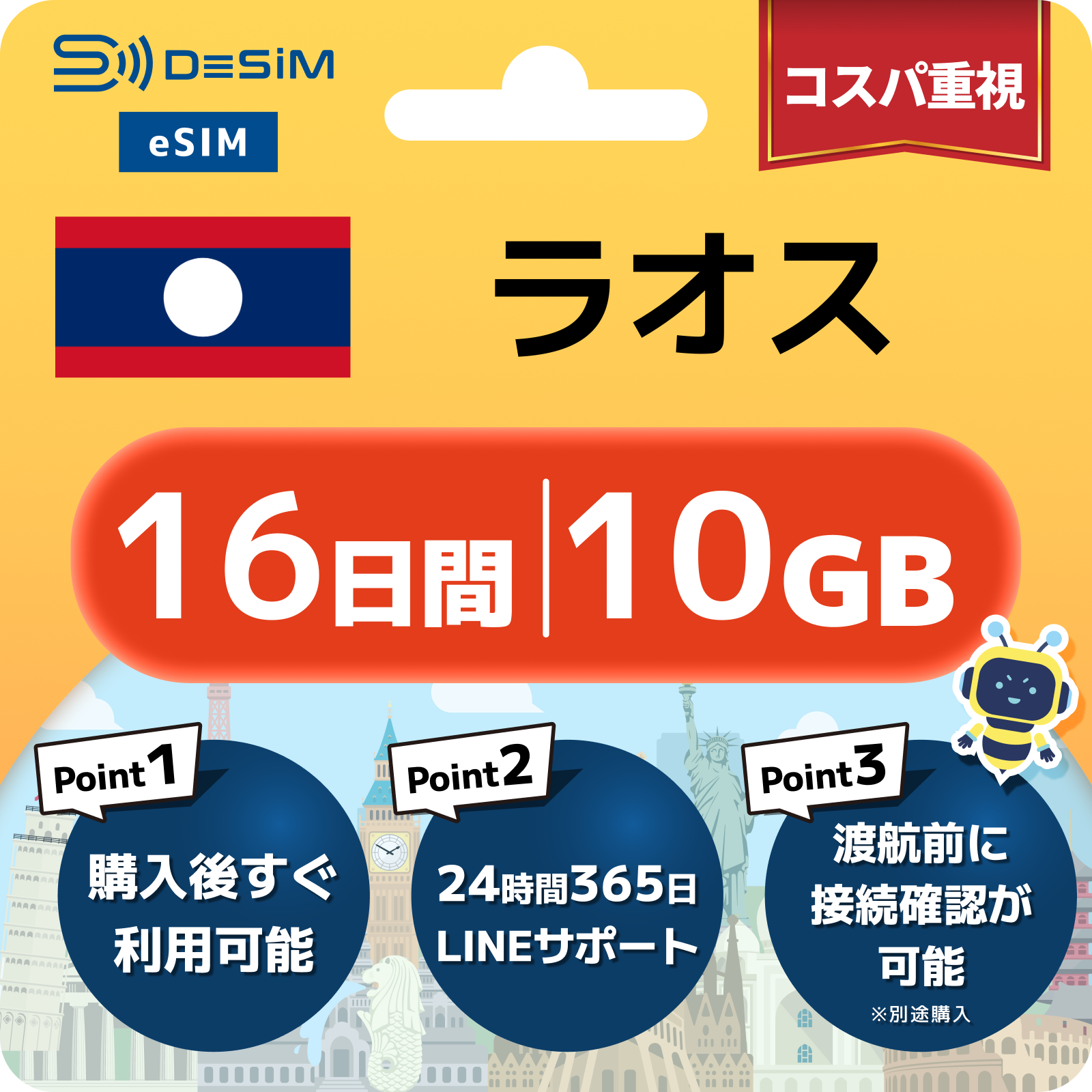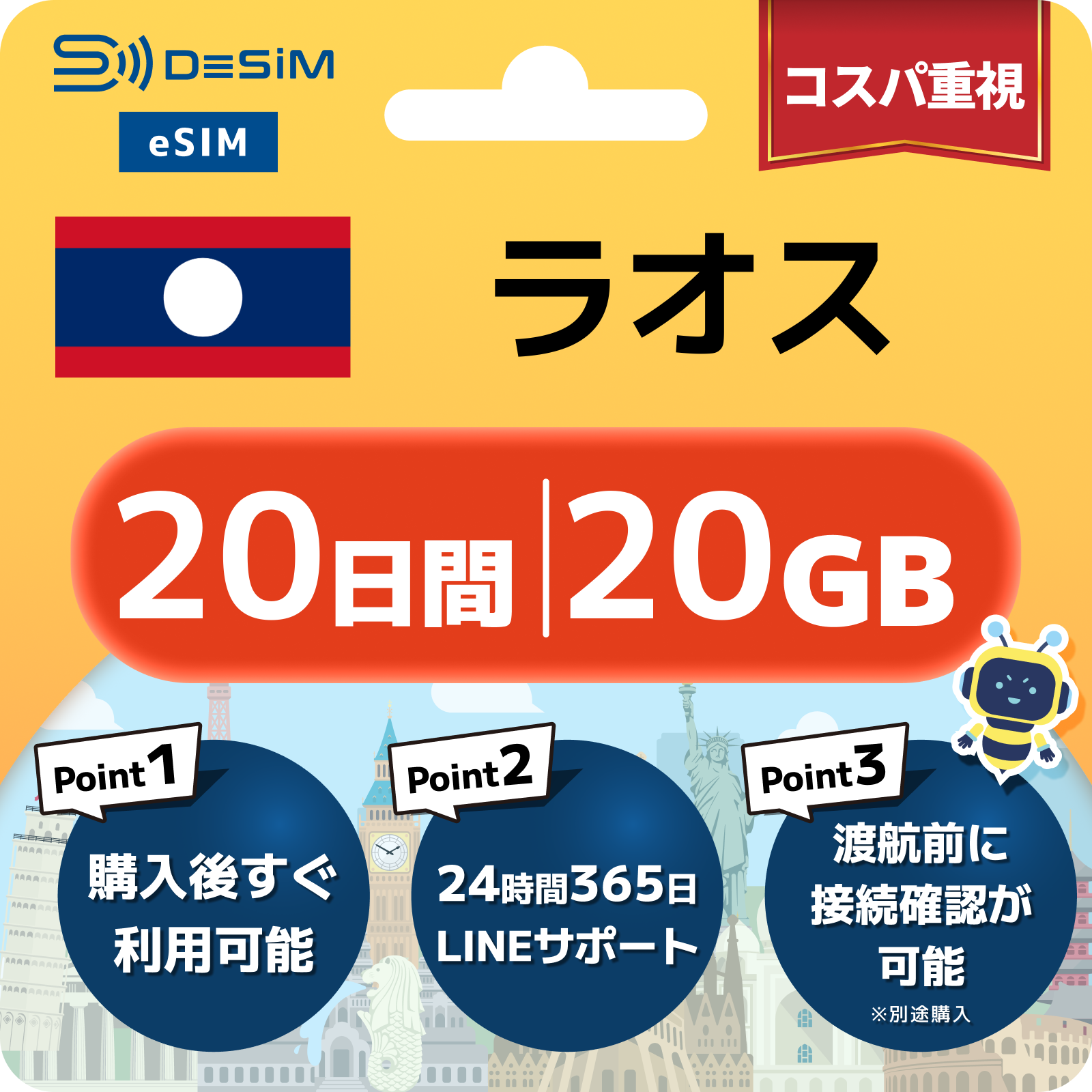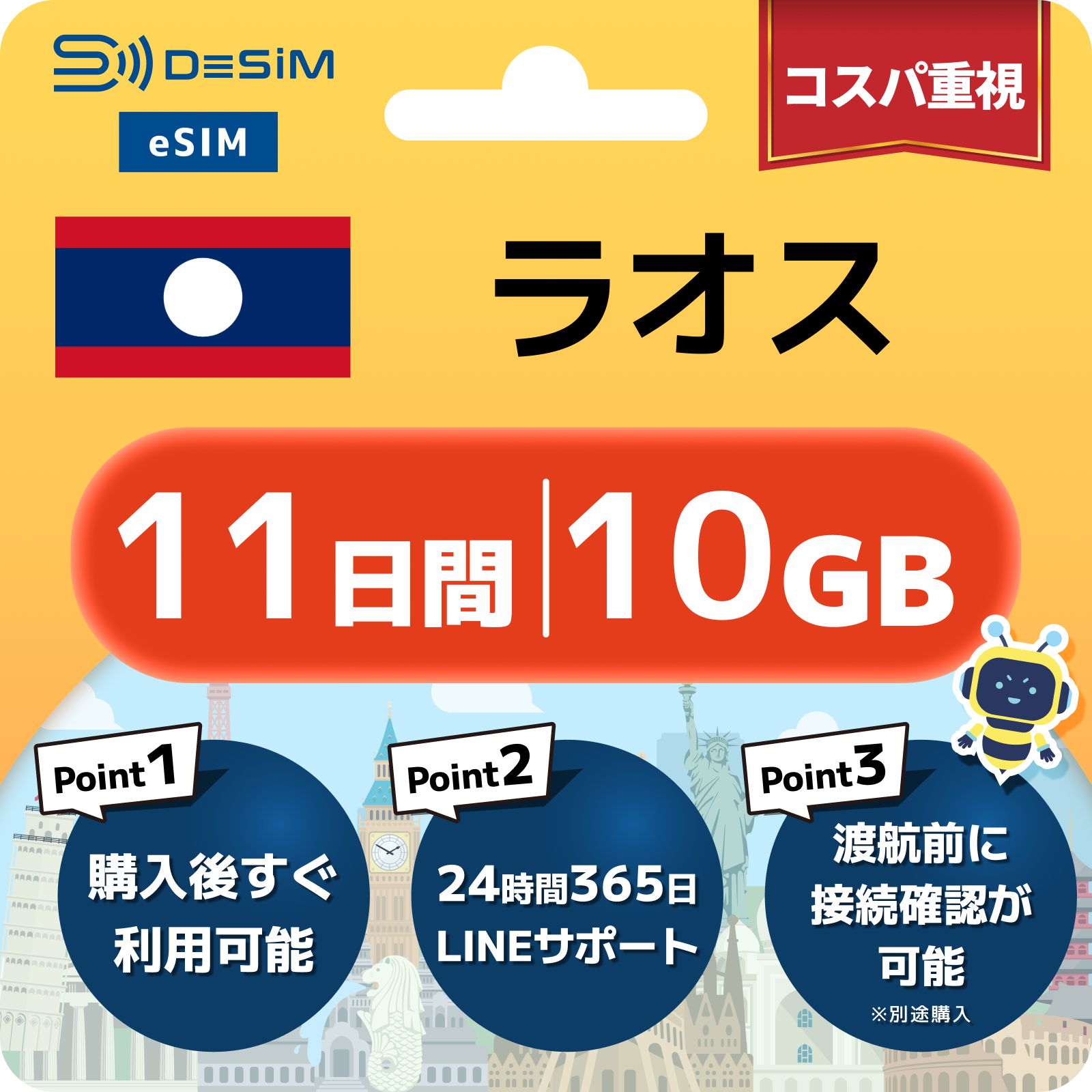 ラオス eSIM(11~20日間)500MB~50GB選択可能 即日開通 テザリング対応