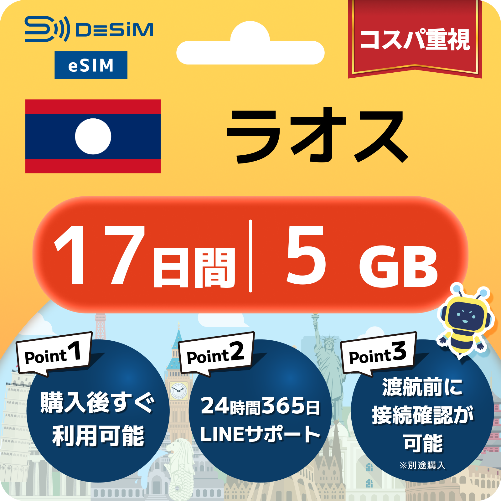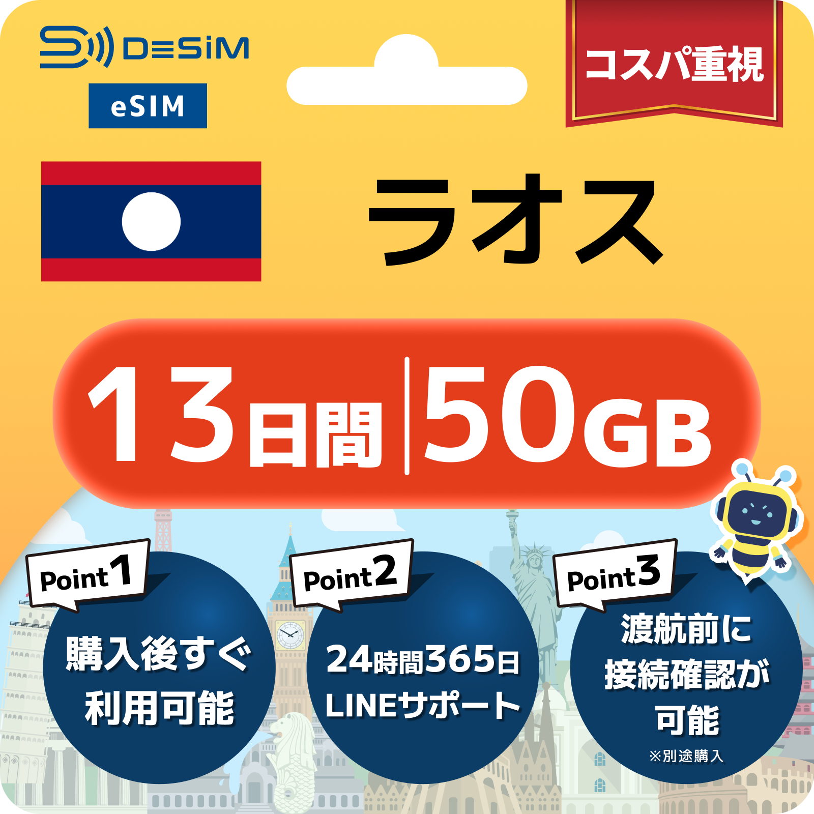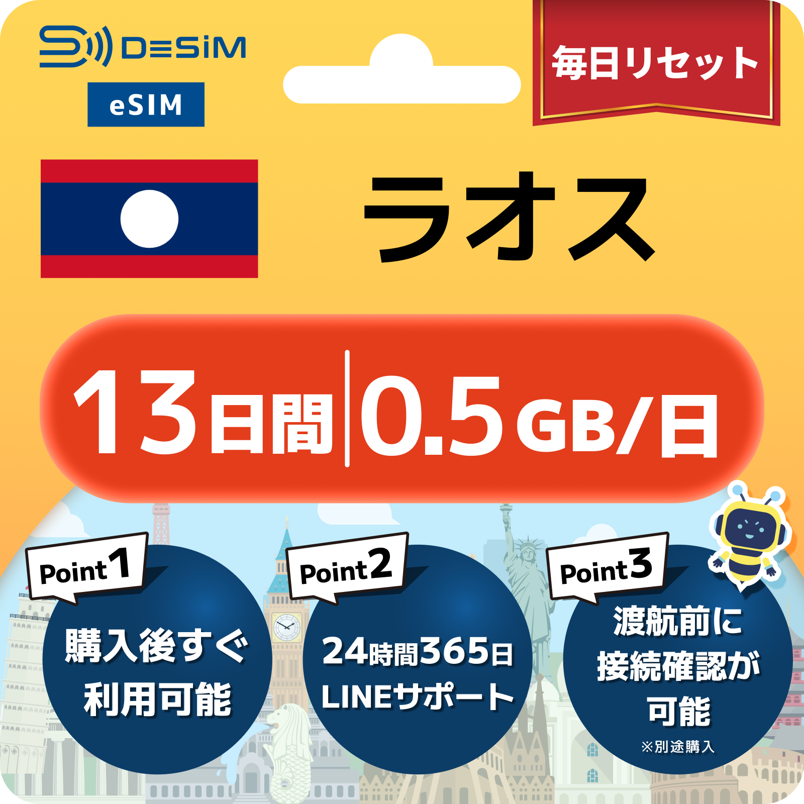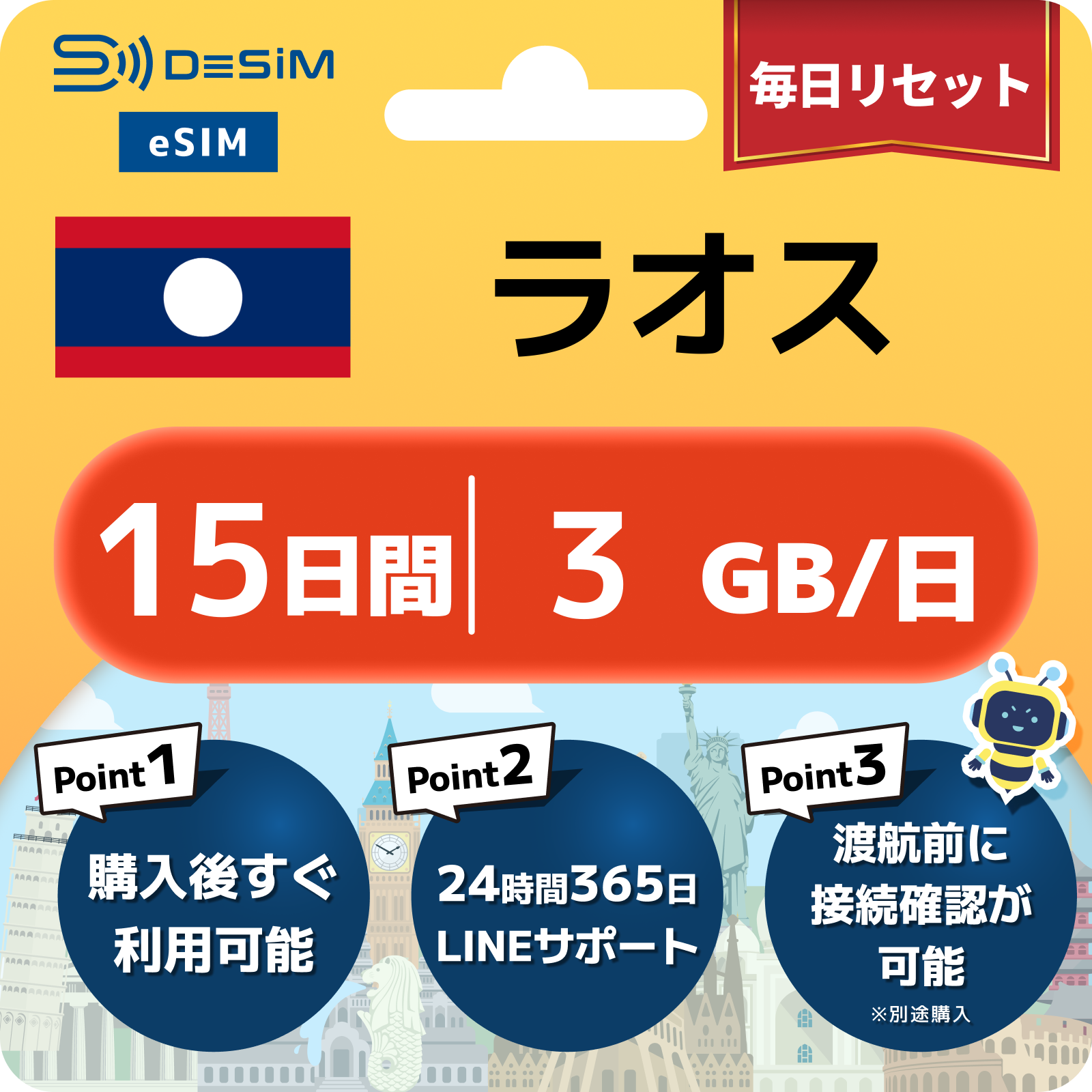 ラオス eSIM(11~20日間)500MB~50GB選択可能 即日開通 テザリング対応