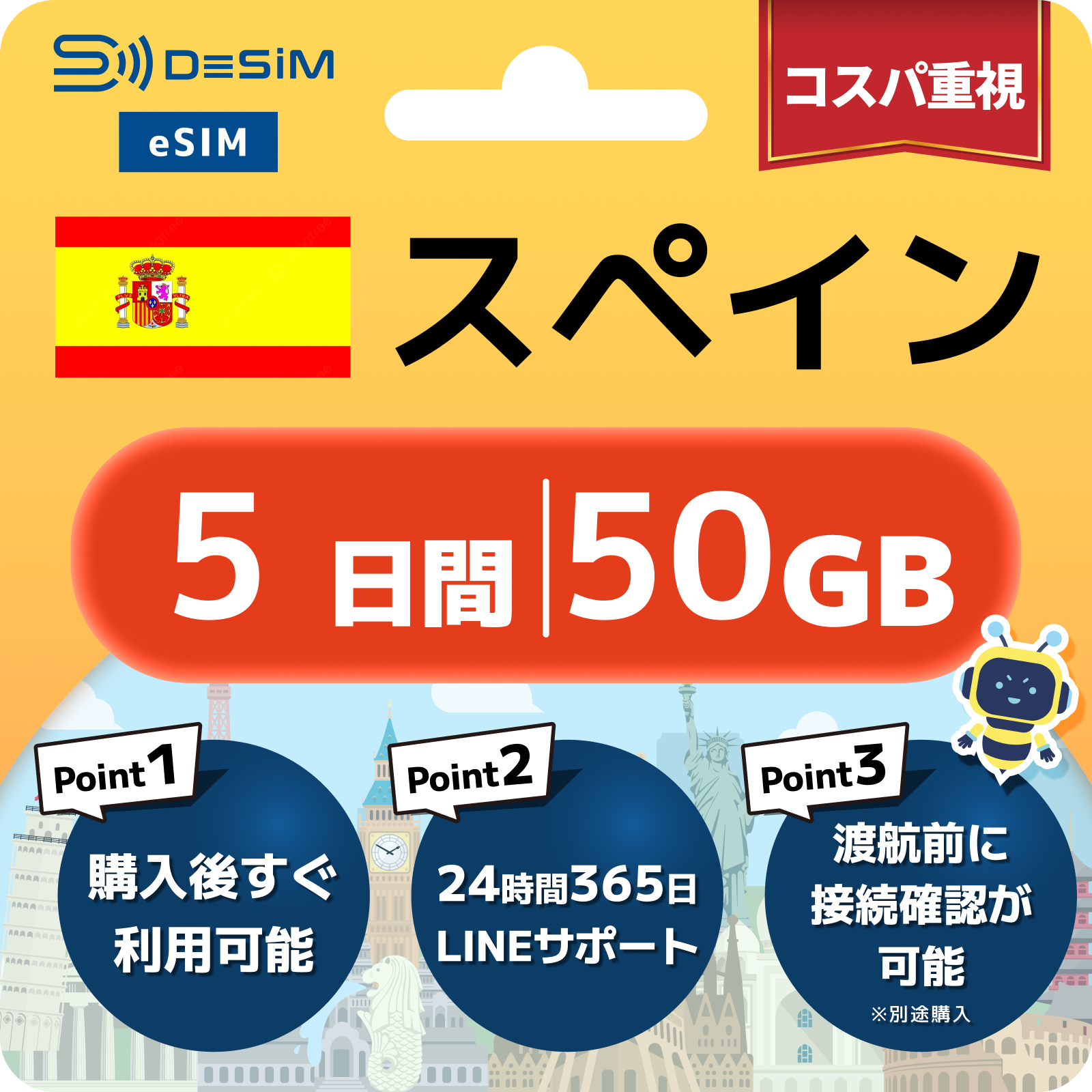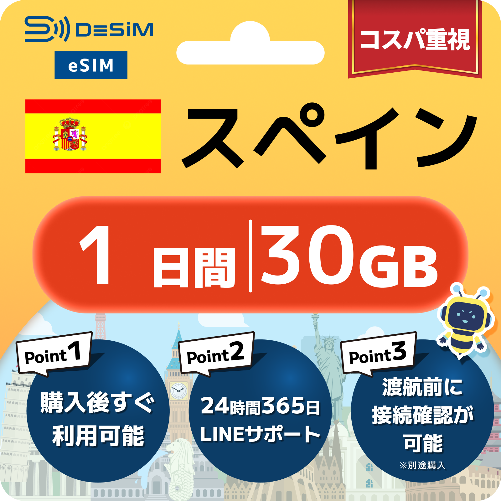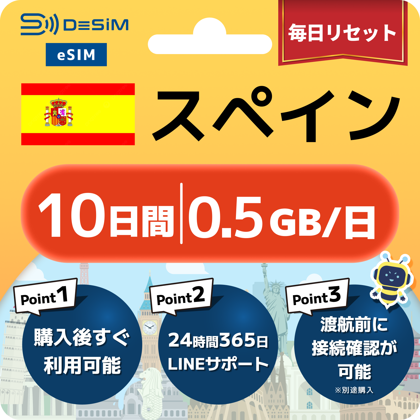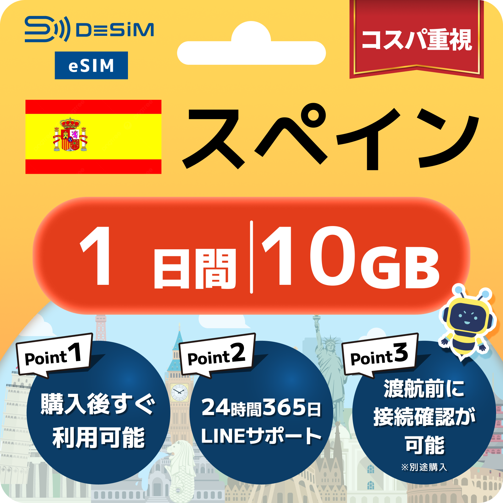 スペイン eSIM( 1~10日間)500MB~50GB選択可能 即日開通 テザリング対応