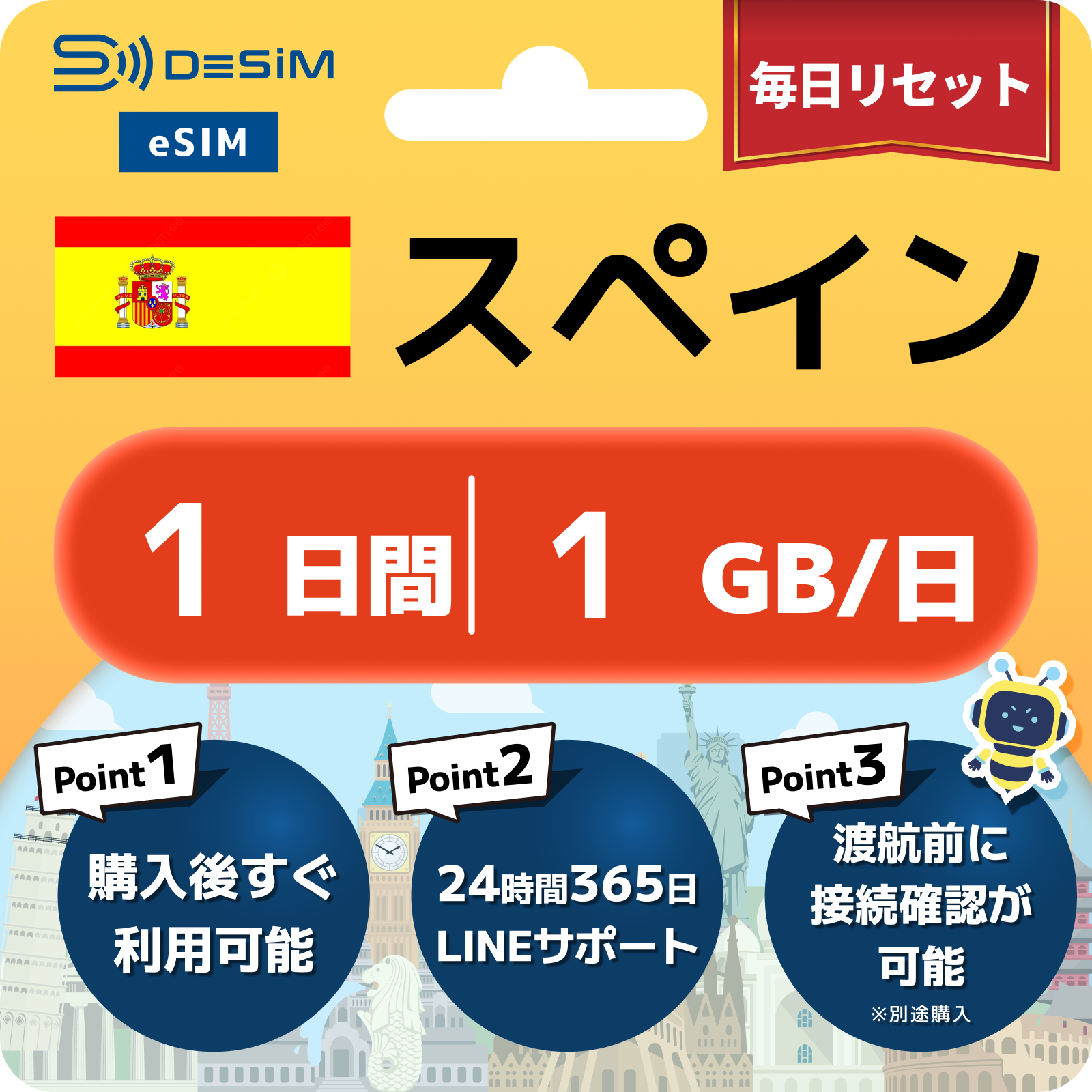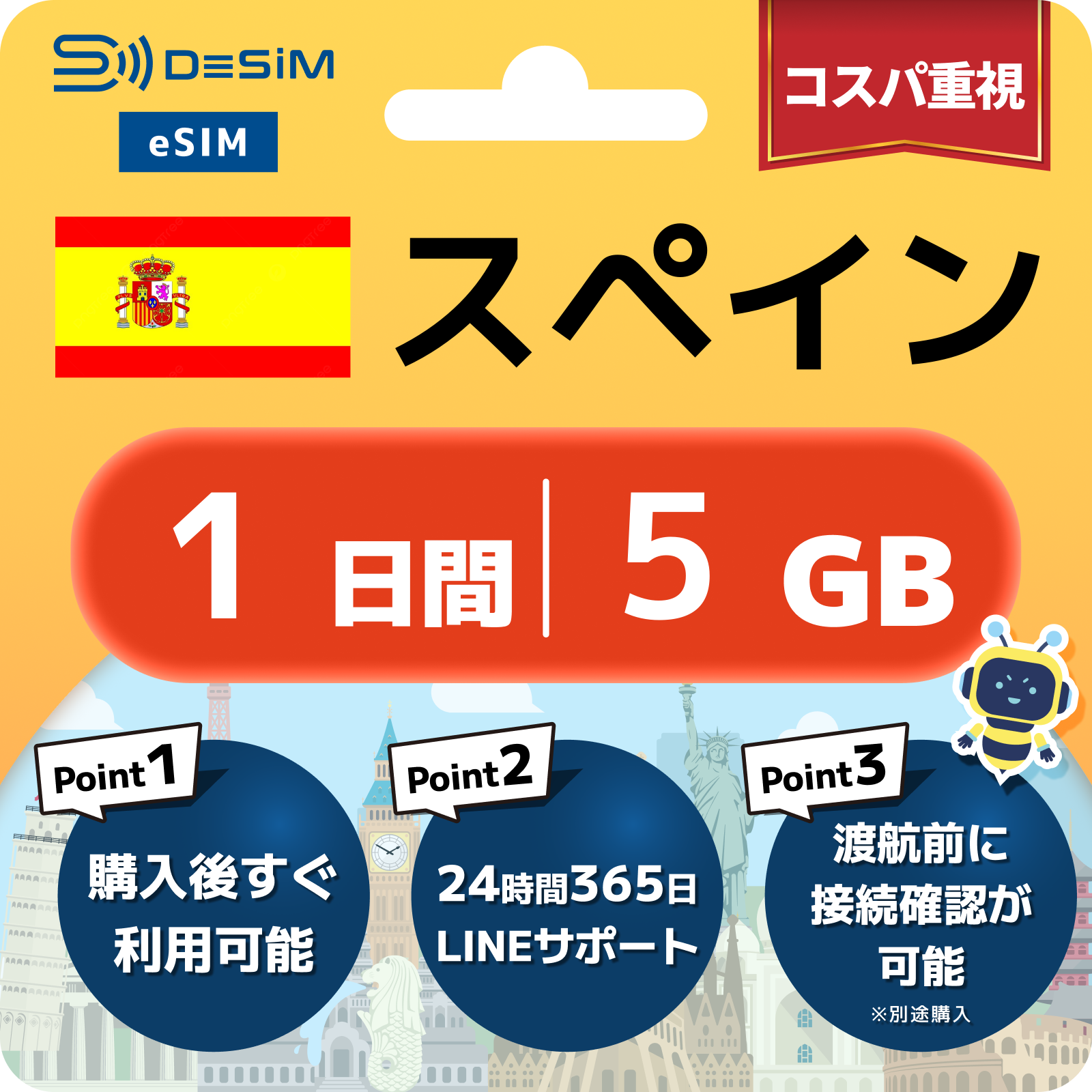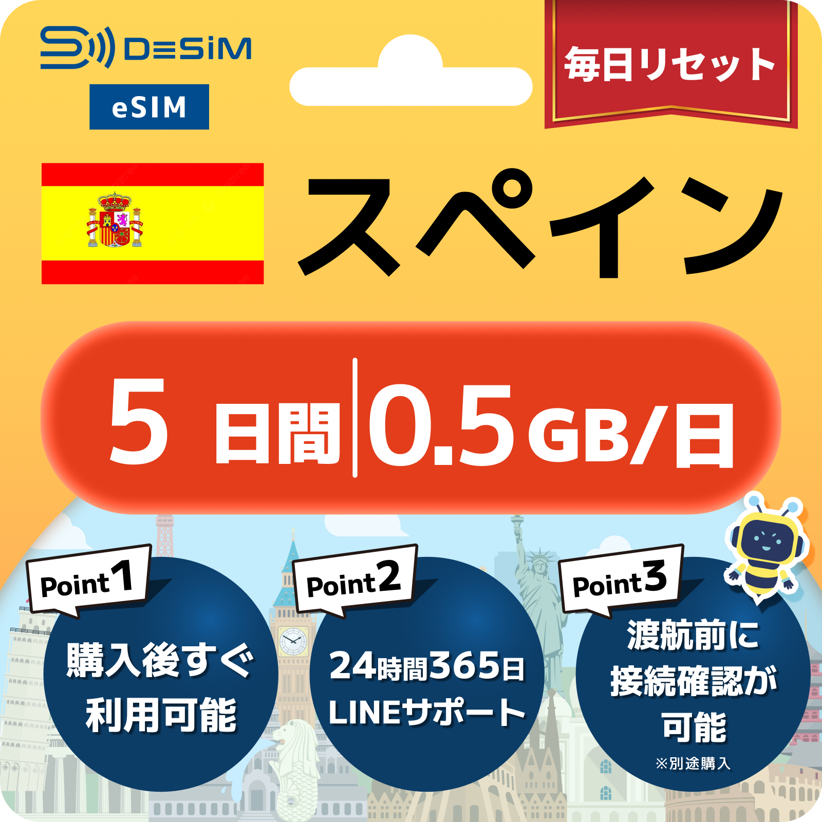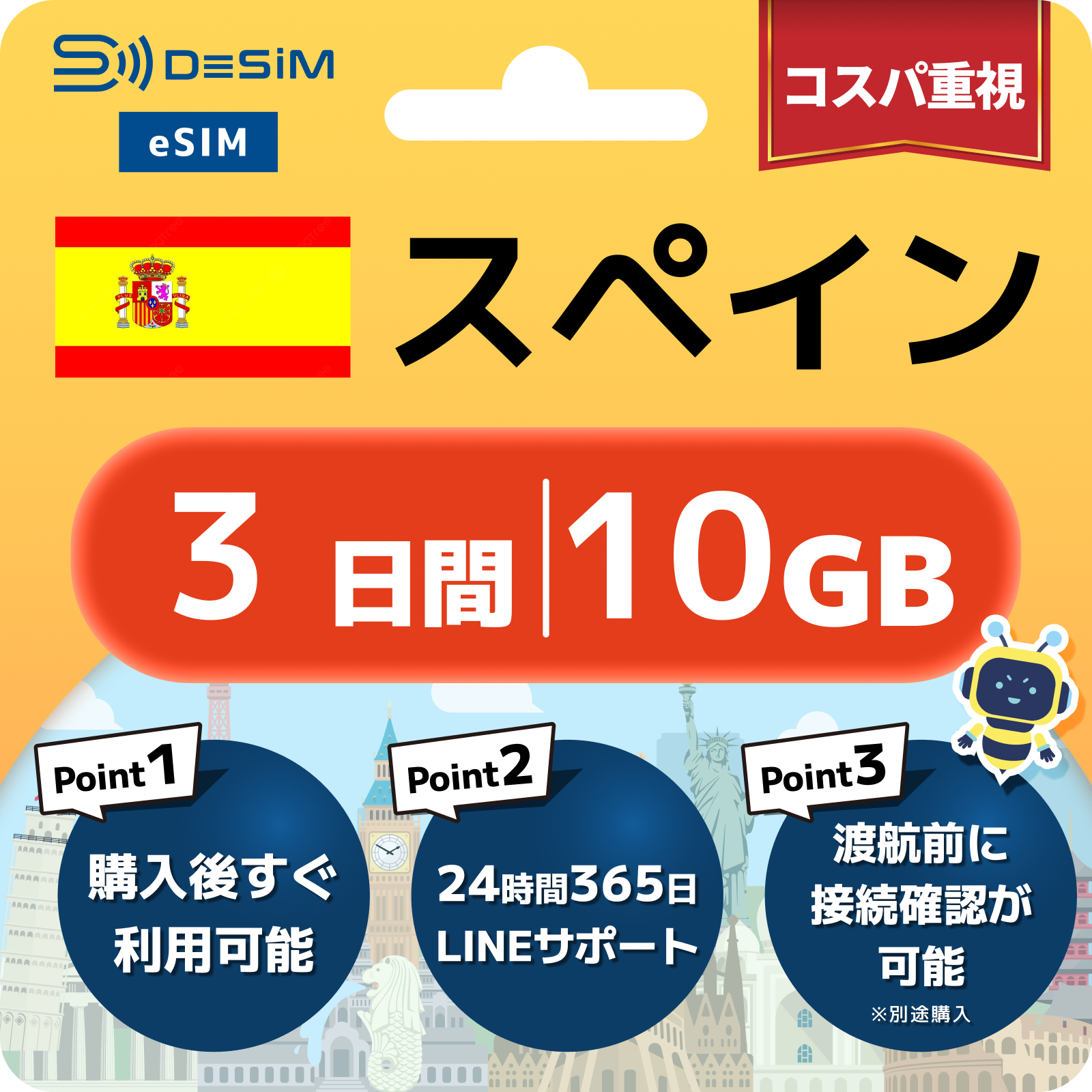 スペイン eSIM( 1~10日間)500MB~50GB選択可能 即日開通 テザリング対応
