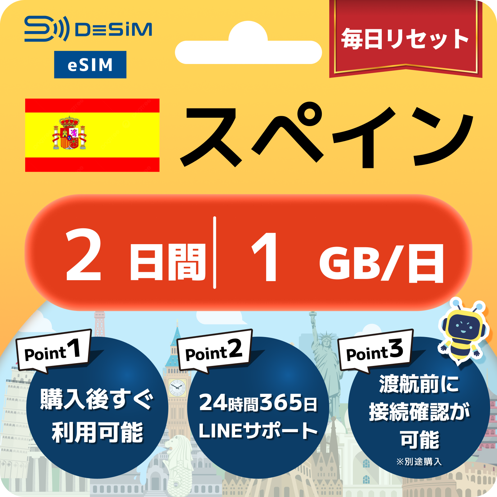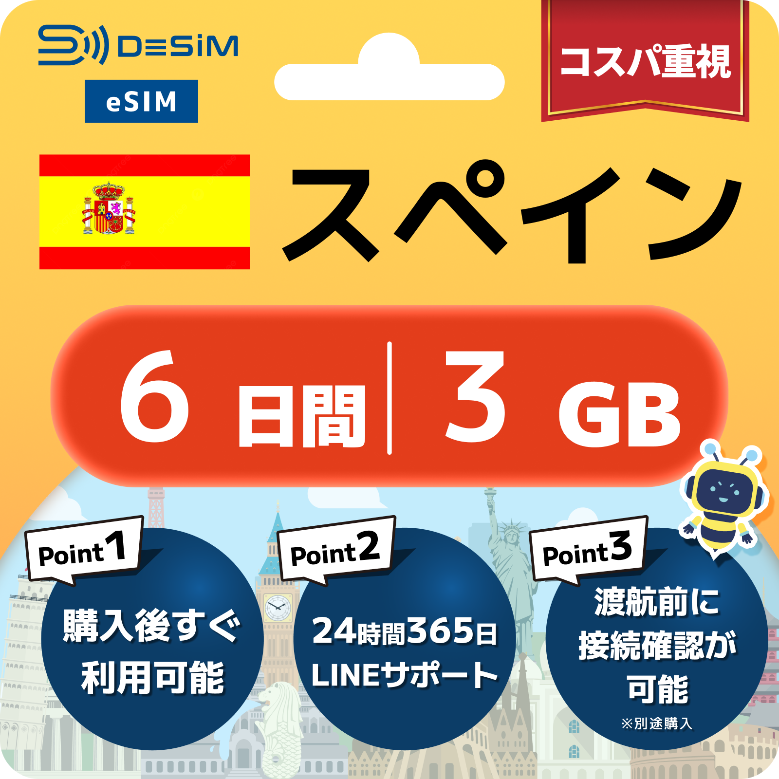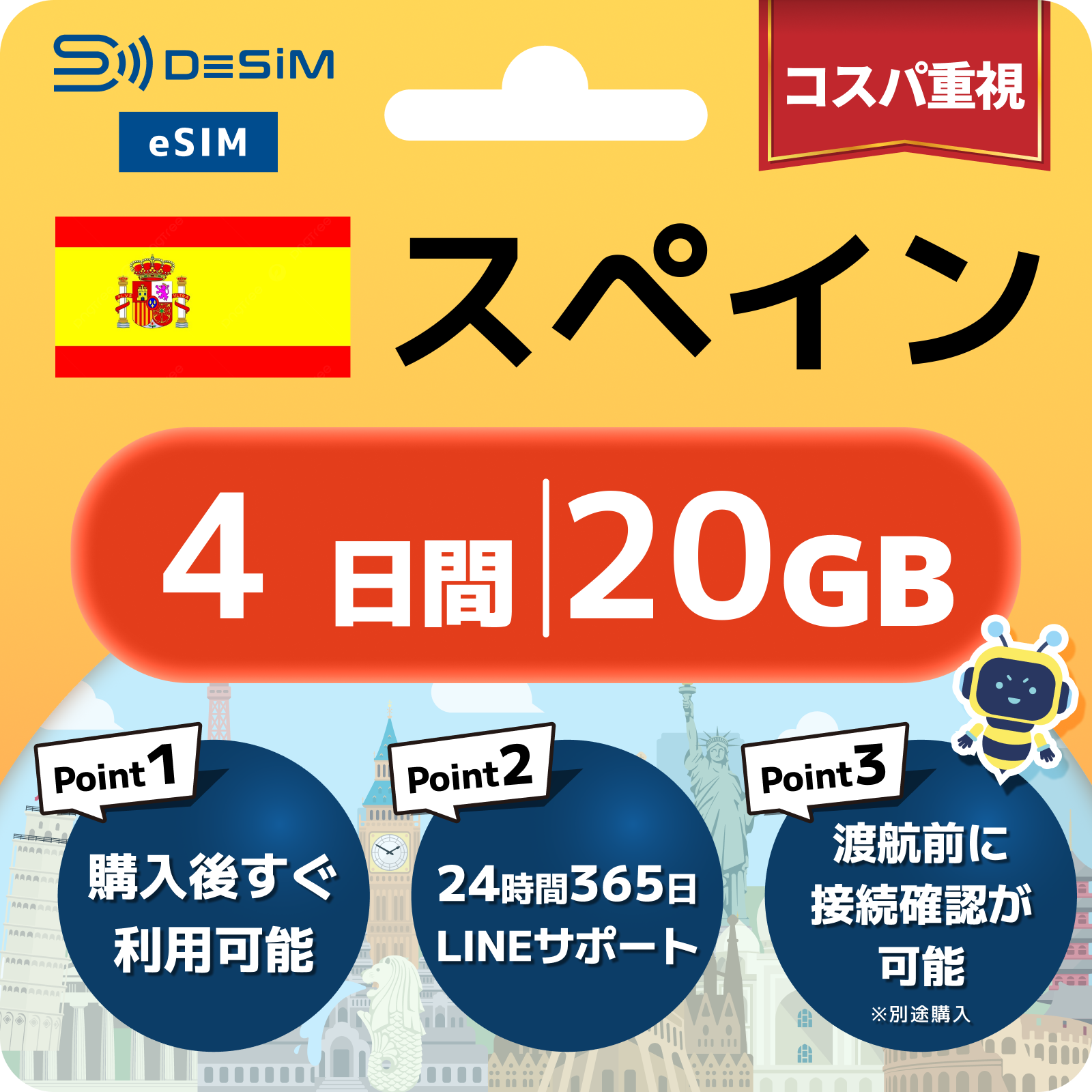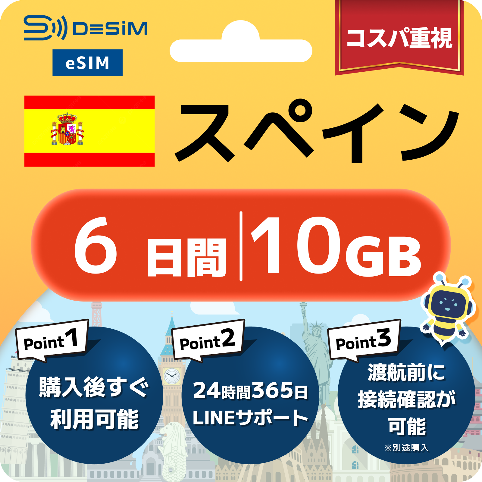 - eSIMのアクティベーションは目的地へ着いてからでも行えますが、インストール作業にはWi-Fi接続が必要ですのでご注意ください。