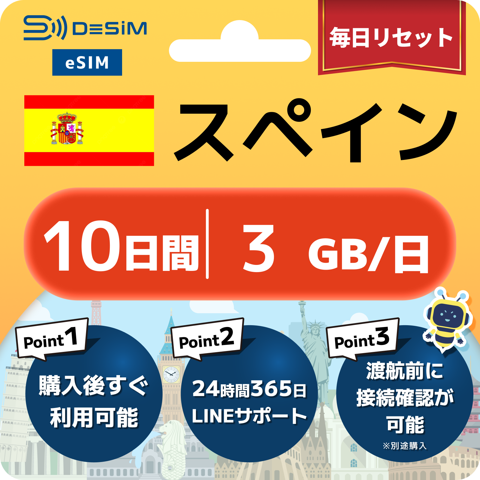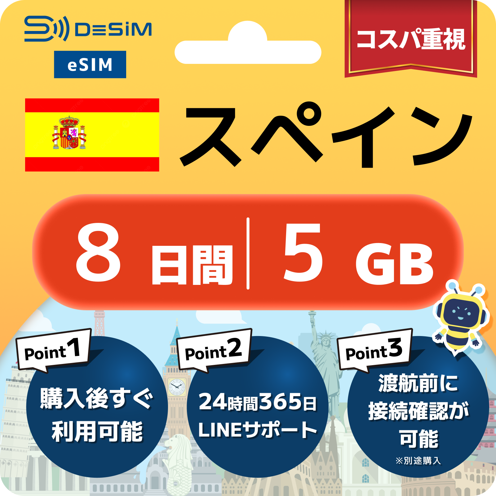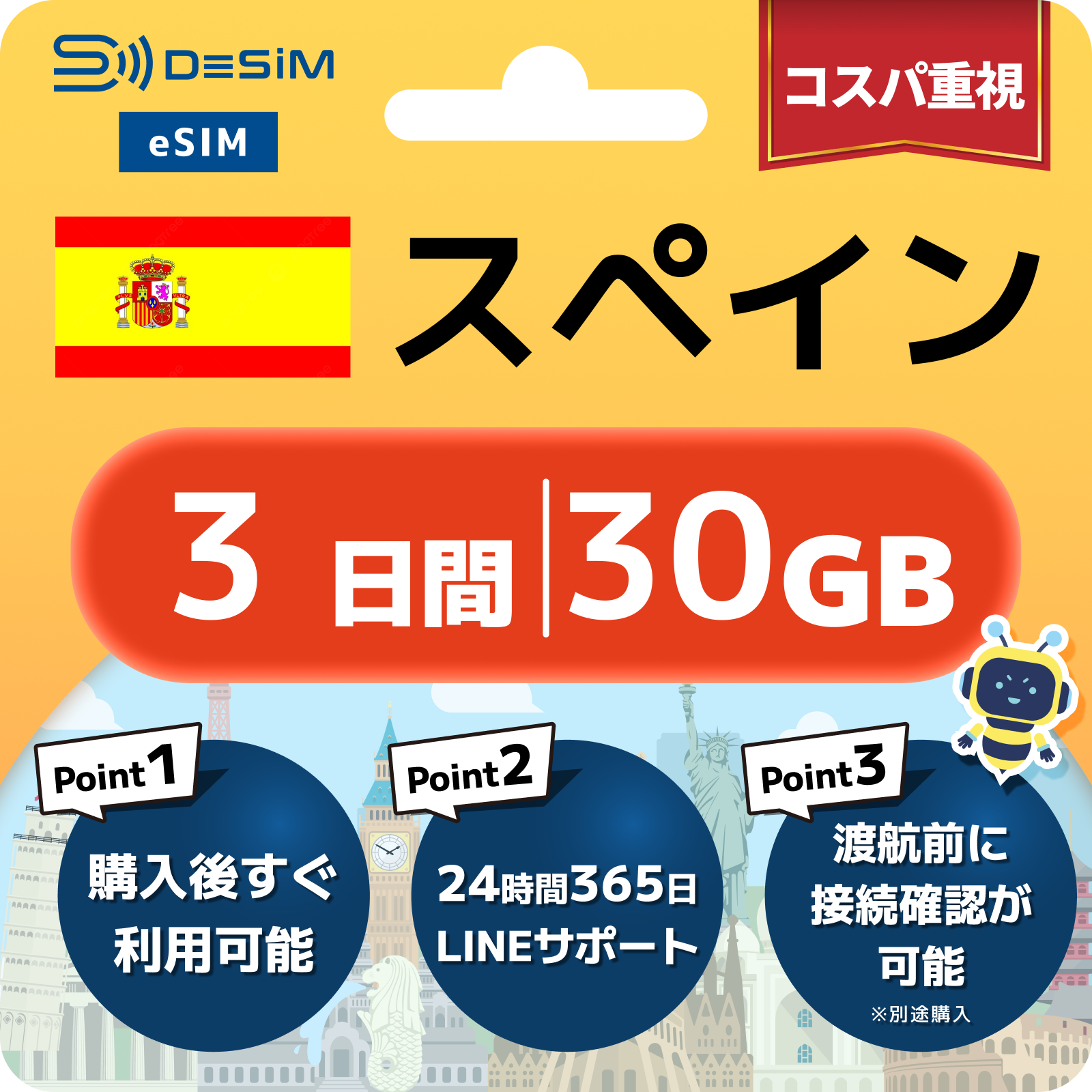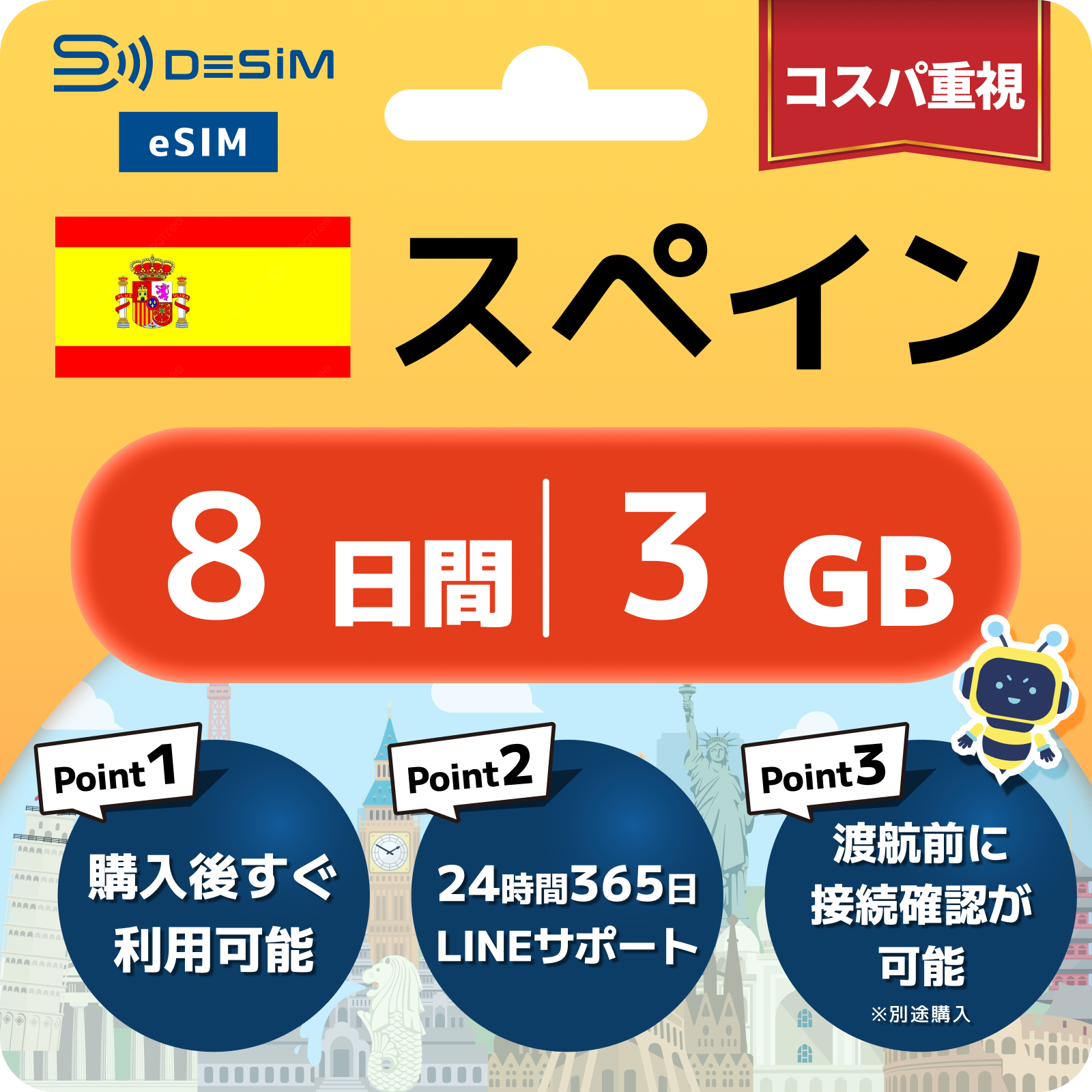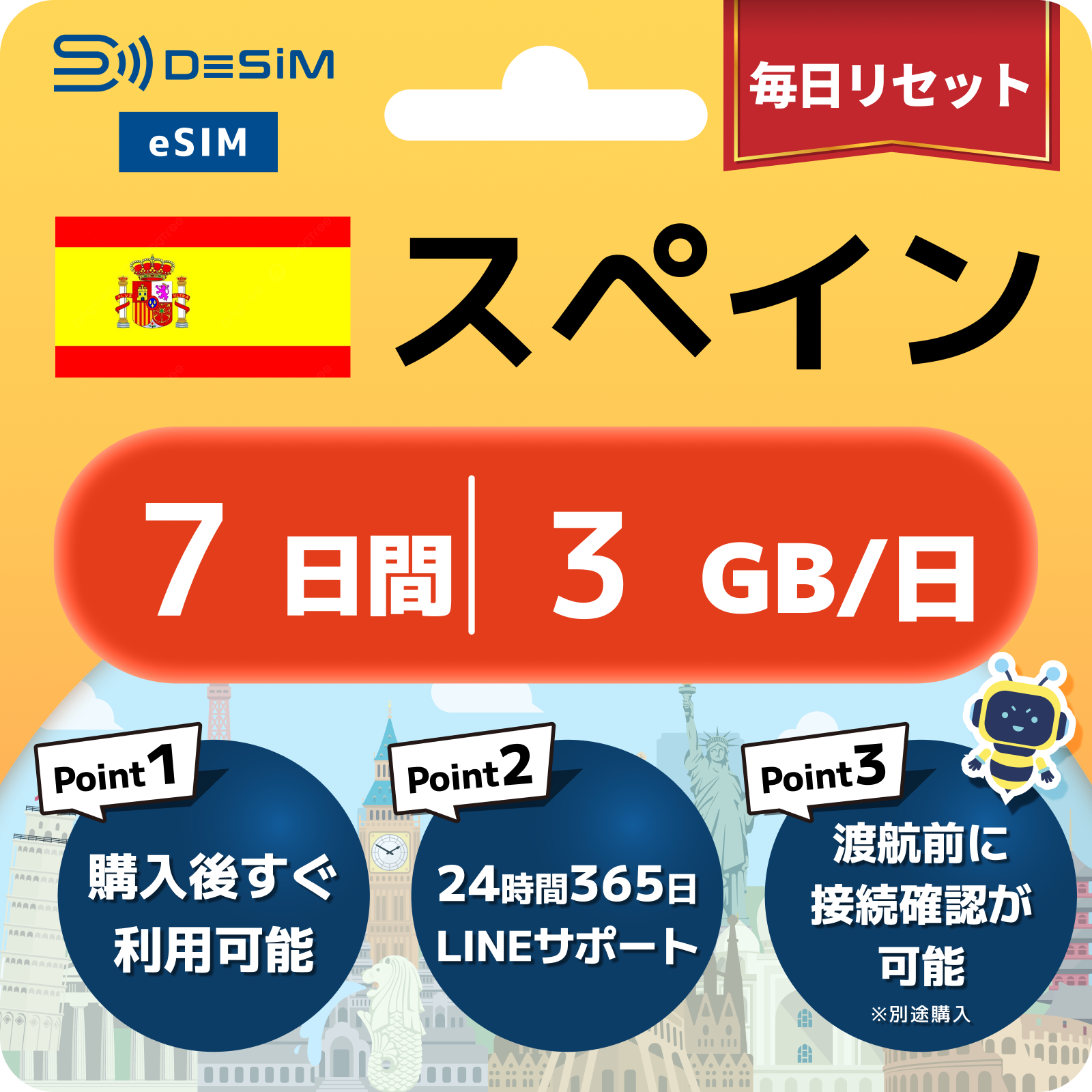 - eSIMのアクティベーションは目的地へ着いてからでも行えますが、インストール作業にはWi-Fi接続が必要ですのでご注意ください。