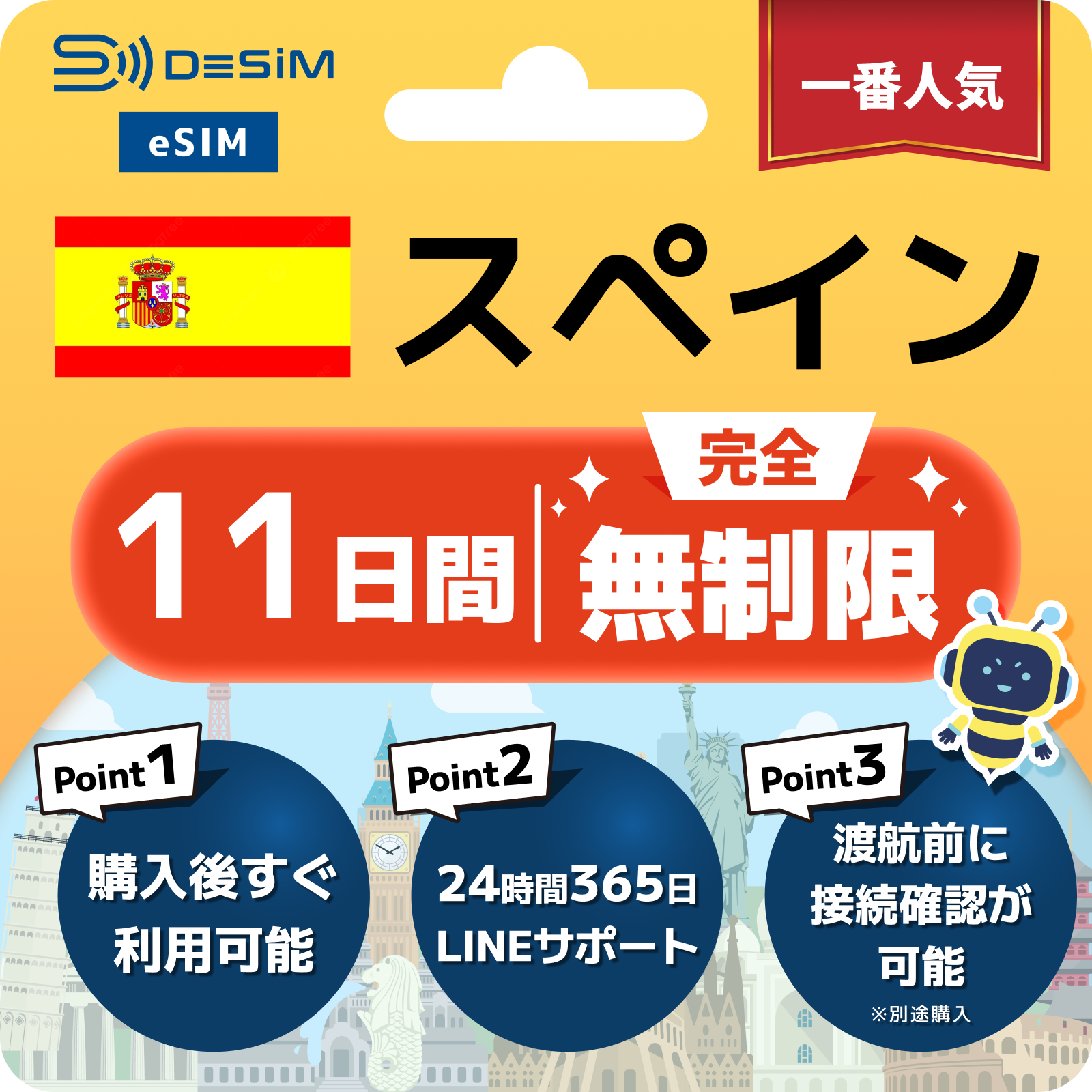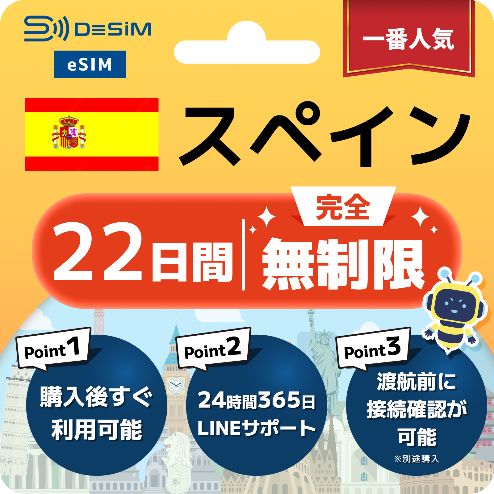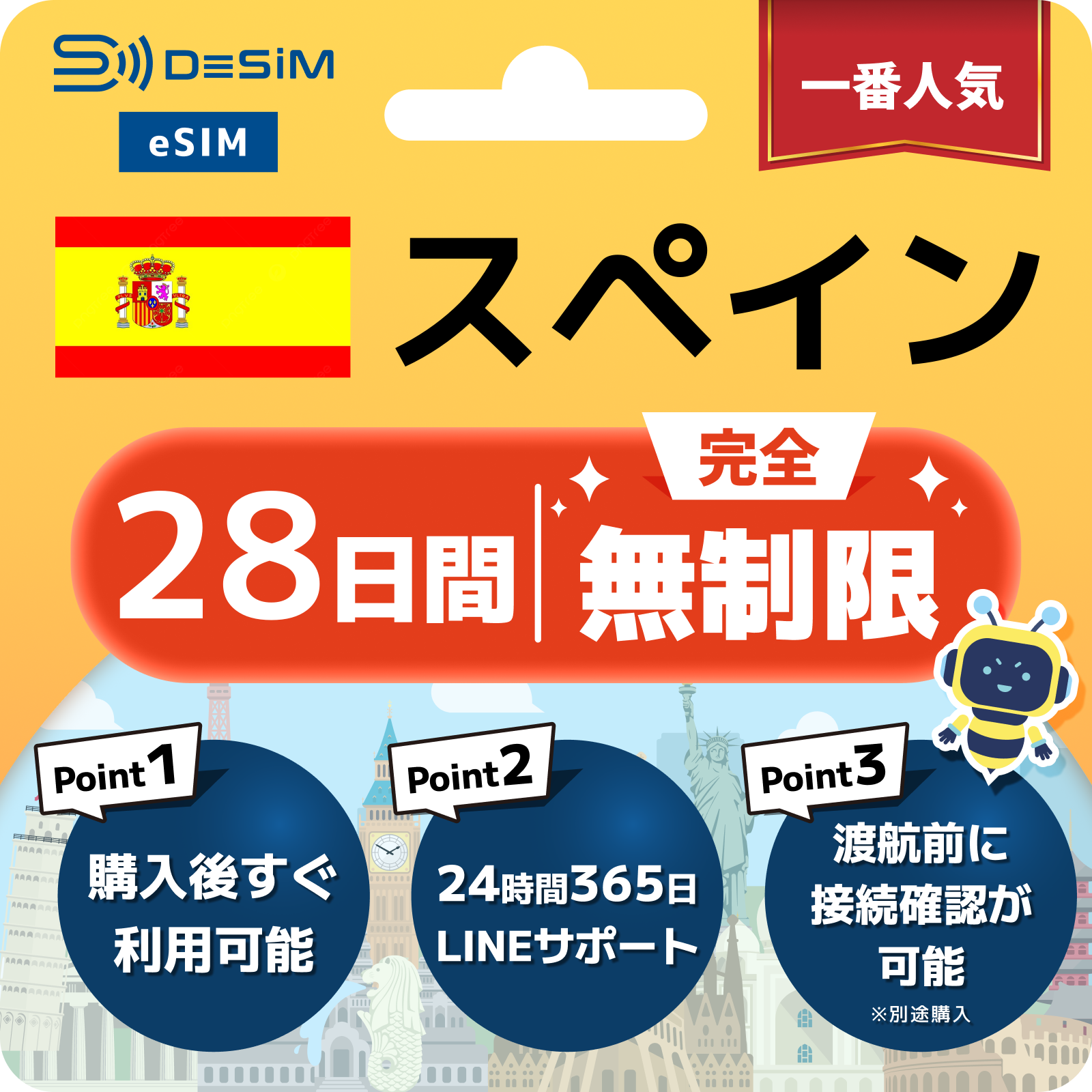 スペイン eSIM(1~30日間) 完全無制限eSIM 即日開通 テザリング対応