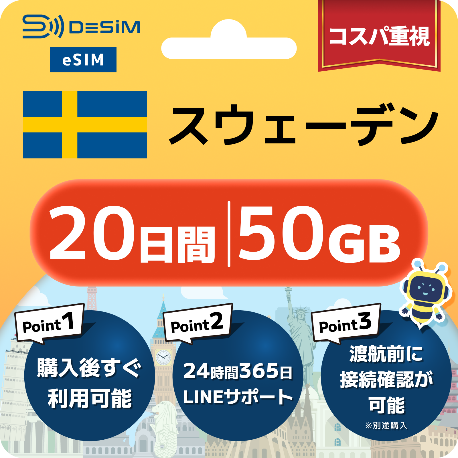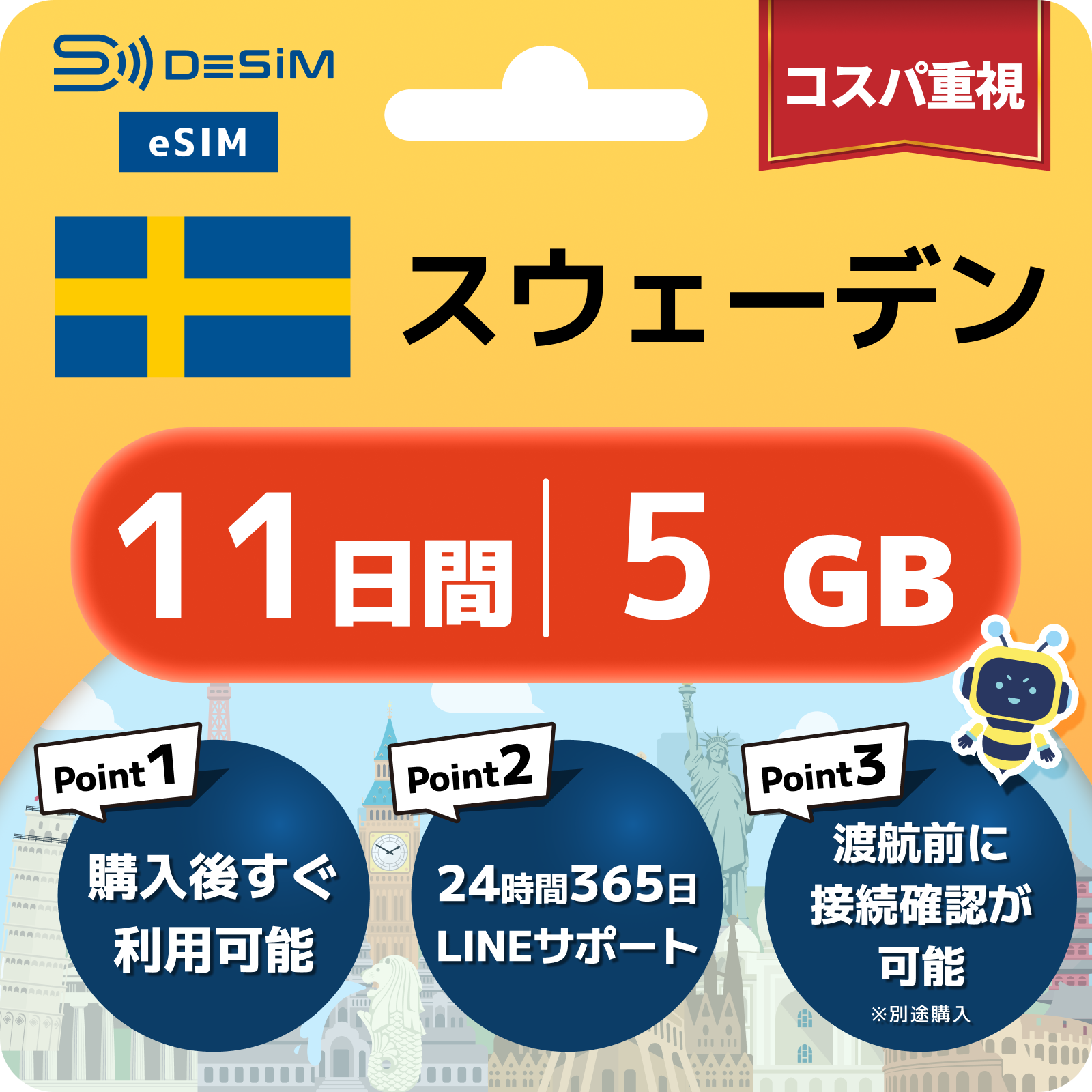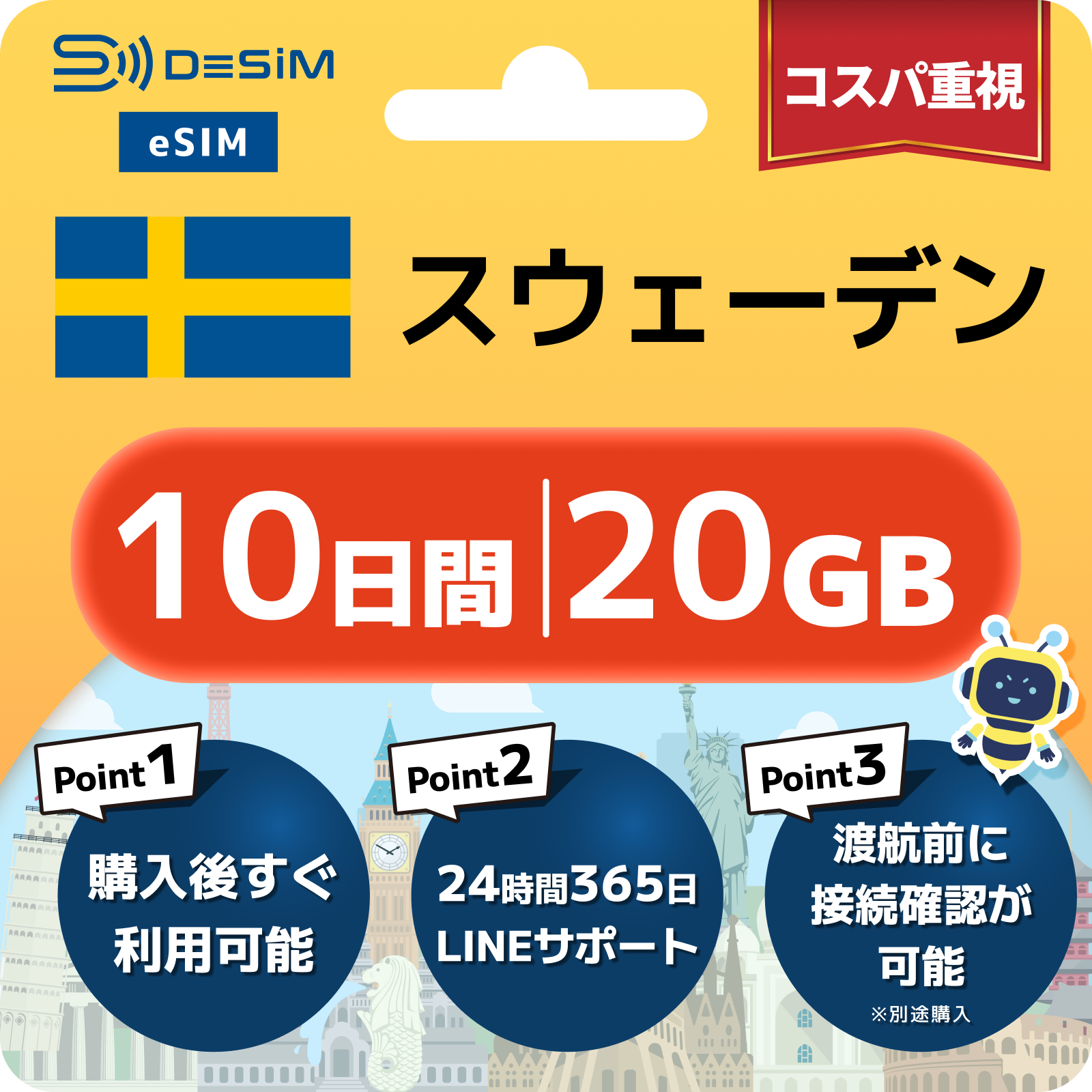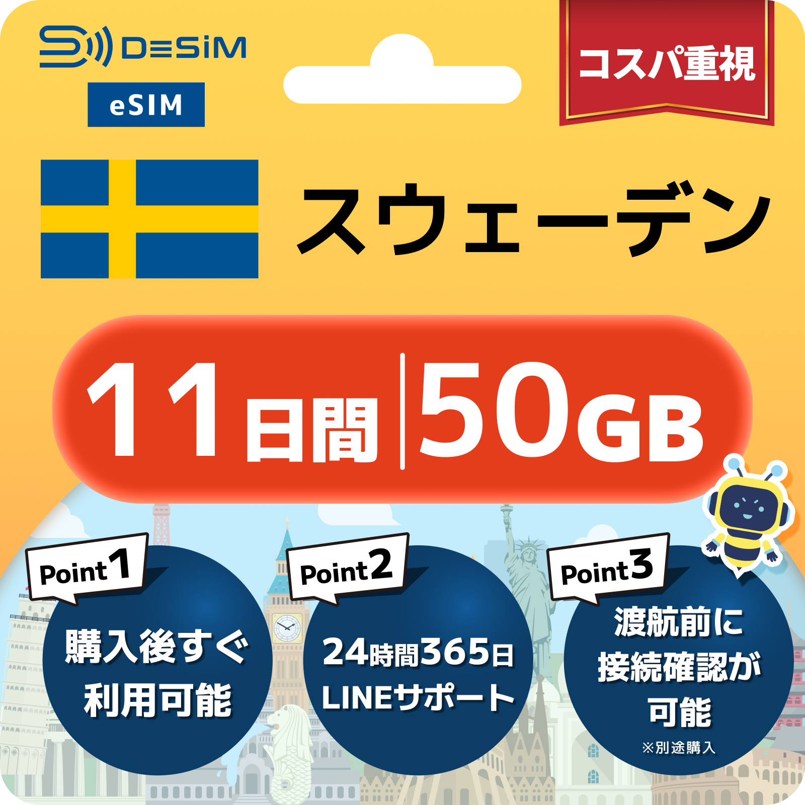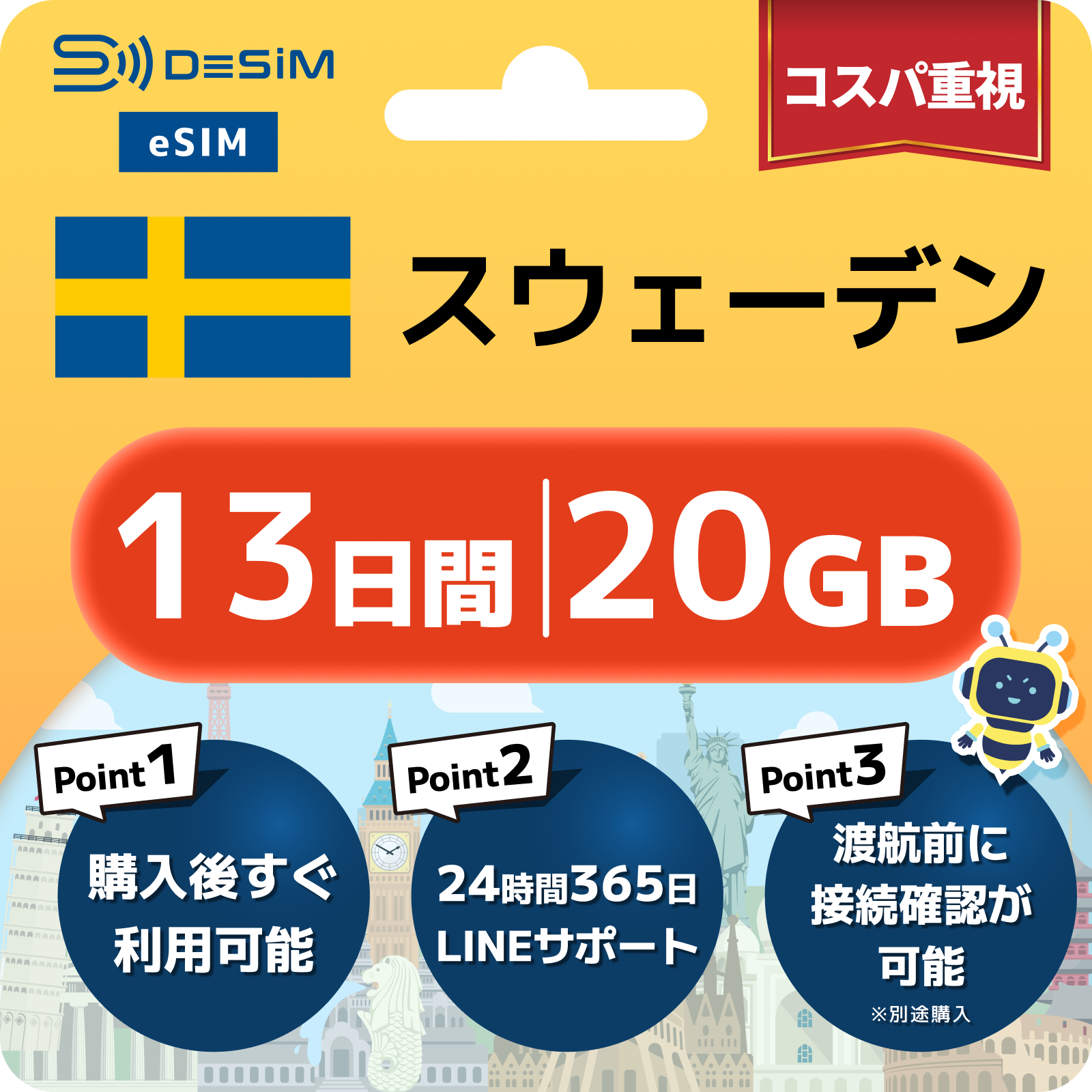 スウェーデン eSIM(11~20日間)500MB~50GB選択可能 即日開通 テザリング対応