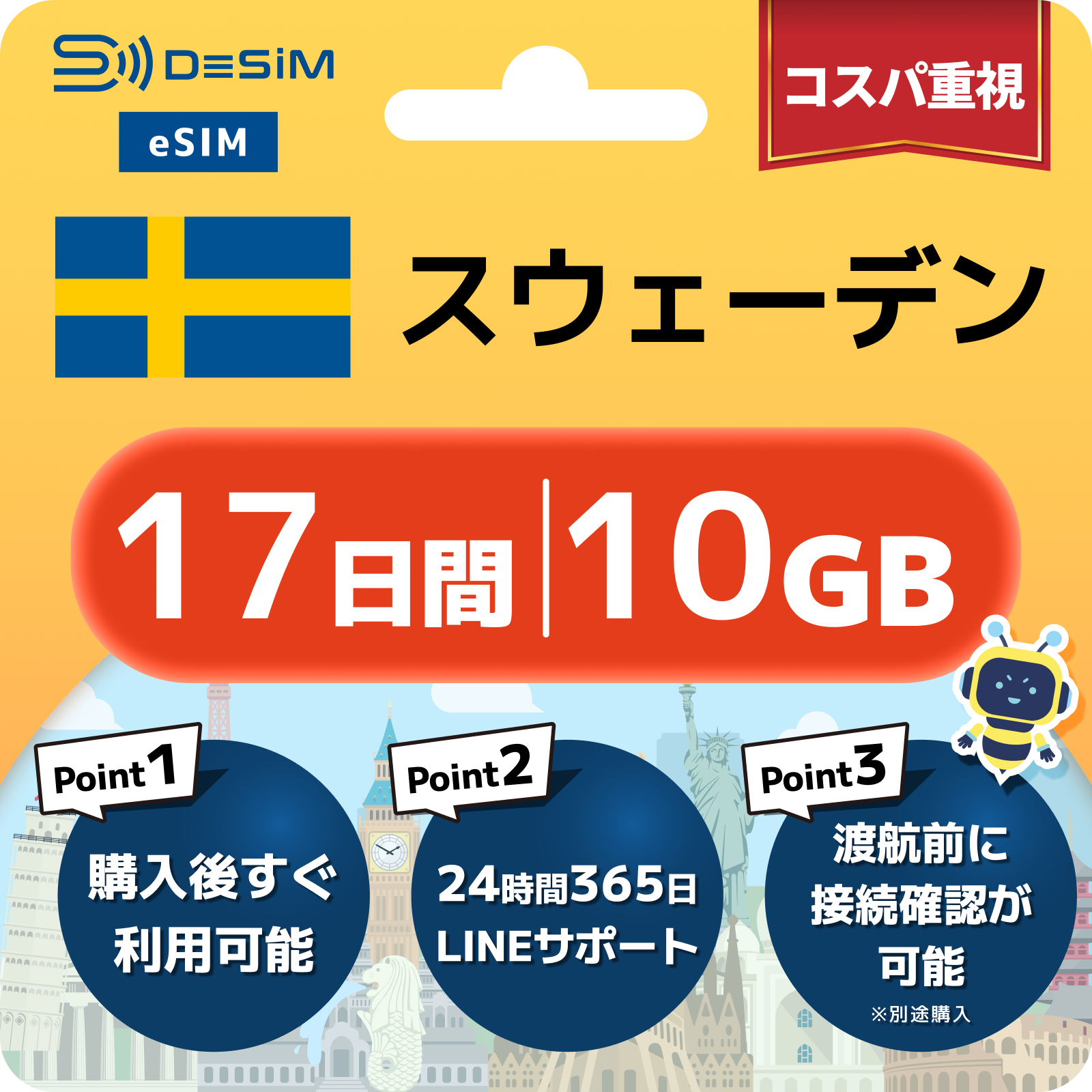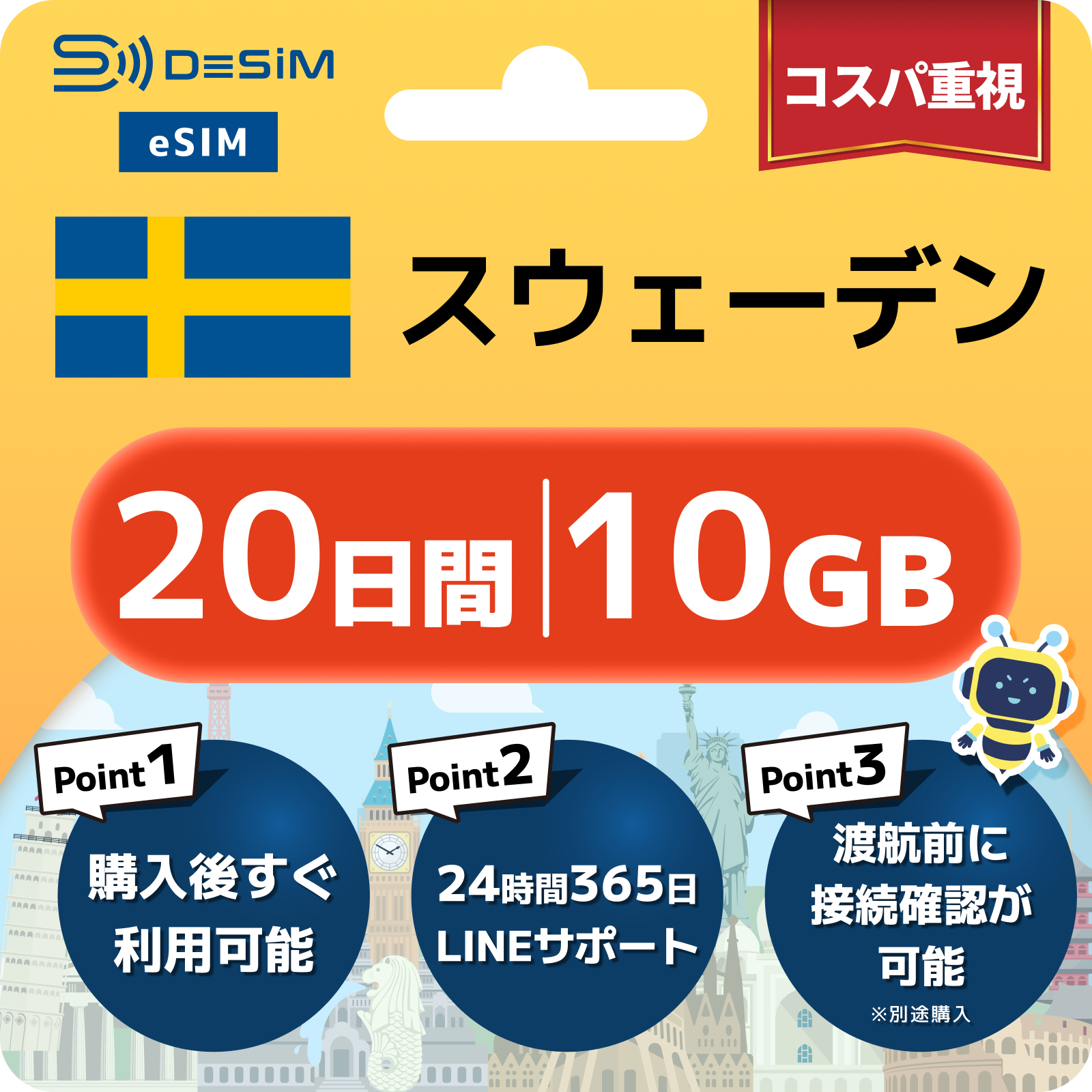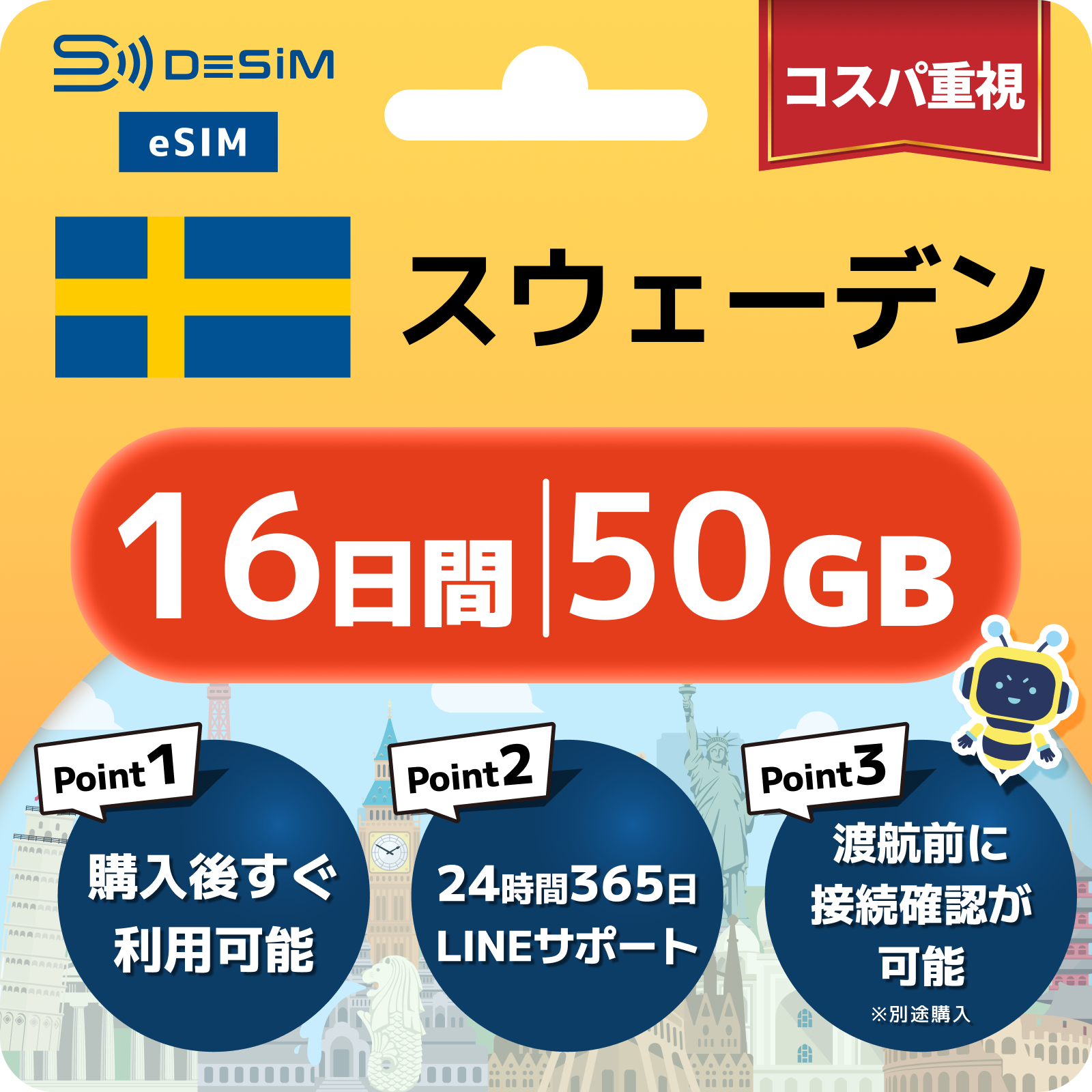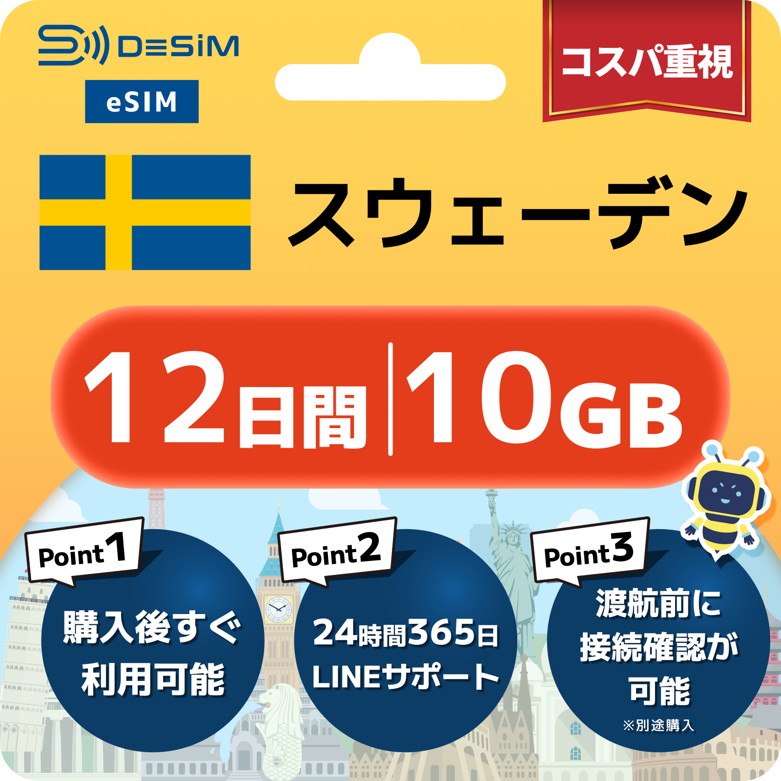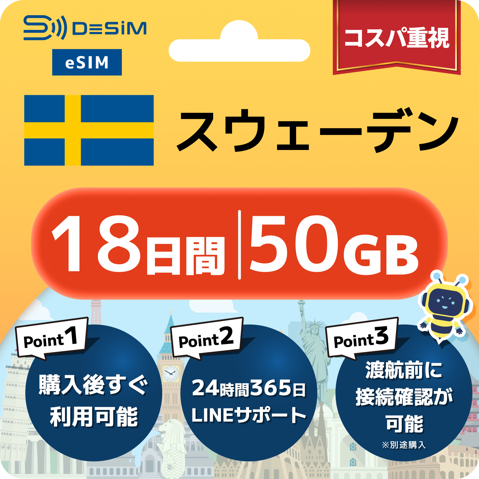 スウェーデン eSIM(11~20日間)500MB~50GB選択可能 即日開通 テザリング対応