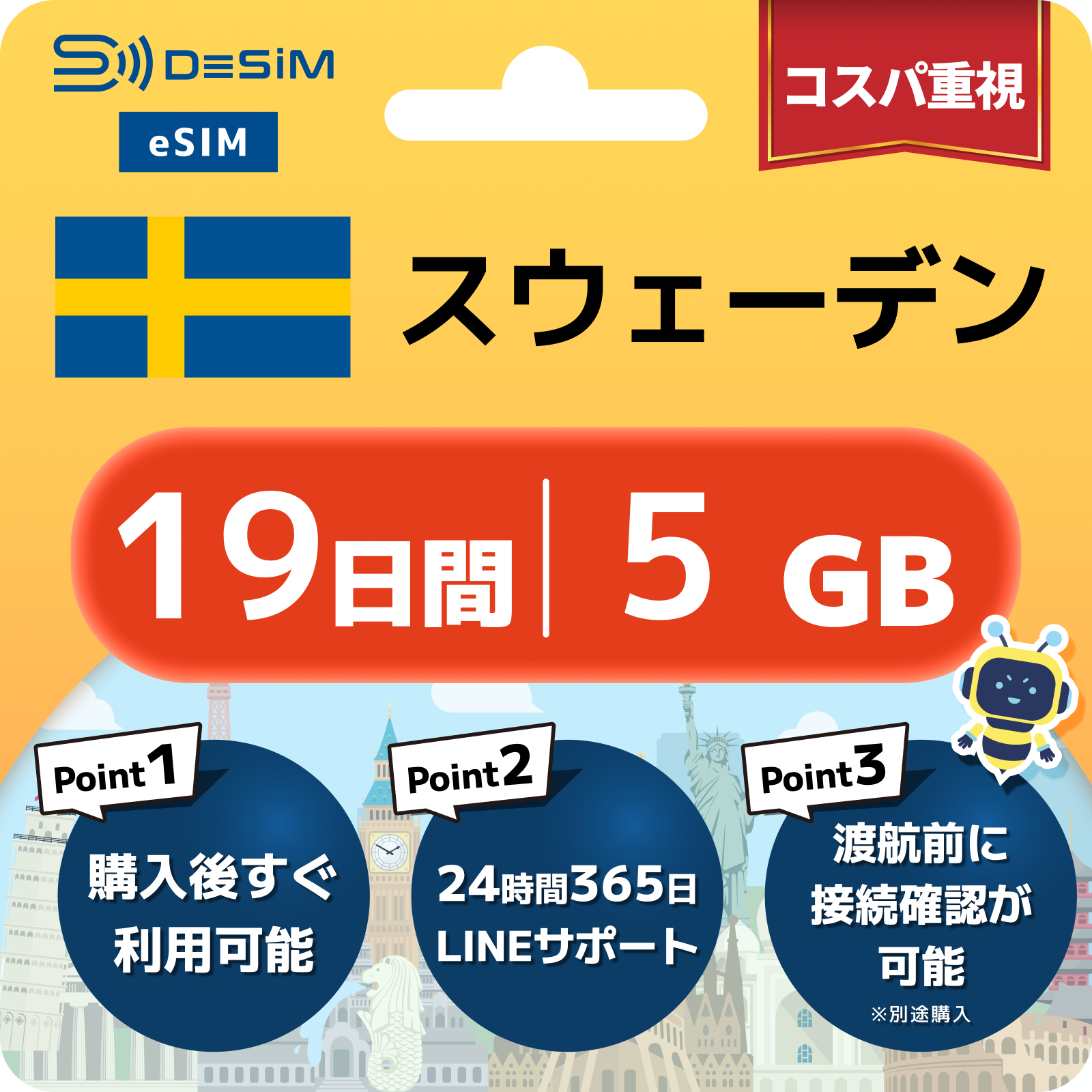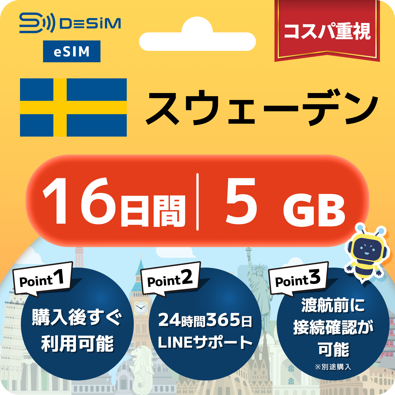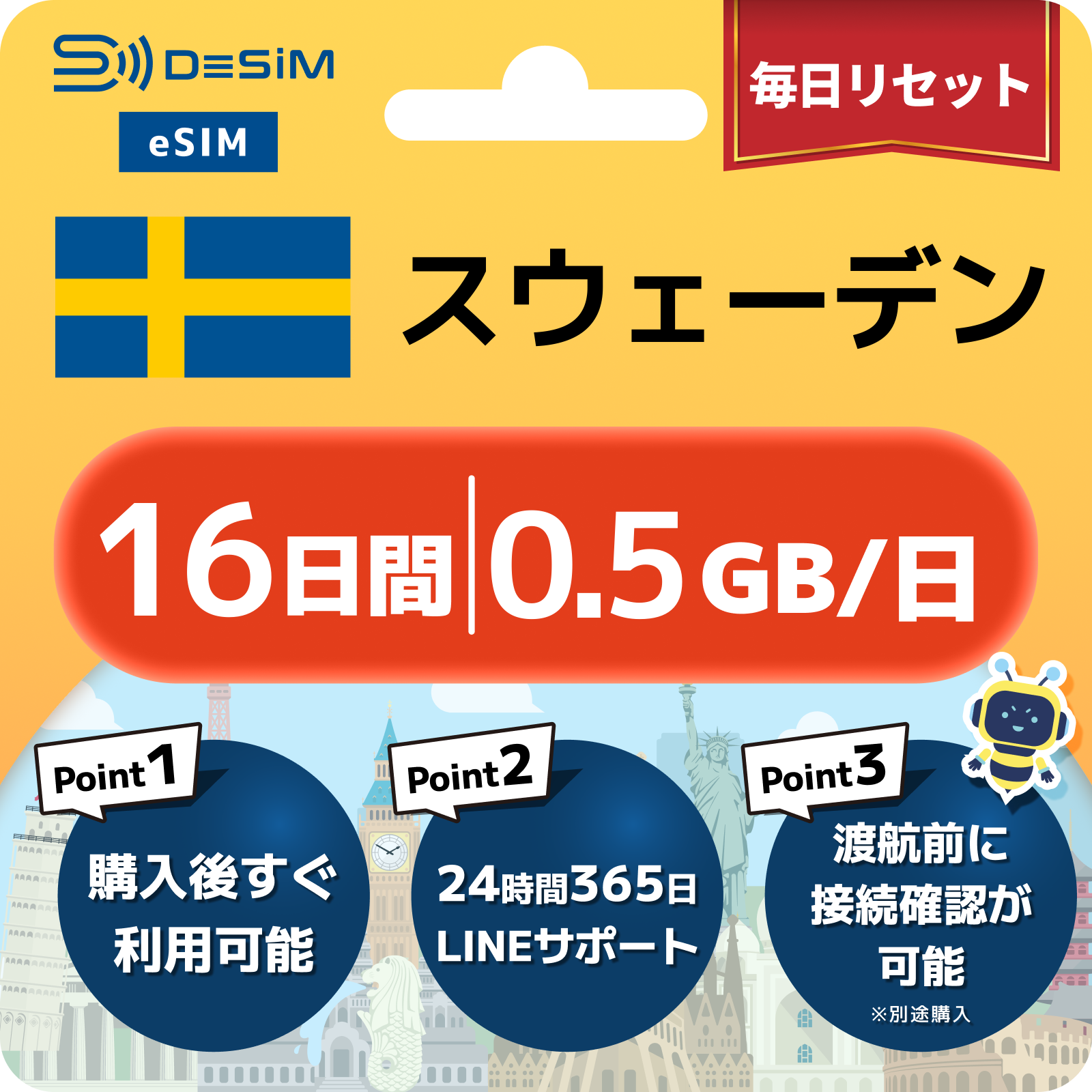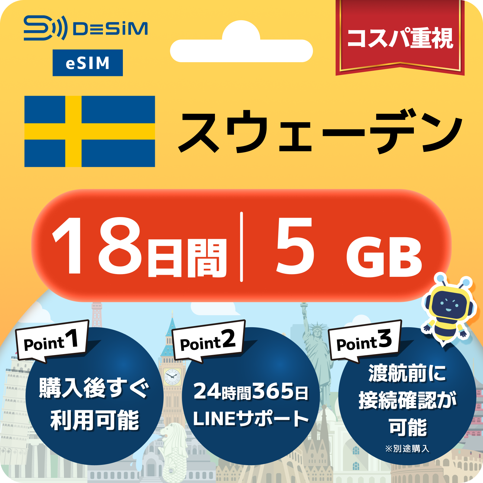 スウェーデン eSIM(11~20日間)500MB~50GB選択可能 即日開通 テザリング対応