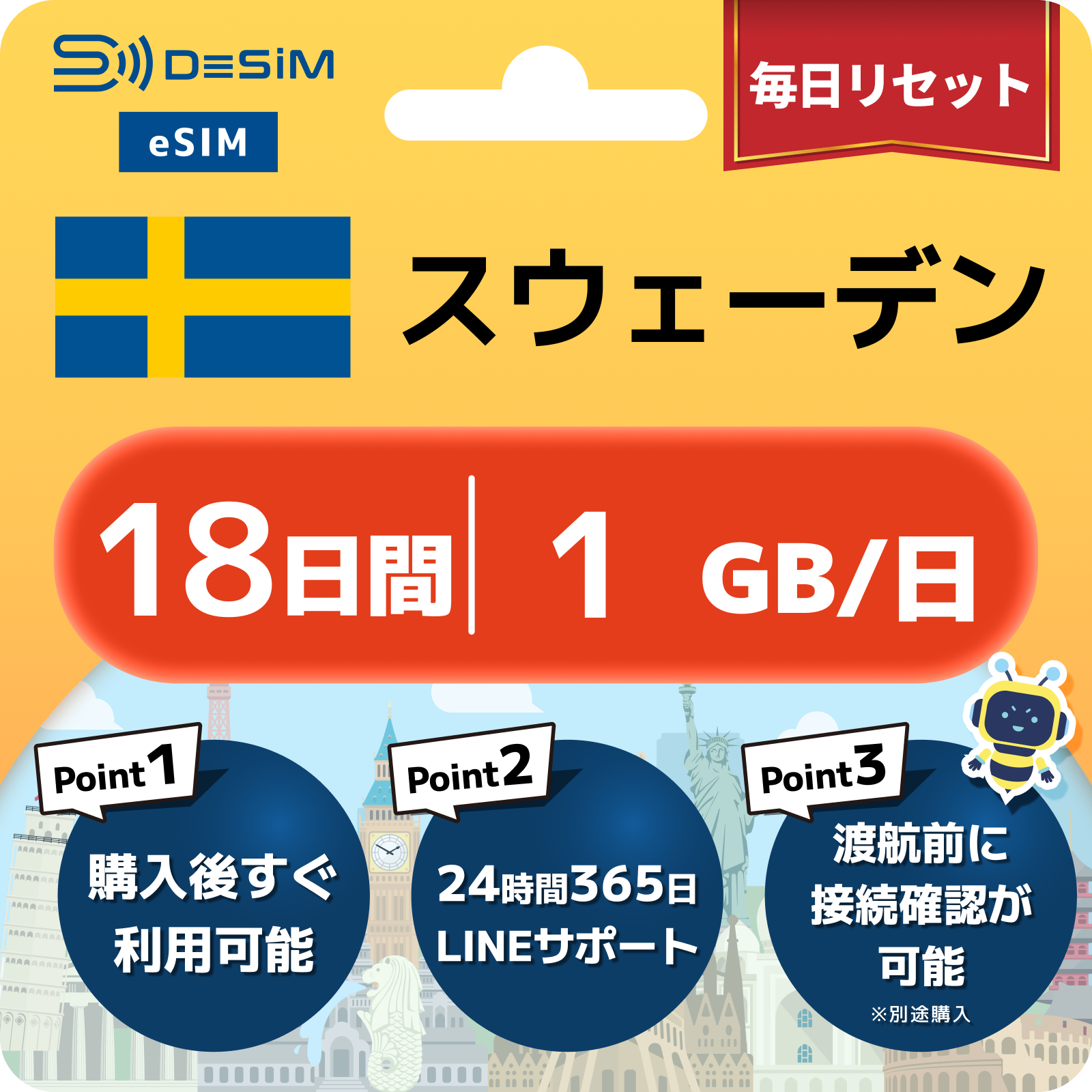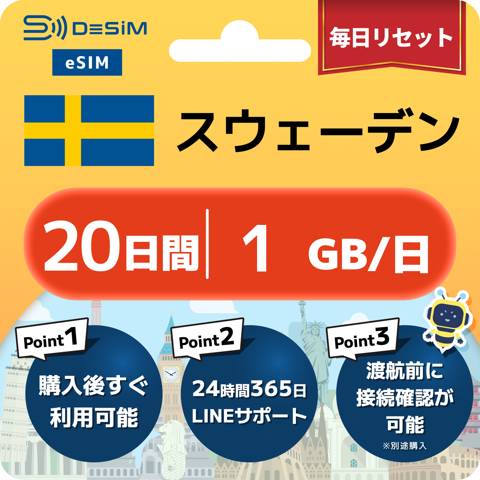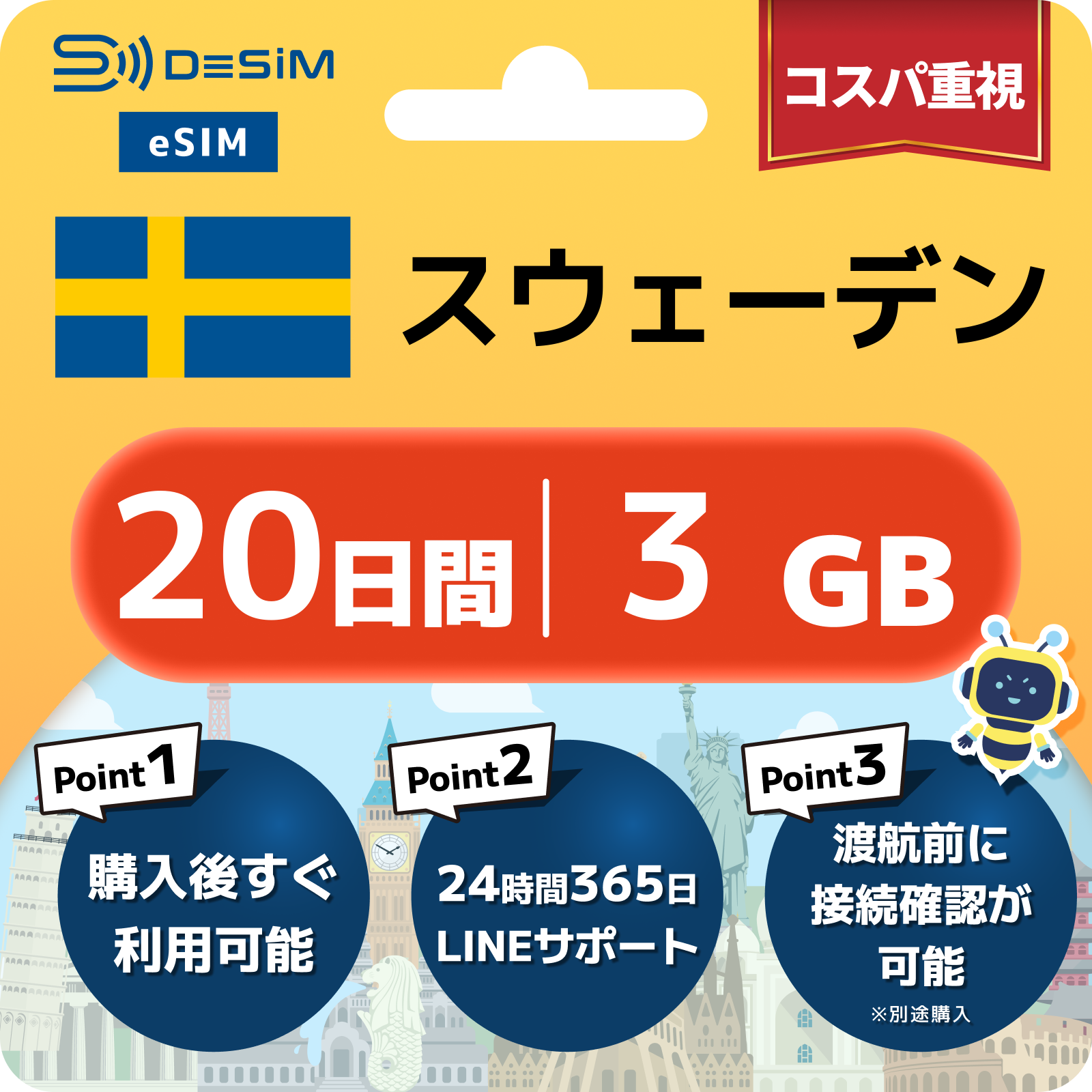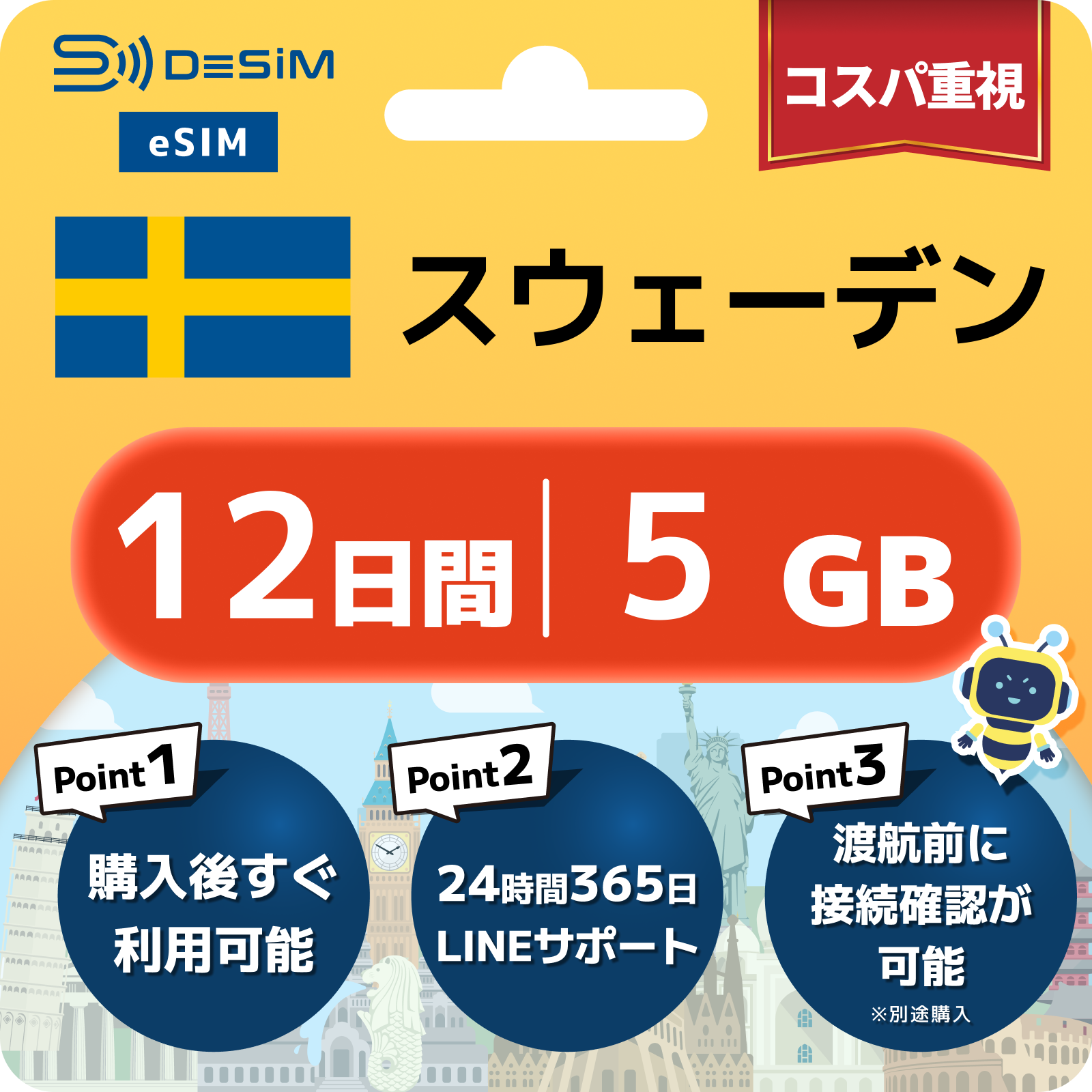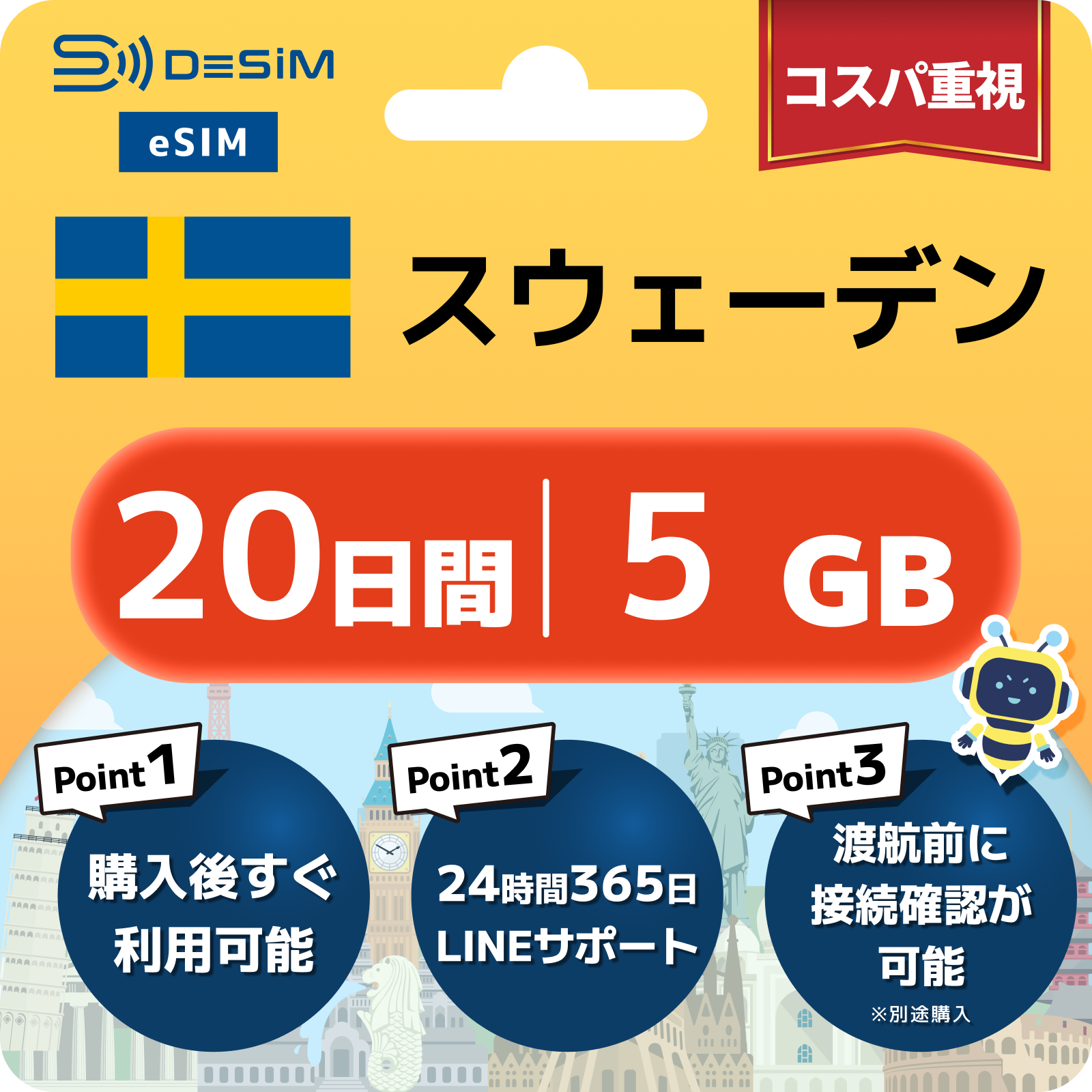スウェーデン eSIM(11~20日間)500MB~50GB選択可能 即日開通 テザリング対応
