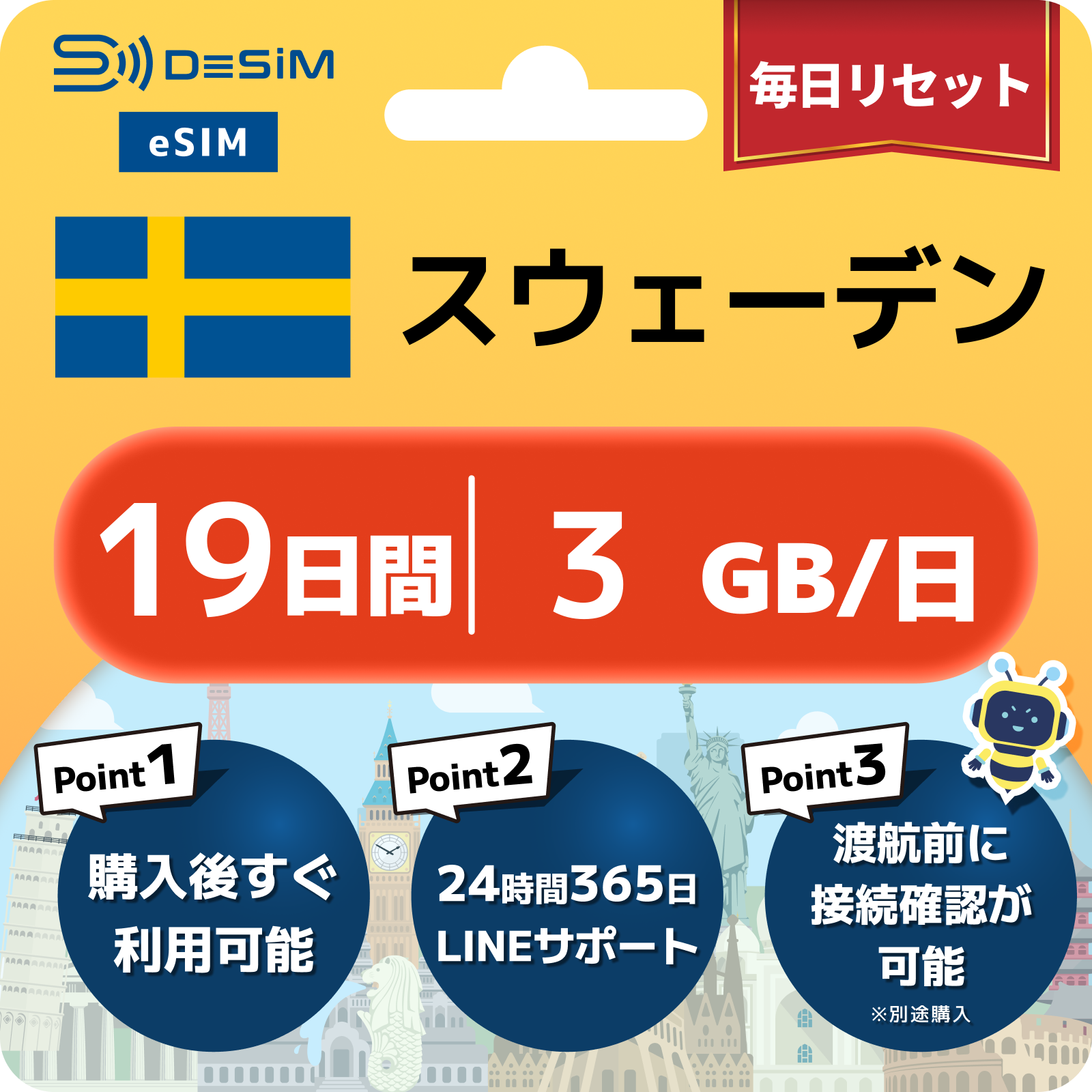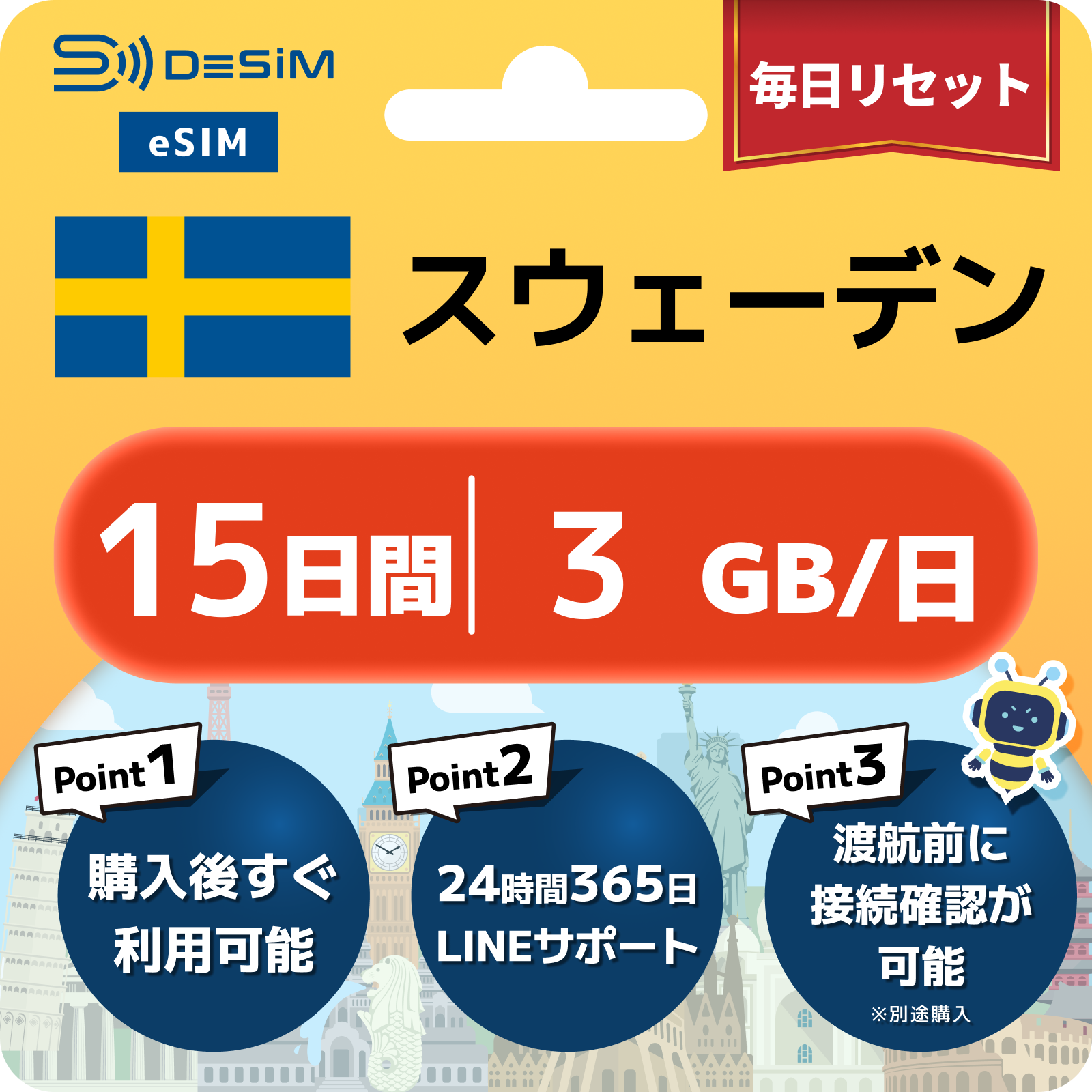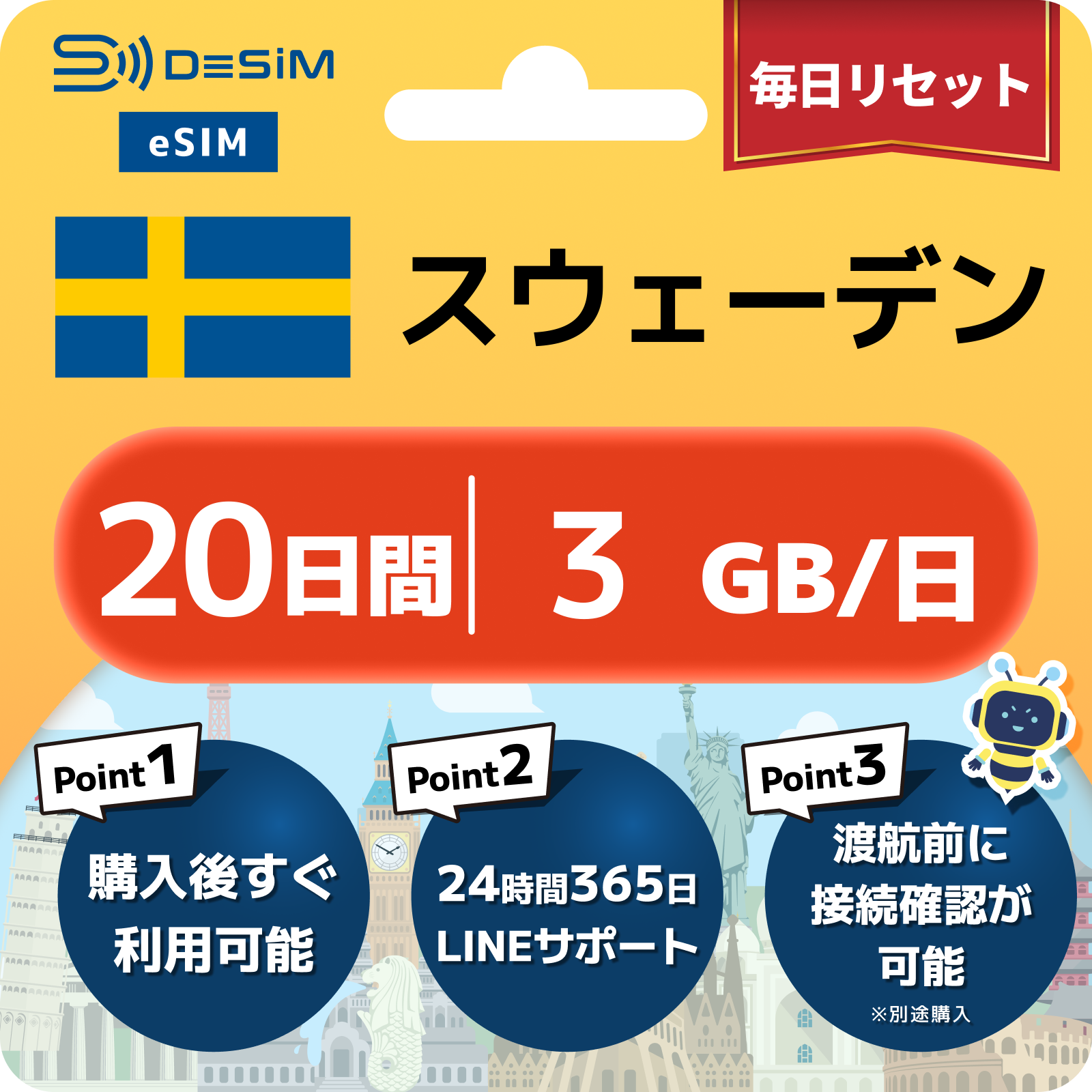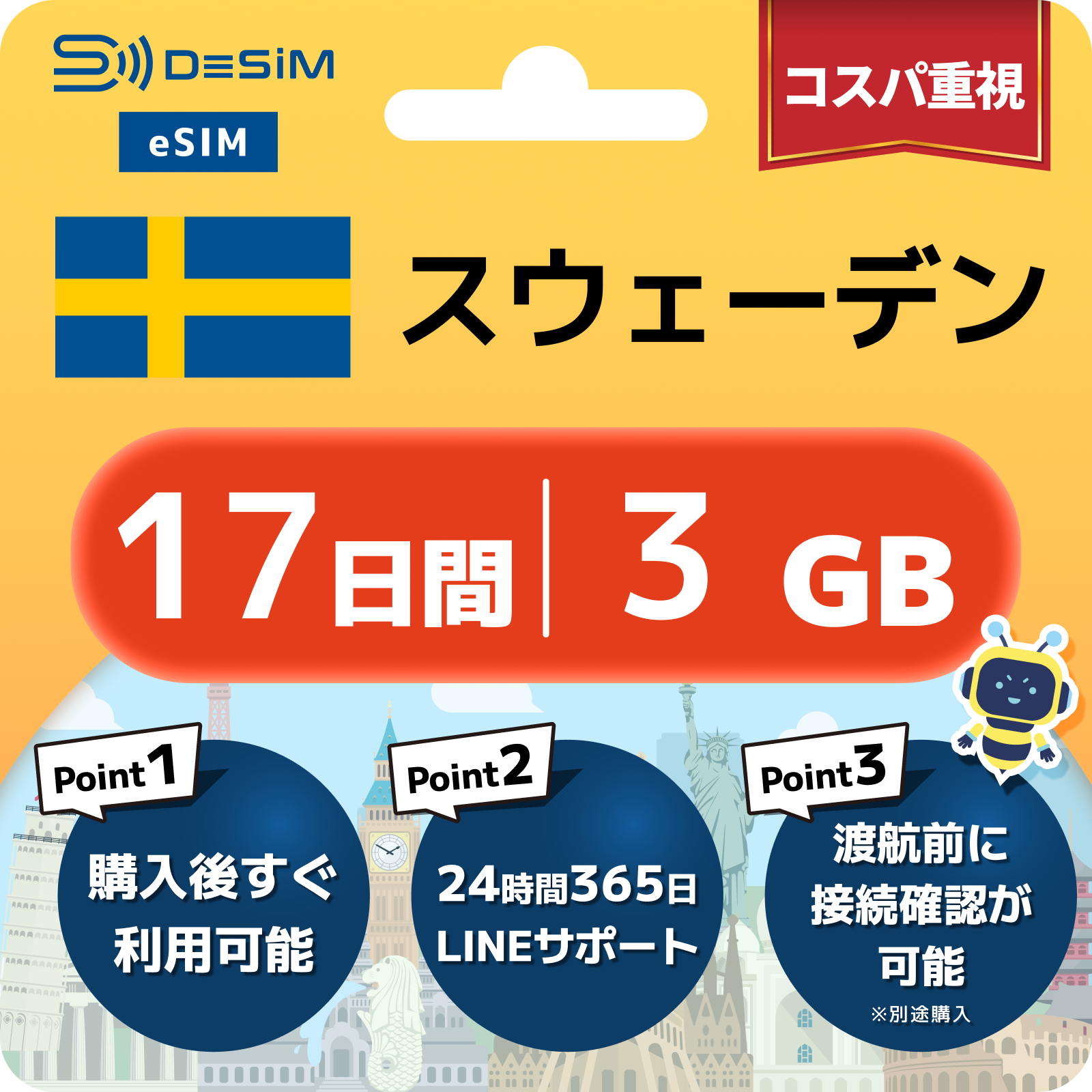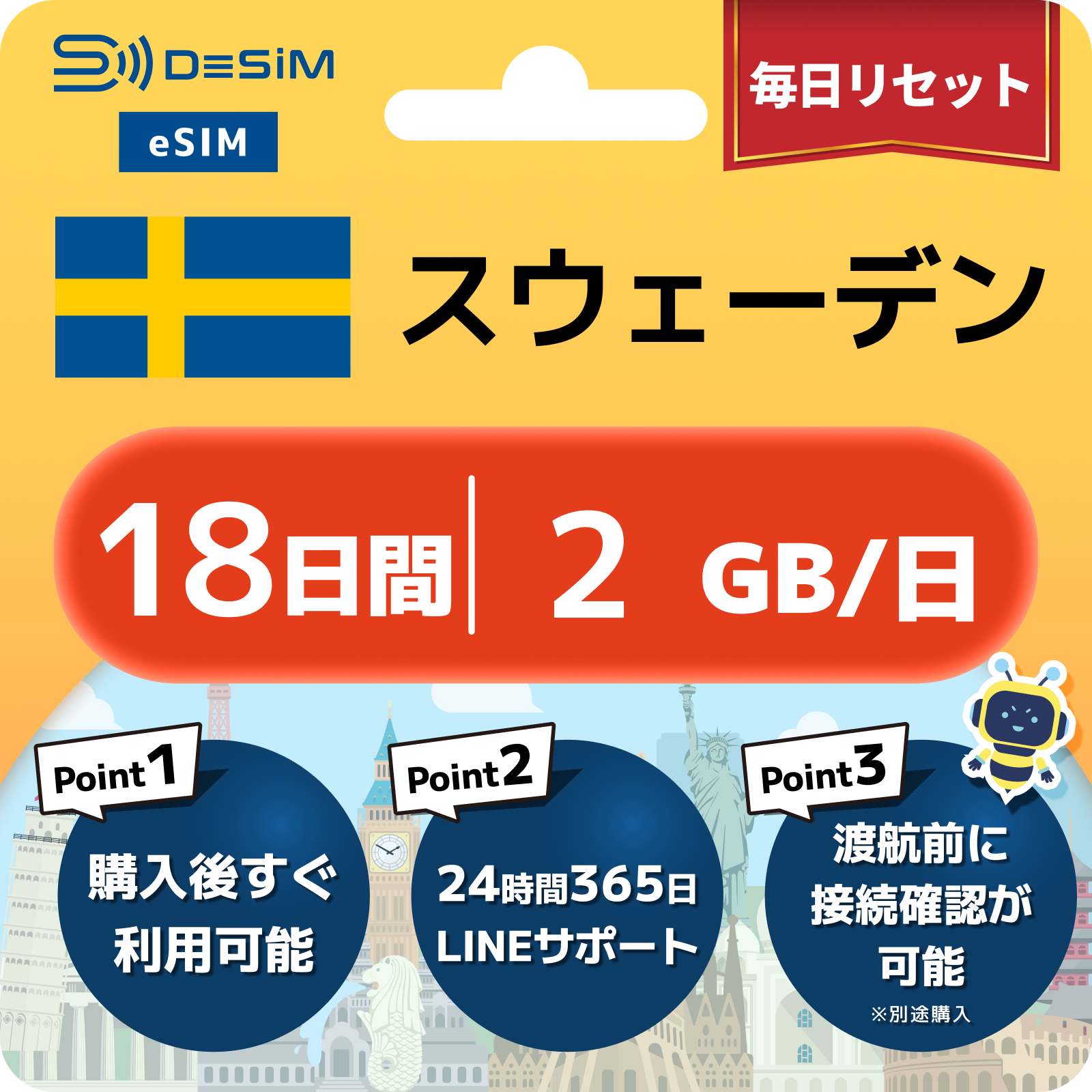 スウェーデン eSIM(11~20日間)500MB~50GB選択可能 即日開通 テザリング対応