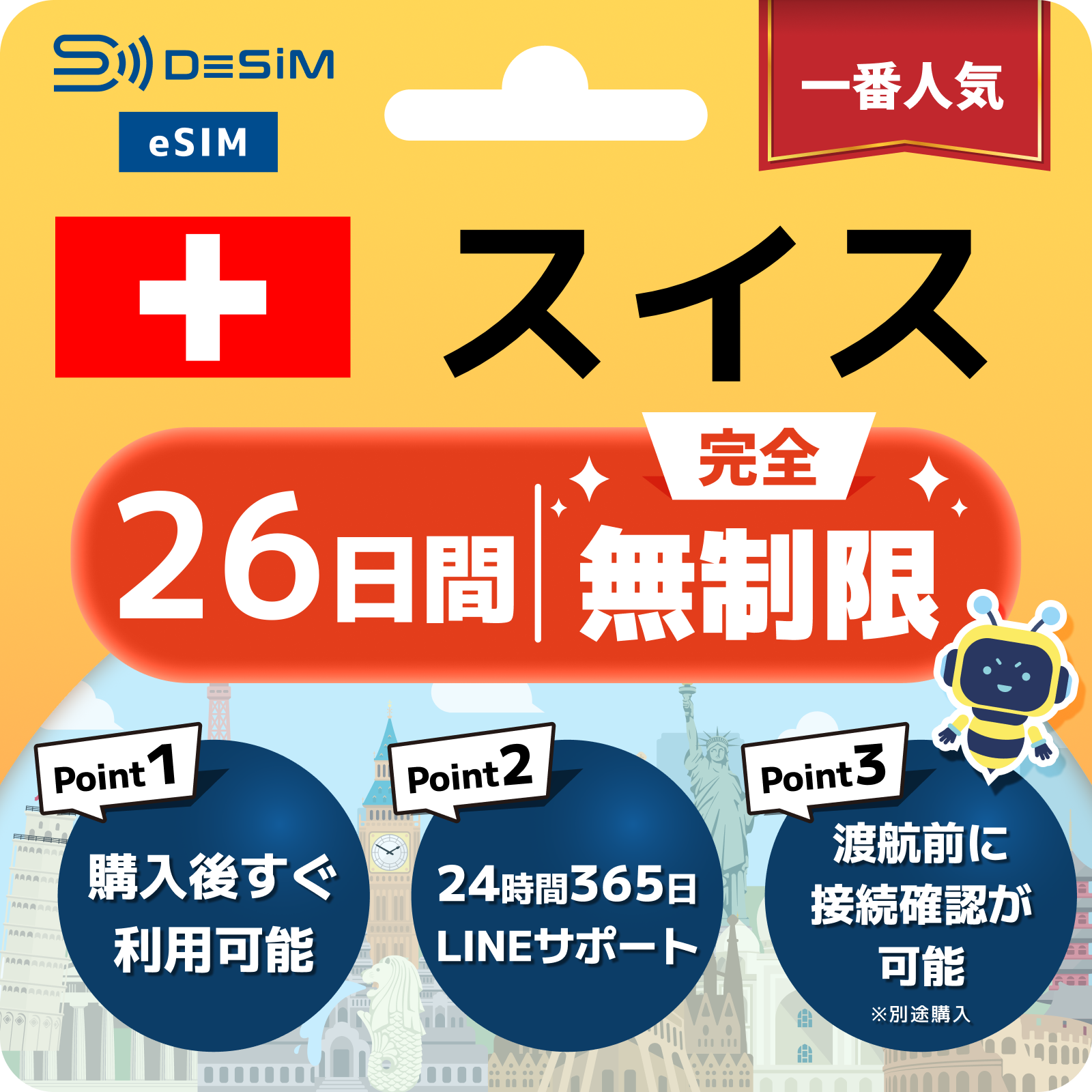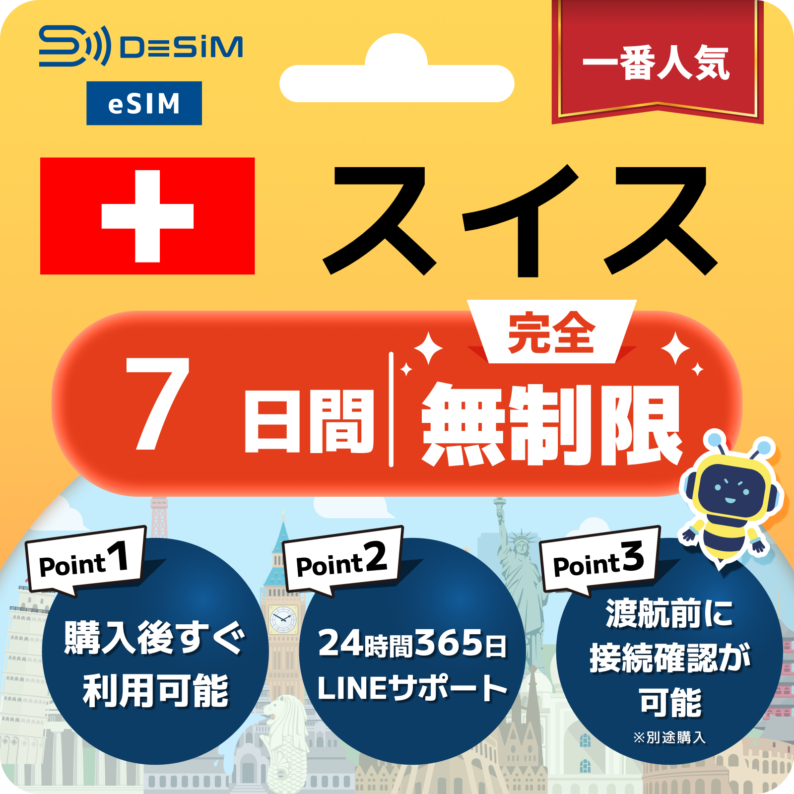 スイス eSIM(1~30日間) 完全無制限eSIM 即日開通 テザリング対応