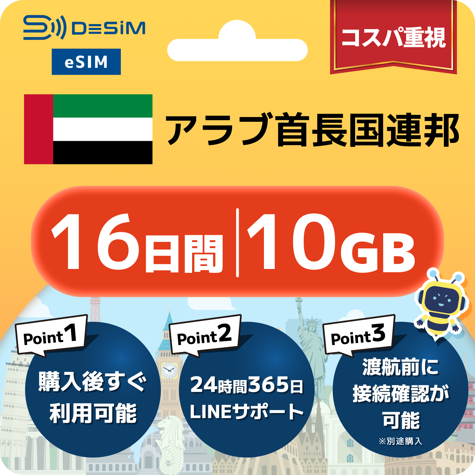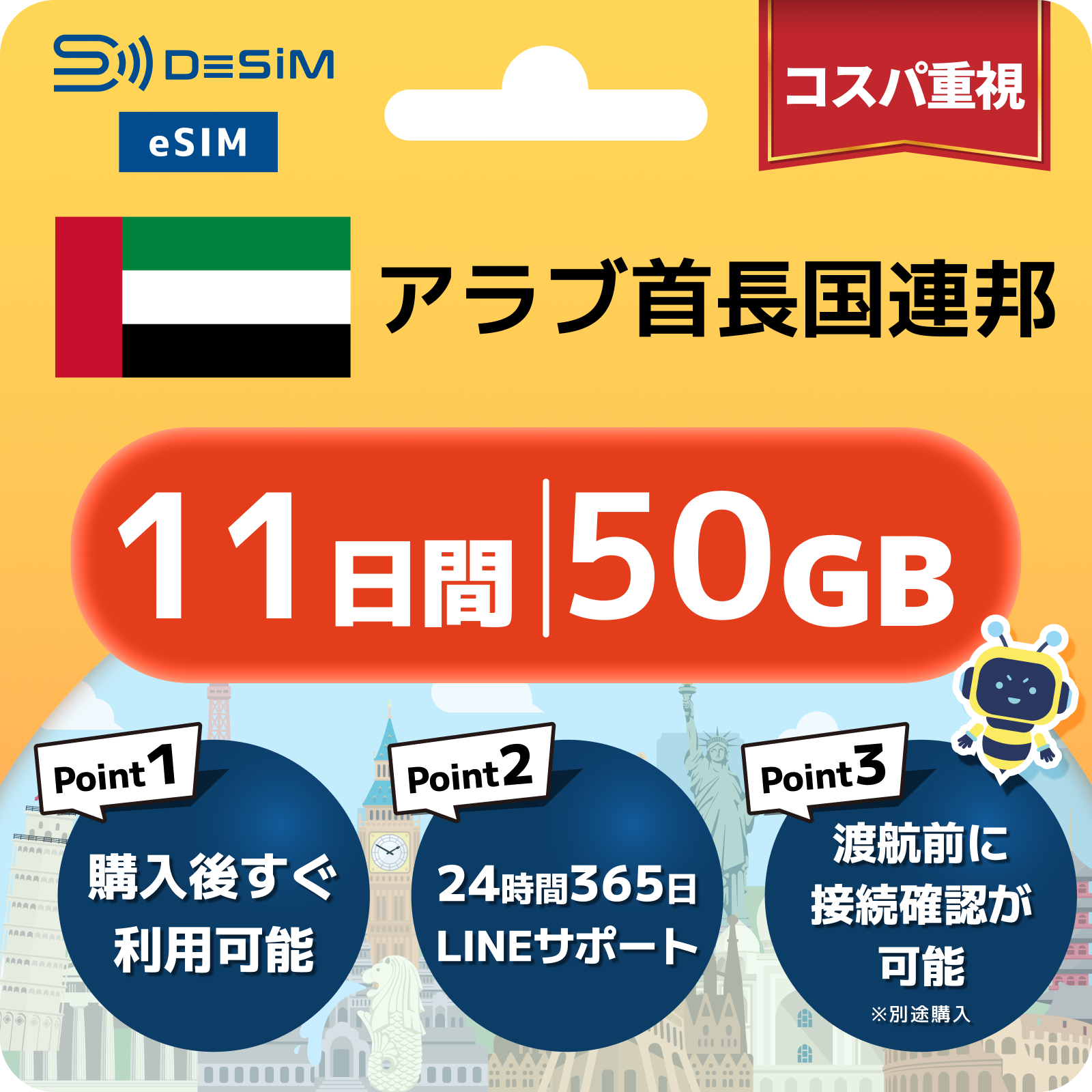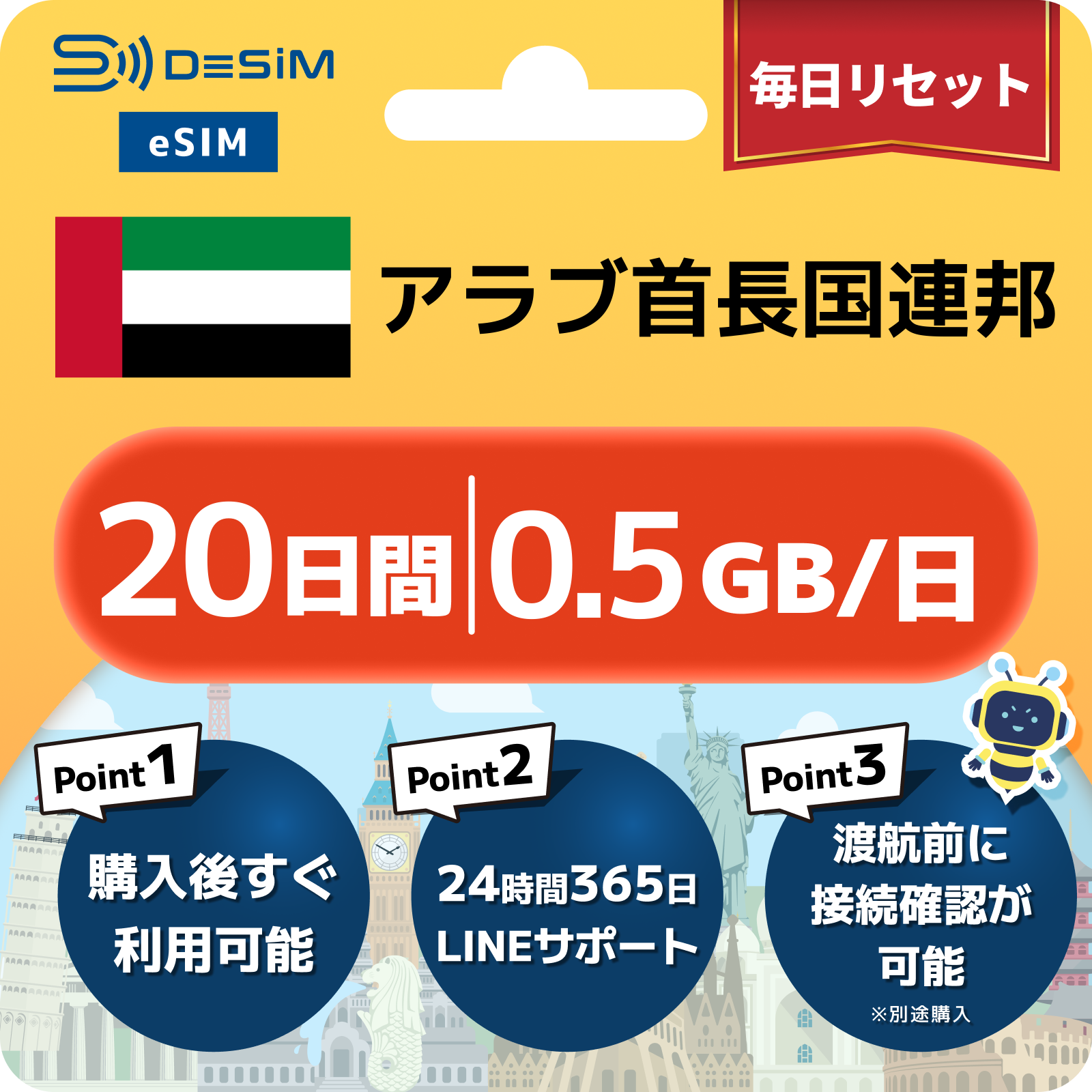 アラブ首長国連邦 eSIM(11~20日間)500MB~50GB選択可能 即日開通 テザリング対応